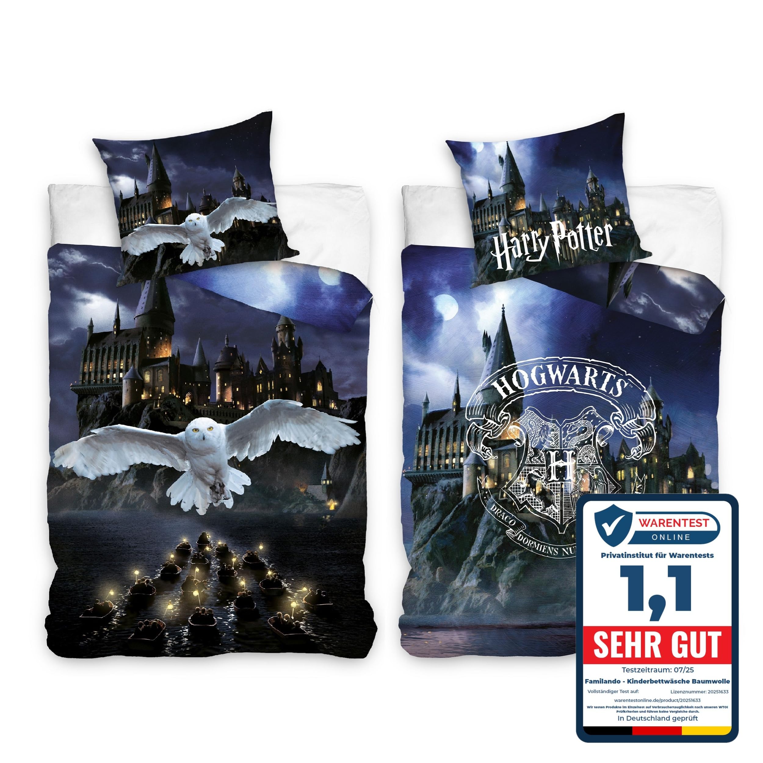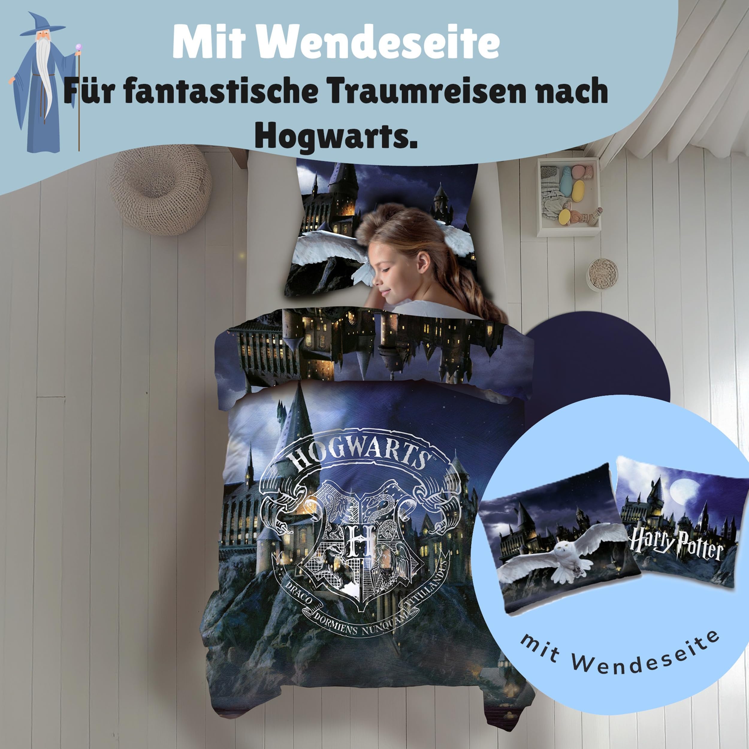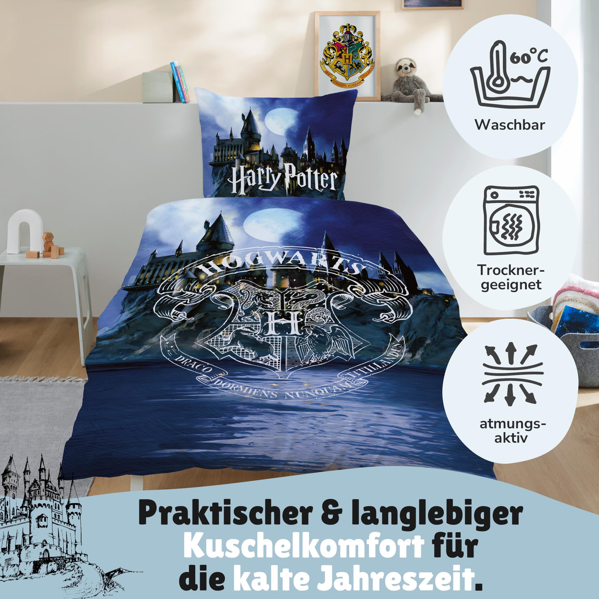 Biber/Flanell Bettwäsche-Set Harry Potter 135x200 80x80 cm · Kinderbettwäsche aus 100% Baumwolle · Motiv mit Eule Hedwig und Hogwarts Wappen · Winter-Bettwäsche zum Wenden