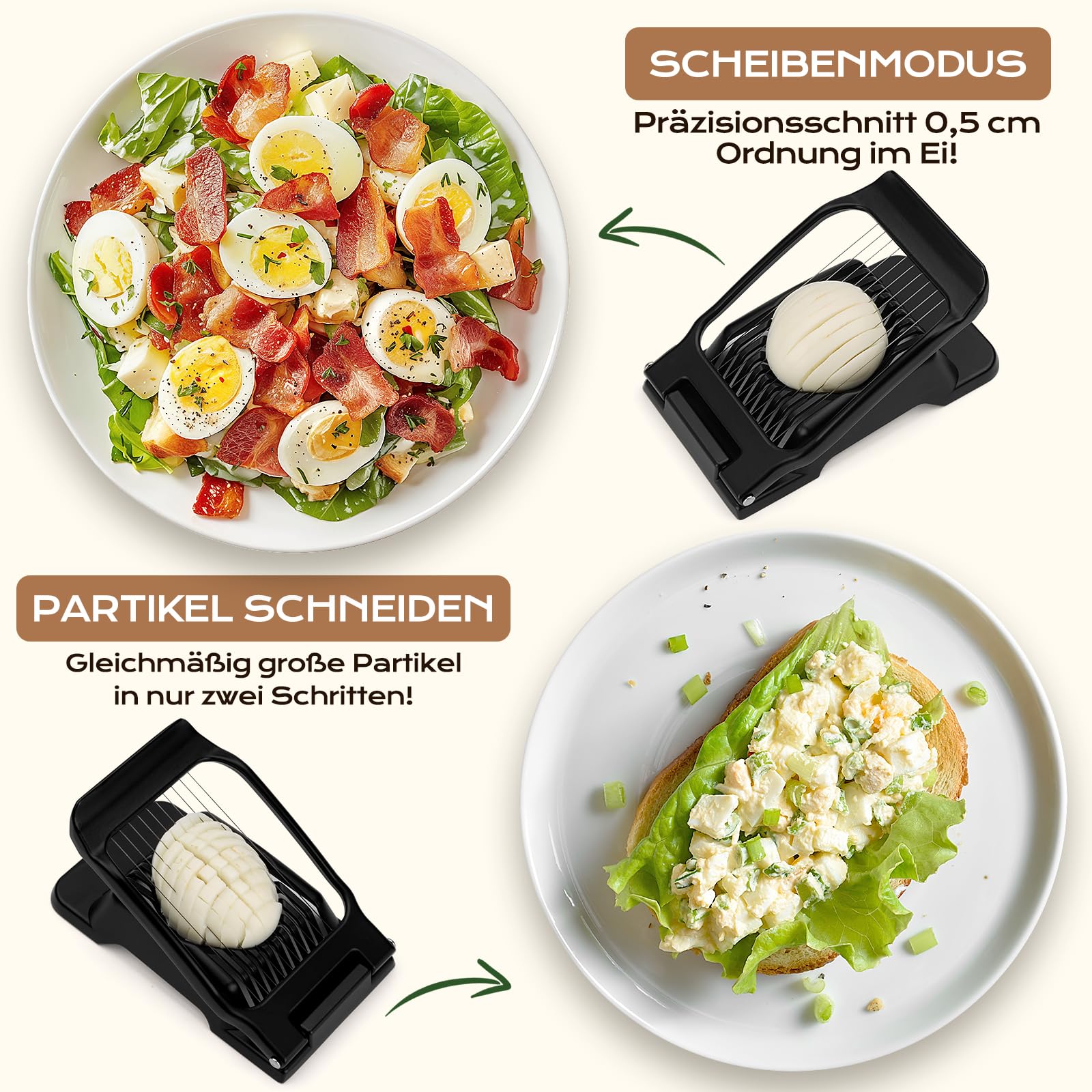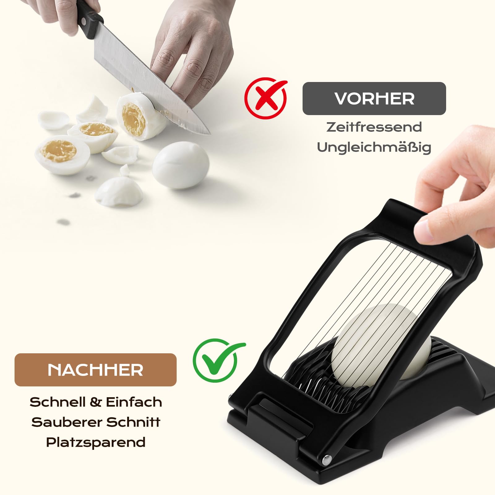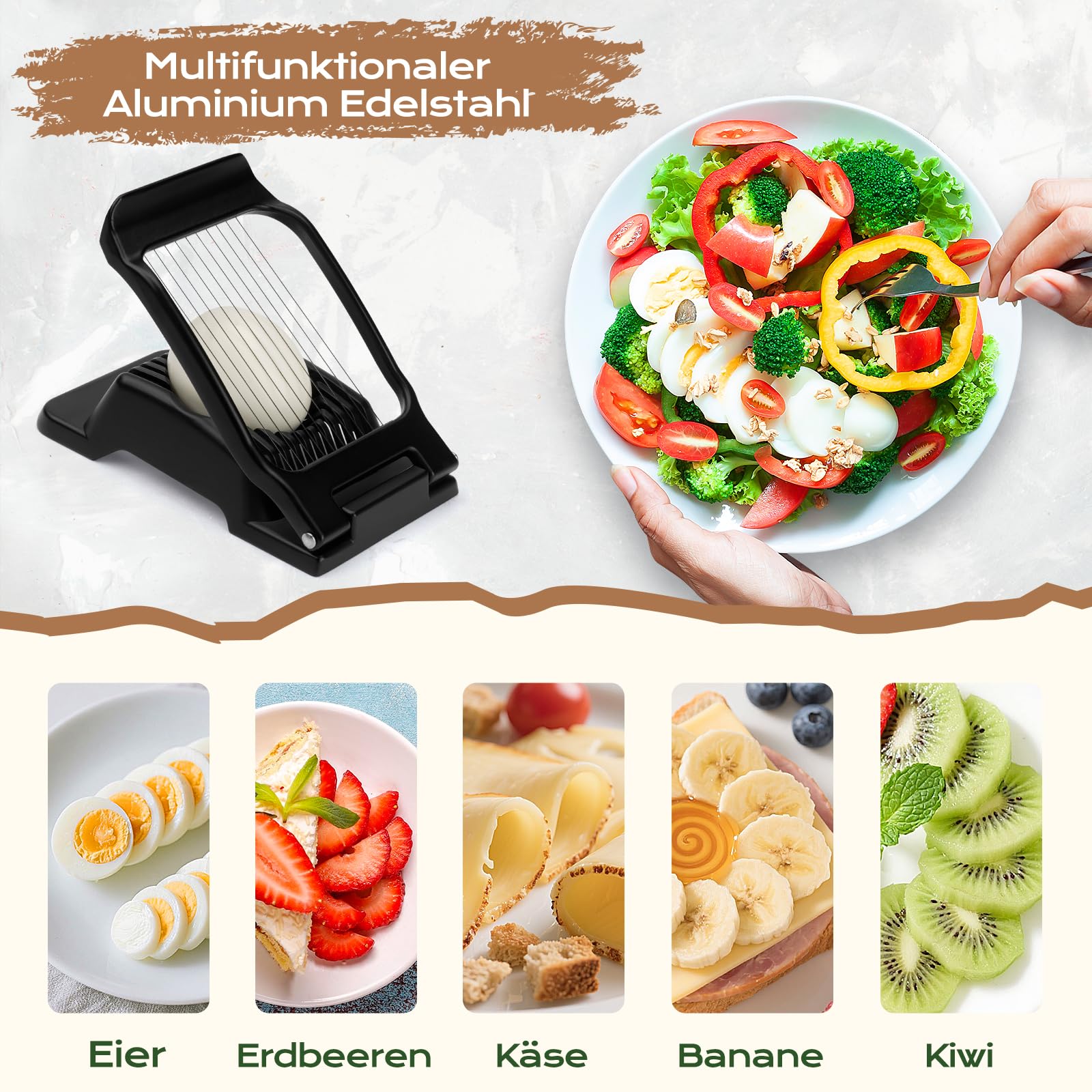 Der Eierschneider besteht aus lebensmittelechtem Aluminiumlegierungsmaterial mit gleichmässiger Dicke und schöner Form, perfekt zum Schneiden von 5 mm dünnen, gleichmässigen runden und ovalen Eierscheiben,um die Eier zu hacken, falls gewünscht. Edelstahl-Eierschneider leicht zu reinigen, eierschneider spülmaschinenfest.