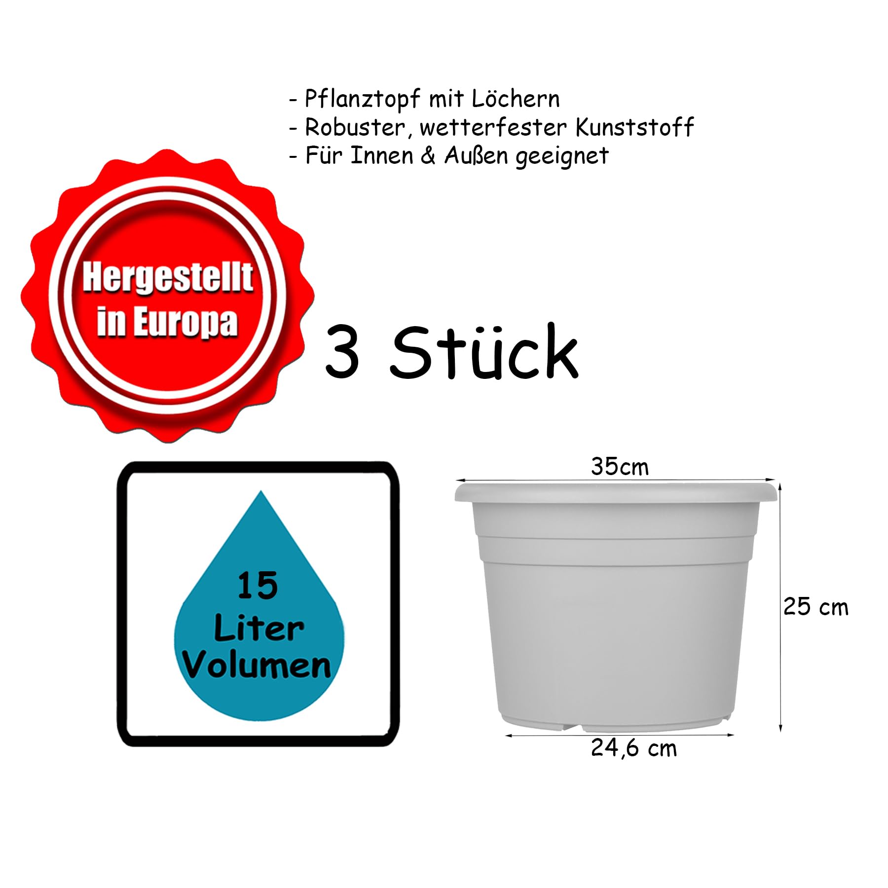3x Blumentopf 35 cm Durchmesser für Innen & Aussen aus robustem Kunststoff
