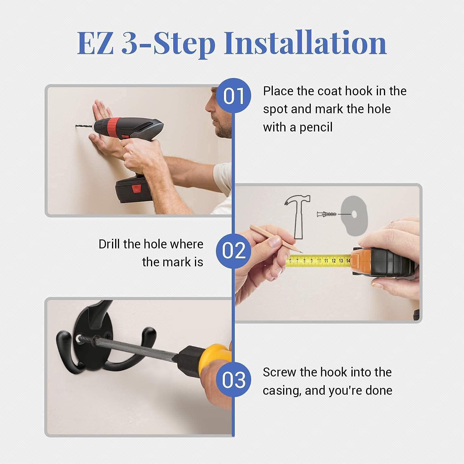 - Einfache Installation: Jeder Kleiderhaken wird mit einer Auswahl von vier verschiedenen Längen von Montageschrauben geliefert, zwei 25mm oder 1 Zoll und zwei 13mm oder 0,5 Zoll. Sie können unsere 1-Zoll-Schrauben verwenden, um die Kleiderhaken direkt an der Wand zu befestigen, und unsere 0,6-Zoll-Schrauben, wenn Sie es mit Kleiderschränken, Türen oder Holzplatten zu tun haben