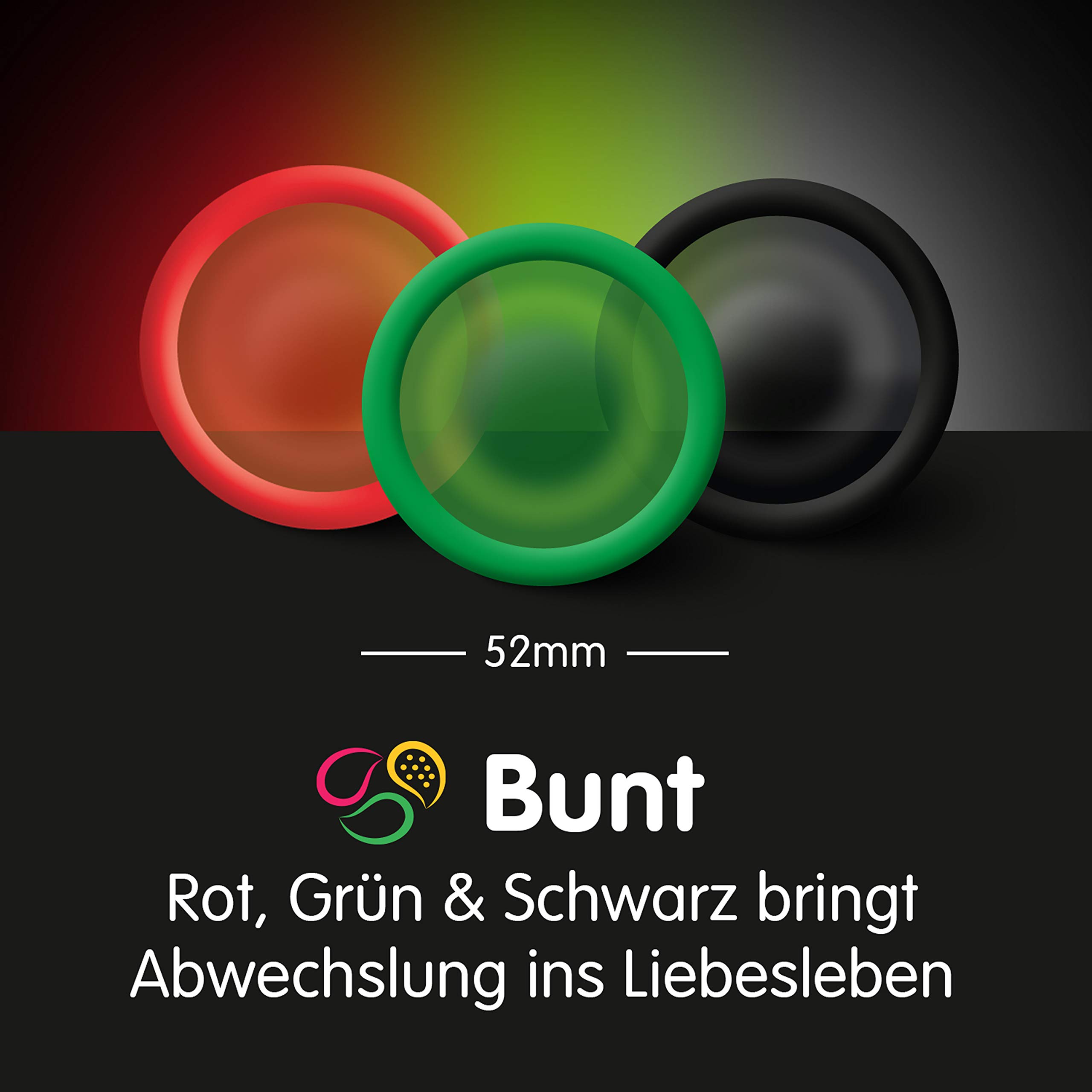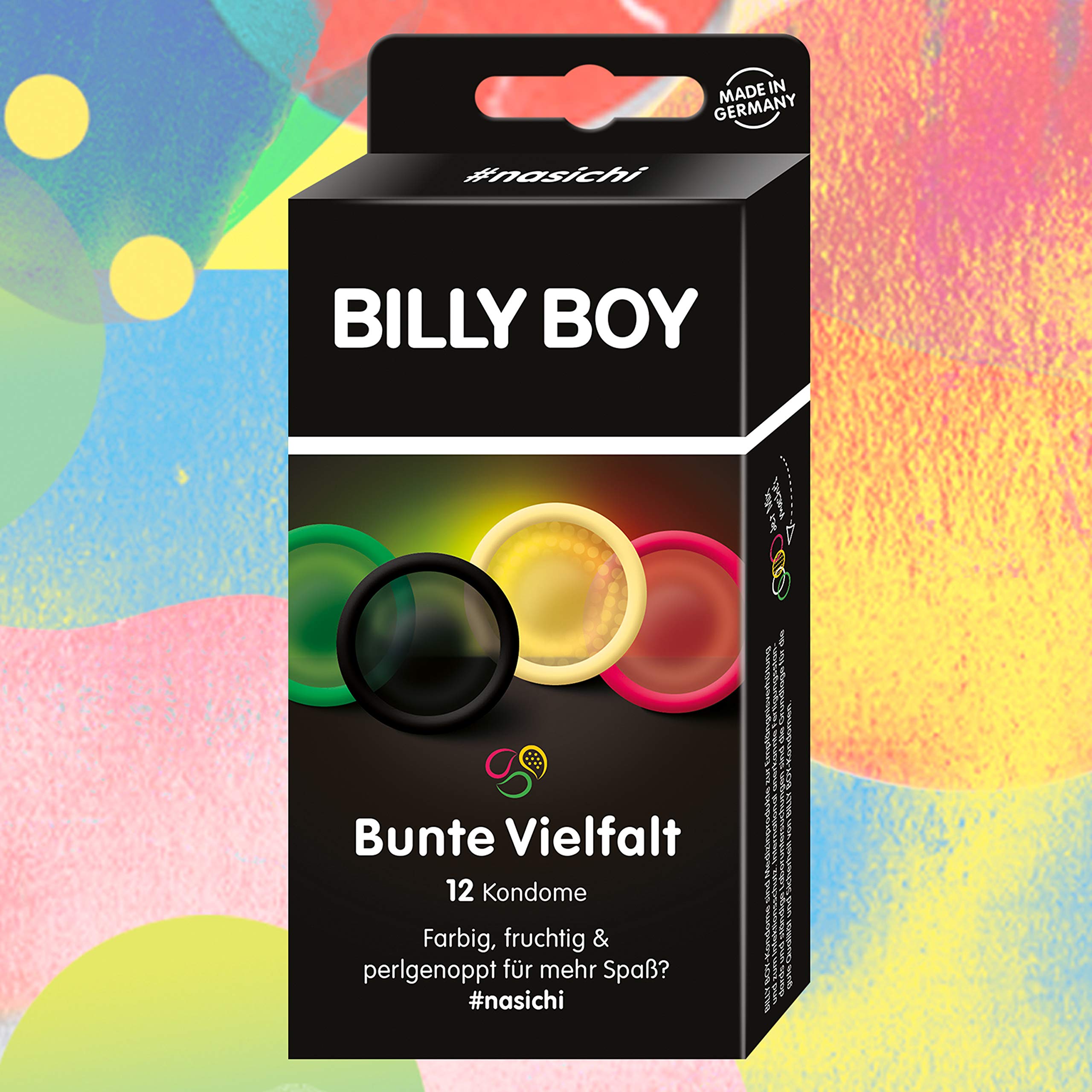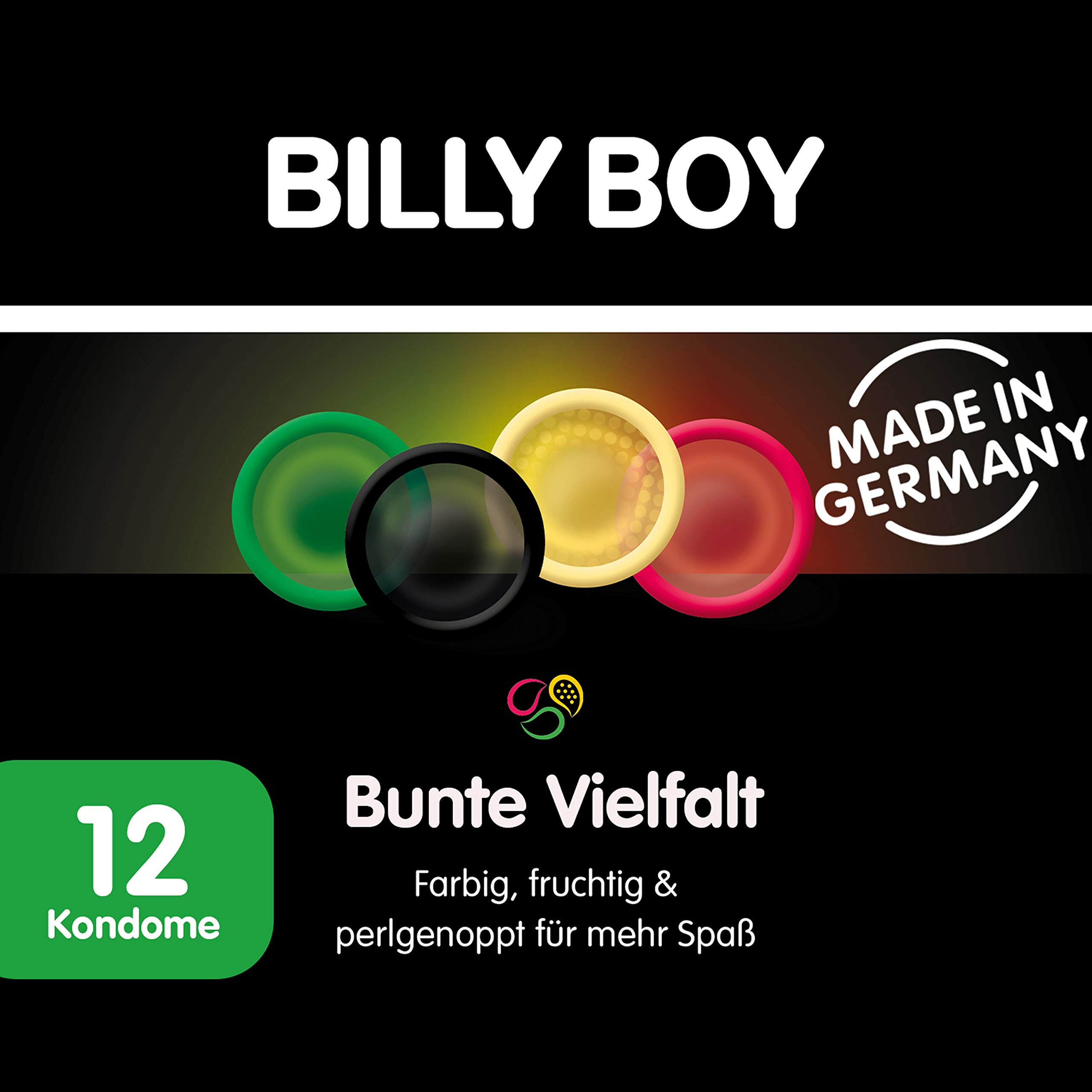 BILLY BOY Bunte Vielfalt – Kondome für mehr Spass!Der Mix macht´s! Mehr Spass durch farbige und perlgenoppte Kondome. Ob rot, grün, schwarz oder perlgenoppt– BILLY BOY Bunte Vielfalt bringt Abwechslung ins Liebesleben!Produktinformationen:12 farbige und perlgenoppte Kondome hergestellt aus Naturkautschuklatex mit Gleitfilm und Reservoirenthalten sind: je 3 rote, grüne und schwarze Kondome (alle glatt, zylindrisch)3 perlgenoppte Kondome, ca. 0,1 mm Wandstärke (transparent, zylindrisch)Breite des flachliegenden Kondoms: 52 mmhergestellt in Deutschlandjedes Kondom einzeln elektronisch geprüftentspricht EN ISO 4074Über BILLY BOY:BILLY BOY richtet sich an alle Menschen, für die das Bedürfnis nach Sexualität ein wesentlicher Bestandteil des Lebens ist. Mit BILLY BOY Kondomen kannst du die Liebe unbeschwert geniessen, denn internationale Fertigungsstandards und ständige Laboruntersuchungen schaffen die hohe Qualität und Sicherheit aller BILLY BOY Kondome. Alle BILLY BOY Latex-Kondome sind „Made in Germany“ und einzeln elektronisch geprüft.Mit dem vielfältigen Sortiment aus Kondomen, Gleitgelen sowie verschiedenen Toys bietet BILLY BOY alles was dich anmacht.