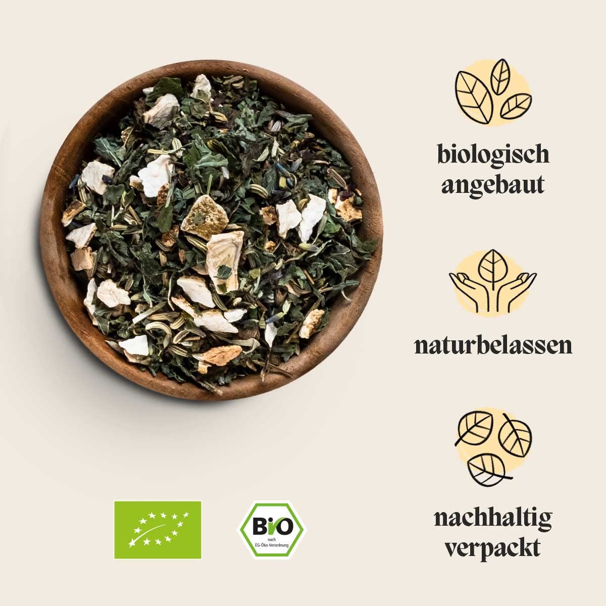 BIO Abendtee | Loser Kräuter-Tee für deine Auszeit am Abend | Natürlicher Melissentee mit Baldrian, Lavendel und Passionsblume | 200g loser Bio Tee | teegeschwister