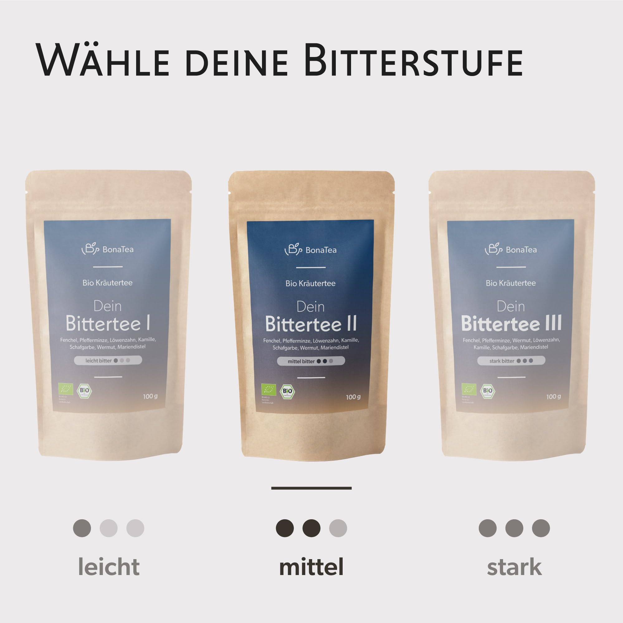 • INTENSITÄTEN: Die Intensität des Bittertees gibt an, in welcher Stärke bittere Kräuter enthalten sind. Stufe 1 ist perfekt für Einsteiger, während Stufe 2 und 3 deutlich bitterer sind und für Fortgeschrittene empfohlen wird.