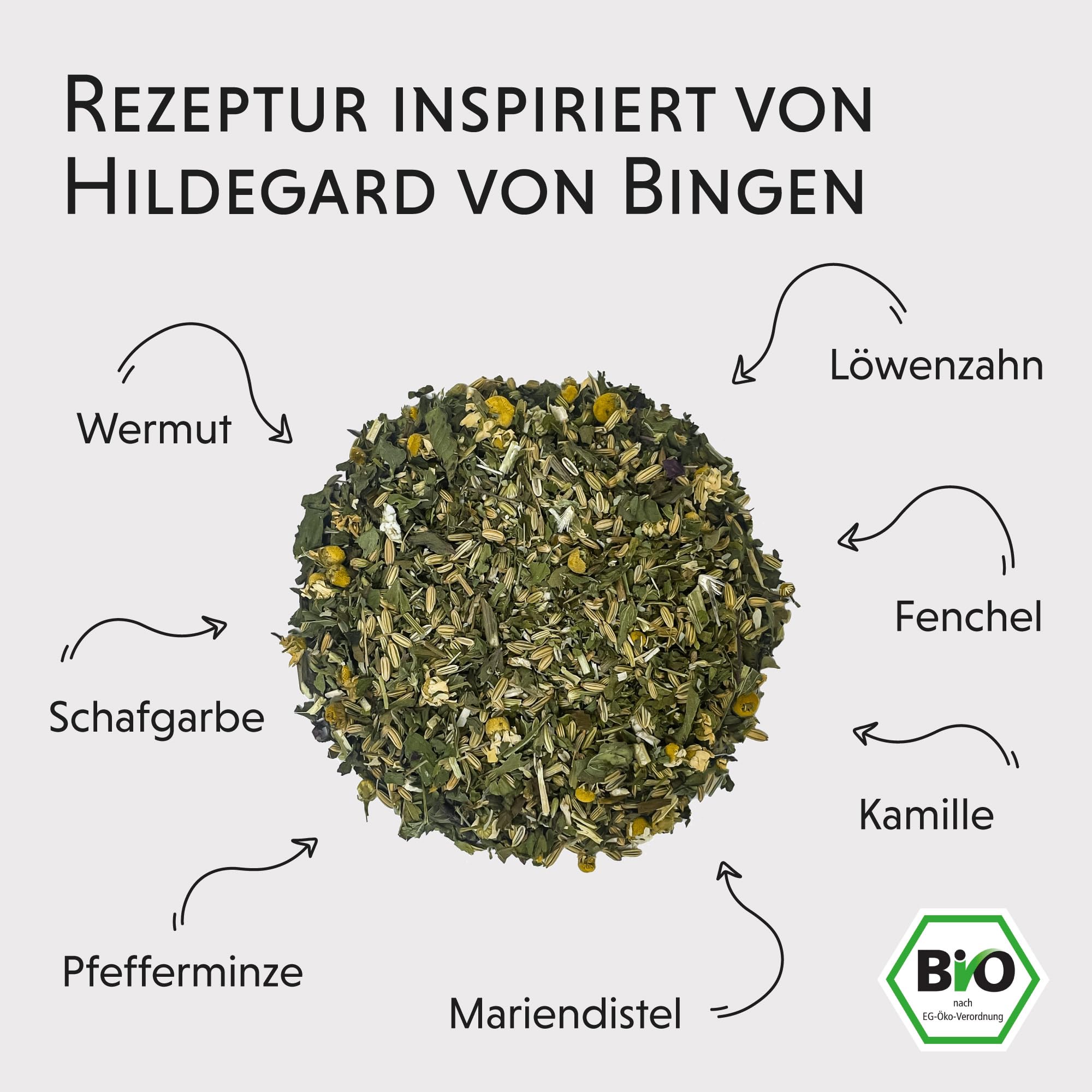 • KEINE VERSTECKTEN ZUTATEN: Fenchel, Pfefferminzblätter, Löwenzahn, Kamille, Schafgarbe, Wermut, Mariendistel - 100 g loser Bio Kräutertee ohne Aromastoffe und ohne weitere Zusätze inspiriert von Hildegard von Bingen.