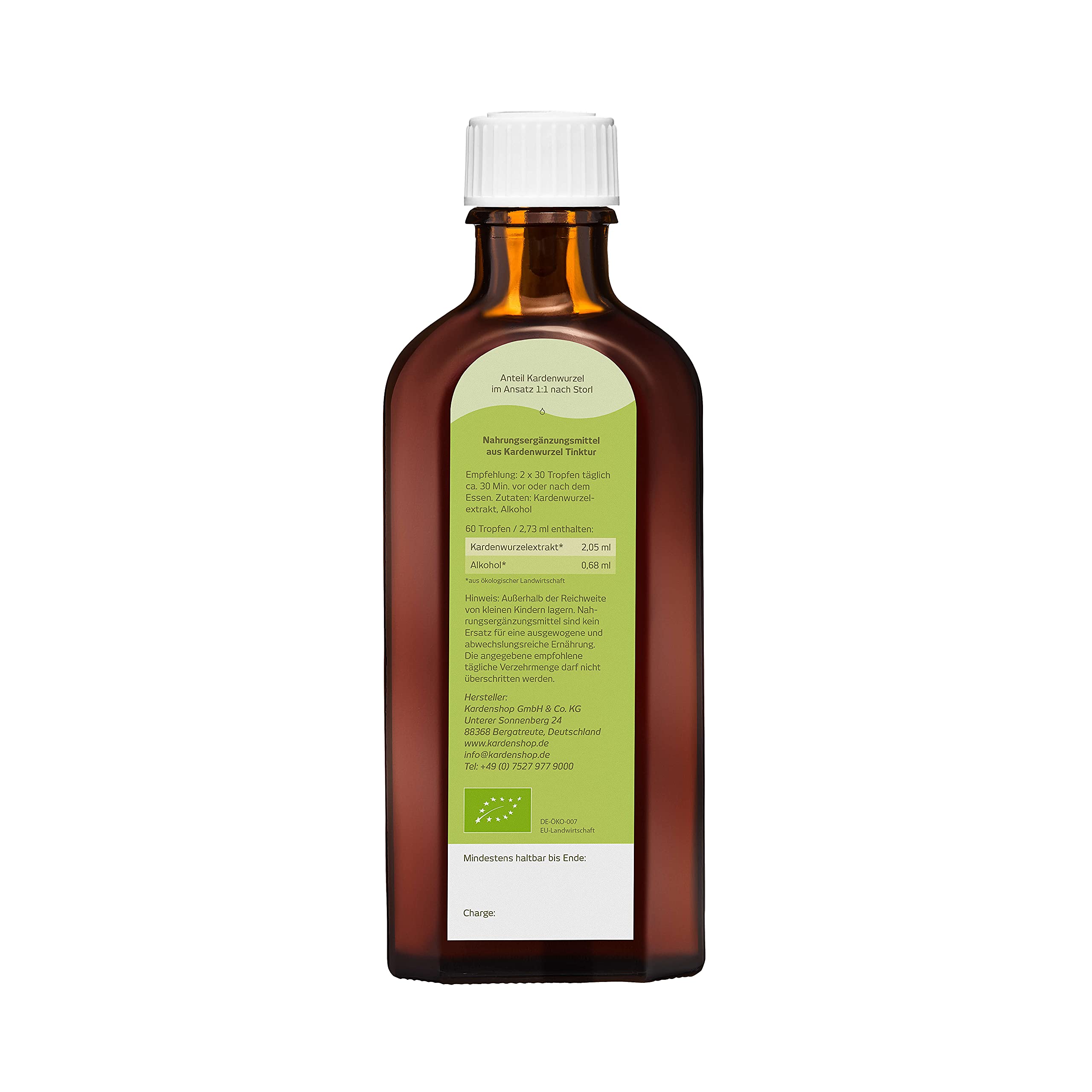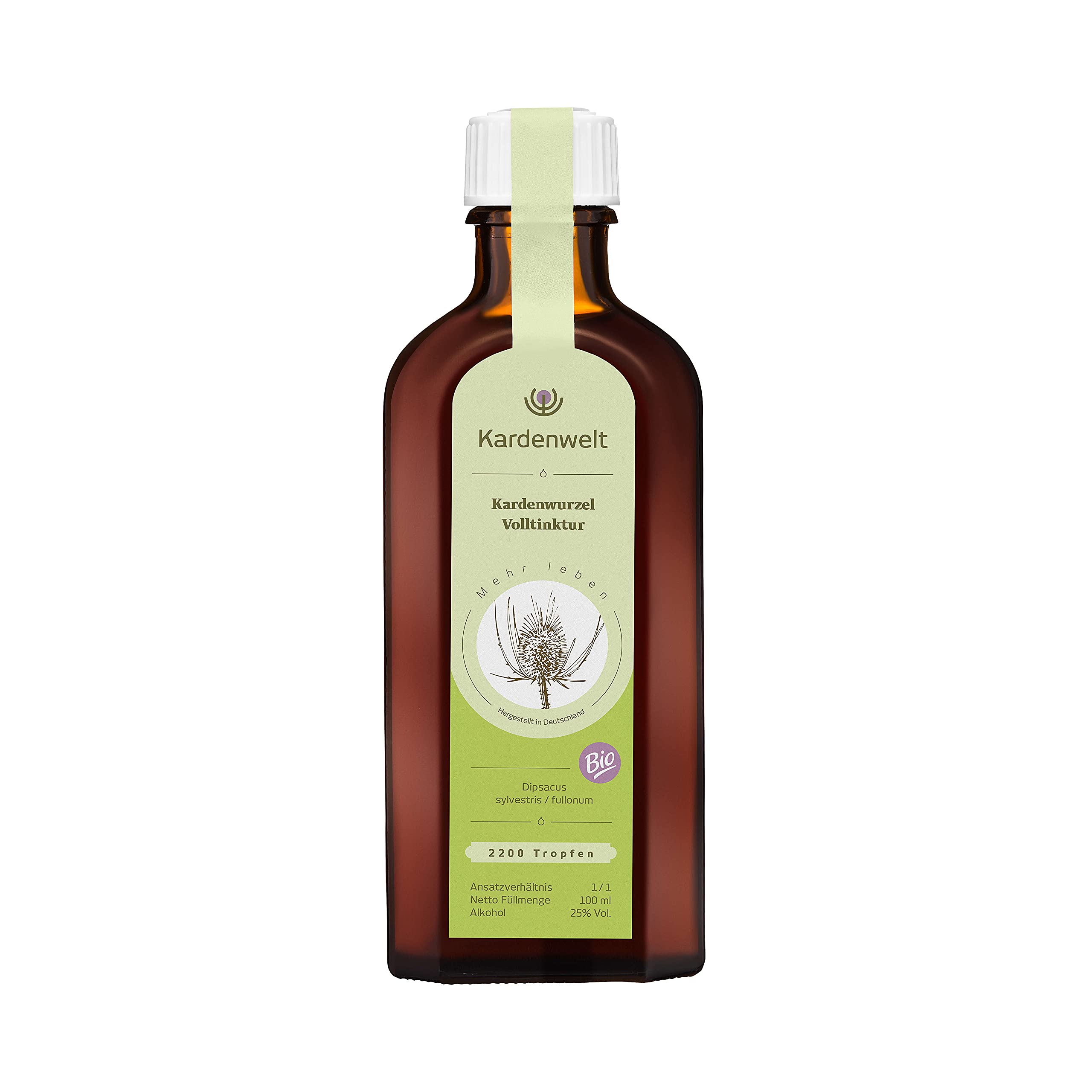 Traditionell werden Pflanzenauszüge im Mazerationsverfahren hergestellt. Dabei wird die frisch geerntete, einjährige Wurzel der Wilden Karde sehr klein geschnitten und in ein Gefäss gefüllt bis der obere Rand erreicht ist. Danach wird alkoholische Trägerflüssigkeit – ebenfalls bis zum oberen Rand – zugegeben und das Gefäss verschlossen drei Wochen „mazeriert“.Der Bio-Alkohol löst in dieser Zeit die benötigten Stoffe aus der Wurzel. Weil dabei Pflanze und Flüssigkeit in gleichen Volumenanteilen verwendet werden, spricht Herr Storl von einer Volltinktur im Ansatzverhältnis von 1:1. Dieses starke Verhältnis und der zertifizierte BIO-Anbau zeigen die besondere Qualität unserer Kardentinktur. Als Premiumanbieter werden wir im Sinne unserer Kunden niemals anders angesetzte Auszüge akzeptieren. Anders ausgedrückt: Wo Karde draufsteht, ist auch Karde drin.Lagerung: Idealerweise bei normaler Raumtemperatur. Vor direkter Sonneneinstrahlung schützen.Anwendungsvorschlag zum Einstieg (benötigt 200ml Volltinktur nach Storl): Erste Woche: 2 x 5 Tropfen/Tag Ab der zweiten Woche: 2 x 30 Tropfen/Tag Einnahmedauer: Sechs Wochen oder längerPräventive Gabe über einen unbegrenzten Zeitraum: 10 Tropfen / Tag solange wie benötigtSie können sich mit der Wilden Karde nicht schaden, daher ist die Dauer der Einnahme unbegrenzt. Durchschnittlich nehmen unsere Kunden über ein halbes Jahr 2 x 30 Tropfen/Tag. Die Tropfen können – pur oder in einem Glas Wasser – jeweils eine halbe Stunde vor oder nach den Mahlzeiten (z. B. Frühstück und Abendbrot) eingenommen werden.Bio-Zertifizierung: DE-ÖKO-007 EU-/Nicht-EU-Landwirtschaft