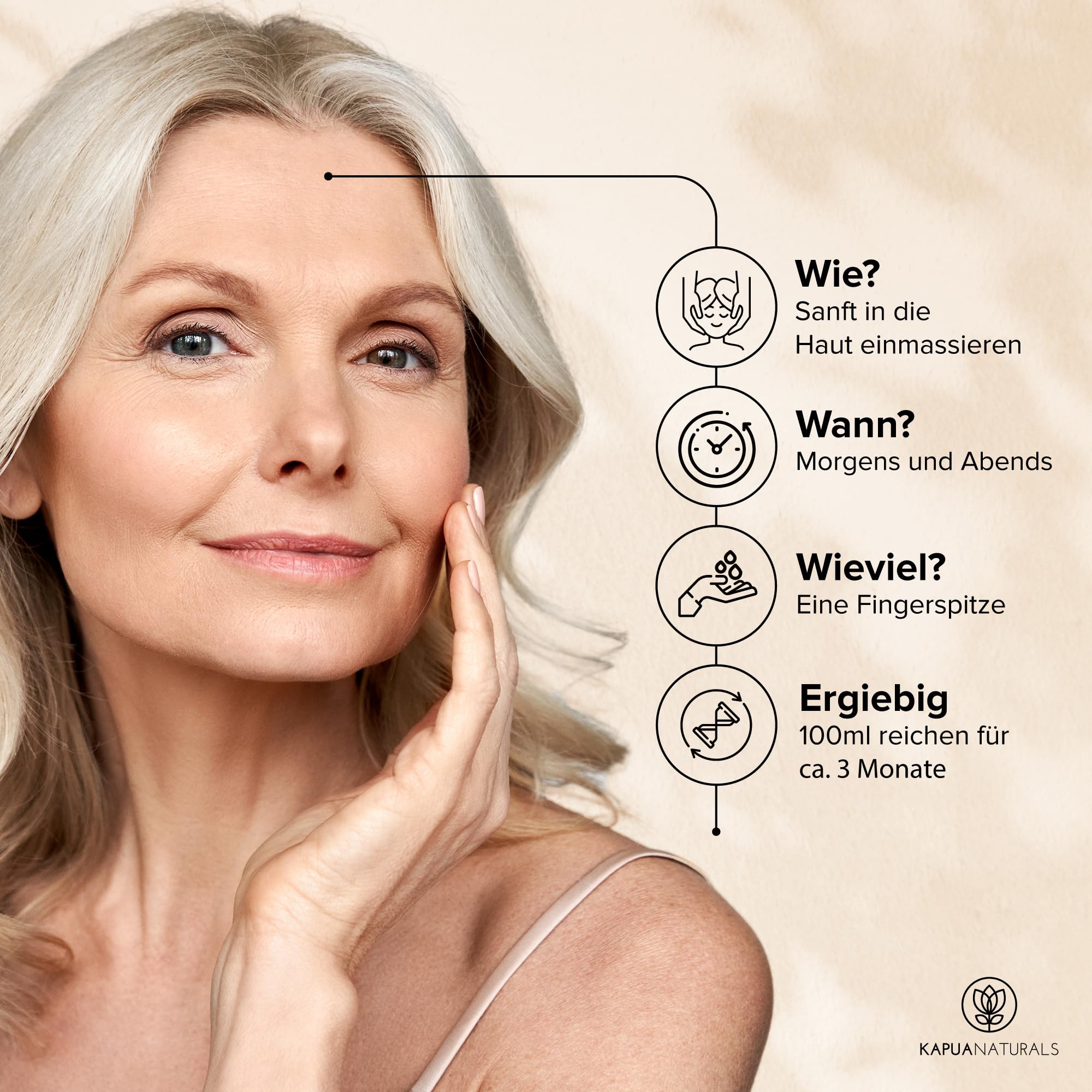 - Hyaluronsäure: Polstert Falten und feine Linien sofort von innen auf und sorgt für pralle, glatte Haut.