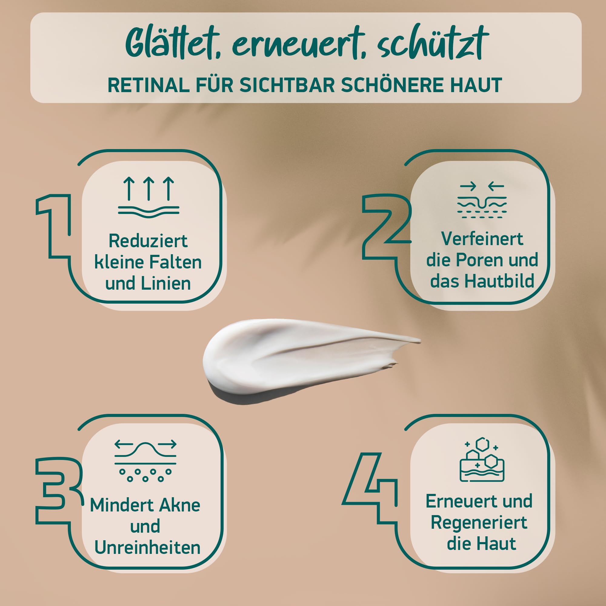 - Gegen Unreinheiten & grosse Poren: Retinal wirkt effektiv gegen Akne und verstopfte Poren, reguliert die Talgproduktion und verfeinert das Hautbild sichtbar.