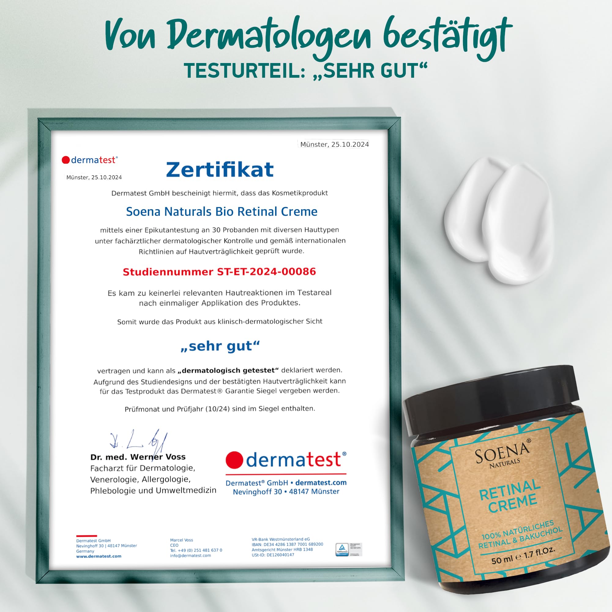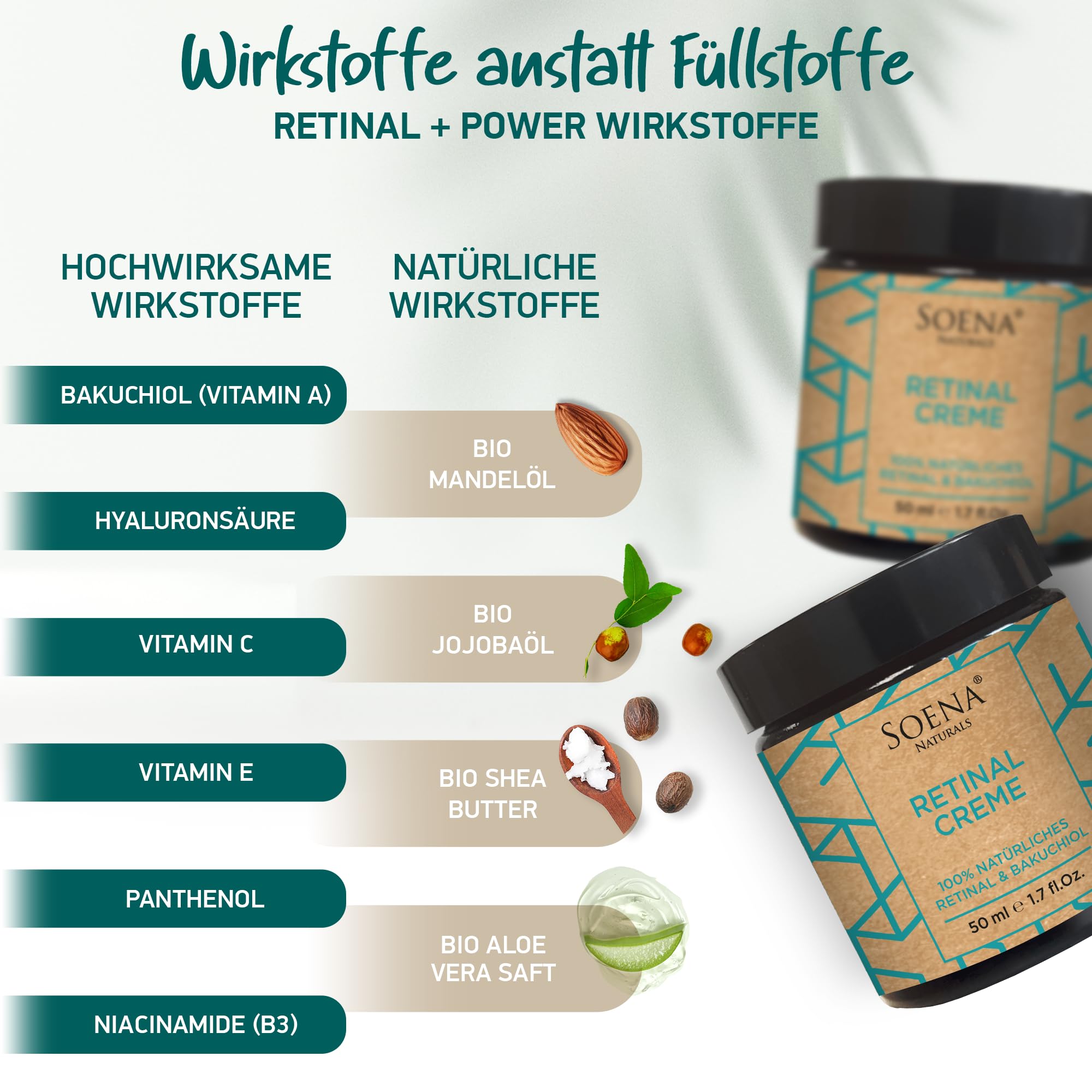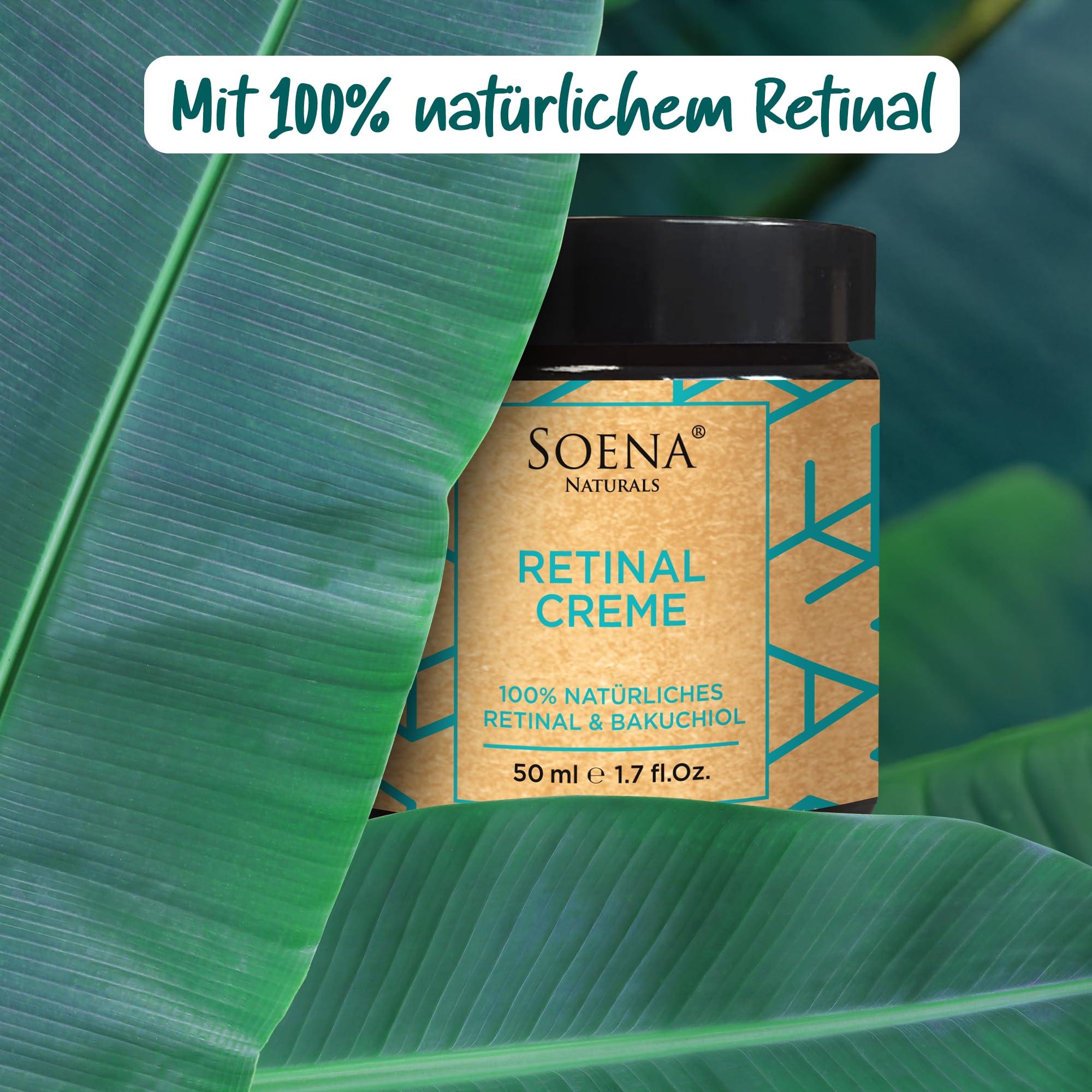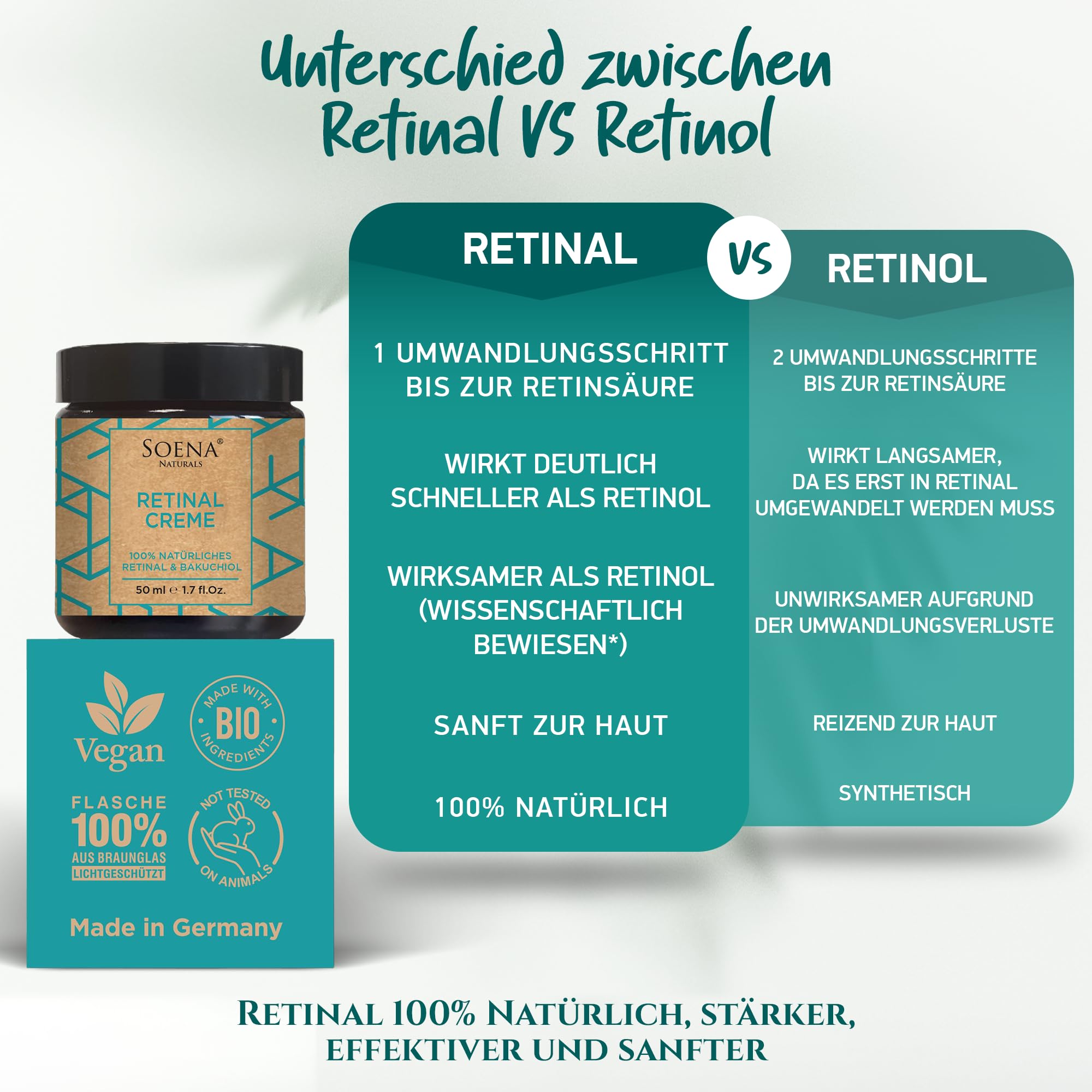 Soena BIO Retinol & Retinal Creme Hochdosiert – Mit Bakuchiol, Vitamin C, E & Hyaluron – Anti-Aging Gesichtscreme gegen Falten, Akne & grosse Poren