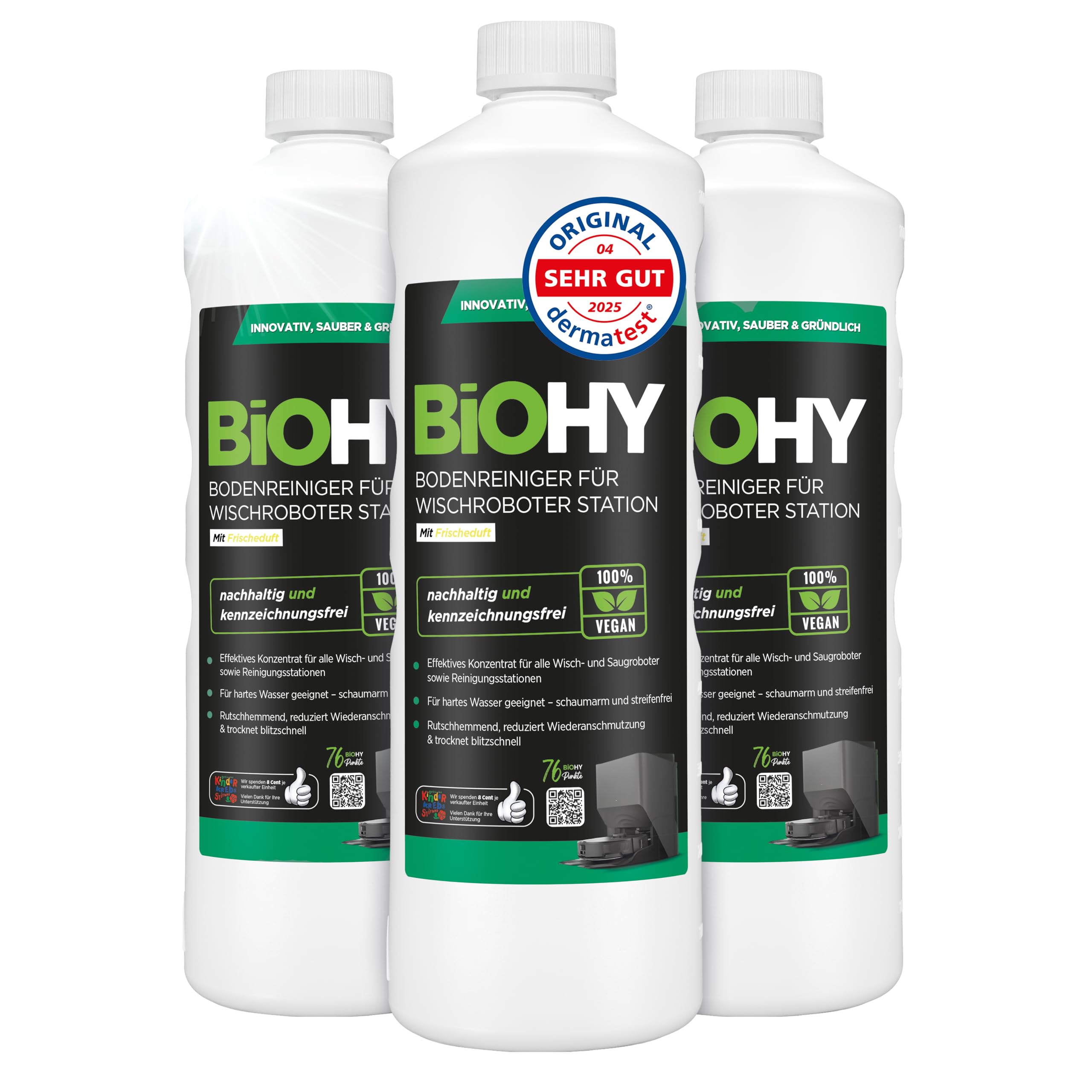 BiOHY Bodenreiniger für Wischroboter Station mit Frischeduft (3 x 1 Liter) | Reinigungsmittel Konzentrat für alle Wisch & Saugroboter mit Nass-Funktion | Schaumarm & Streifenfrei | Für alle Böden