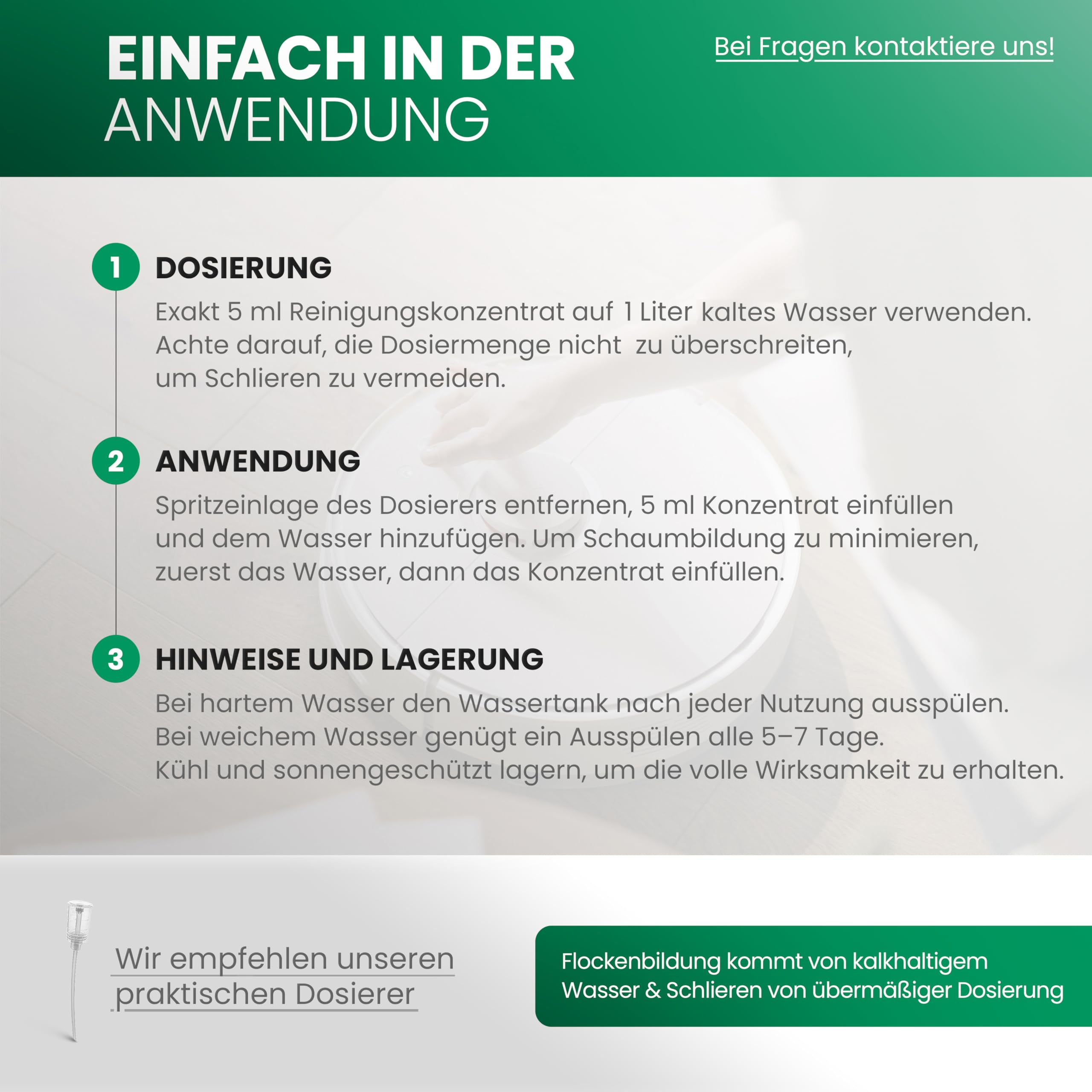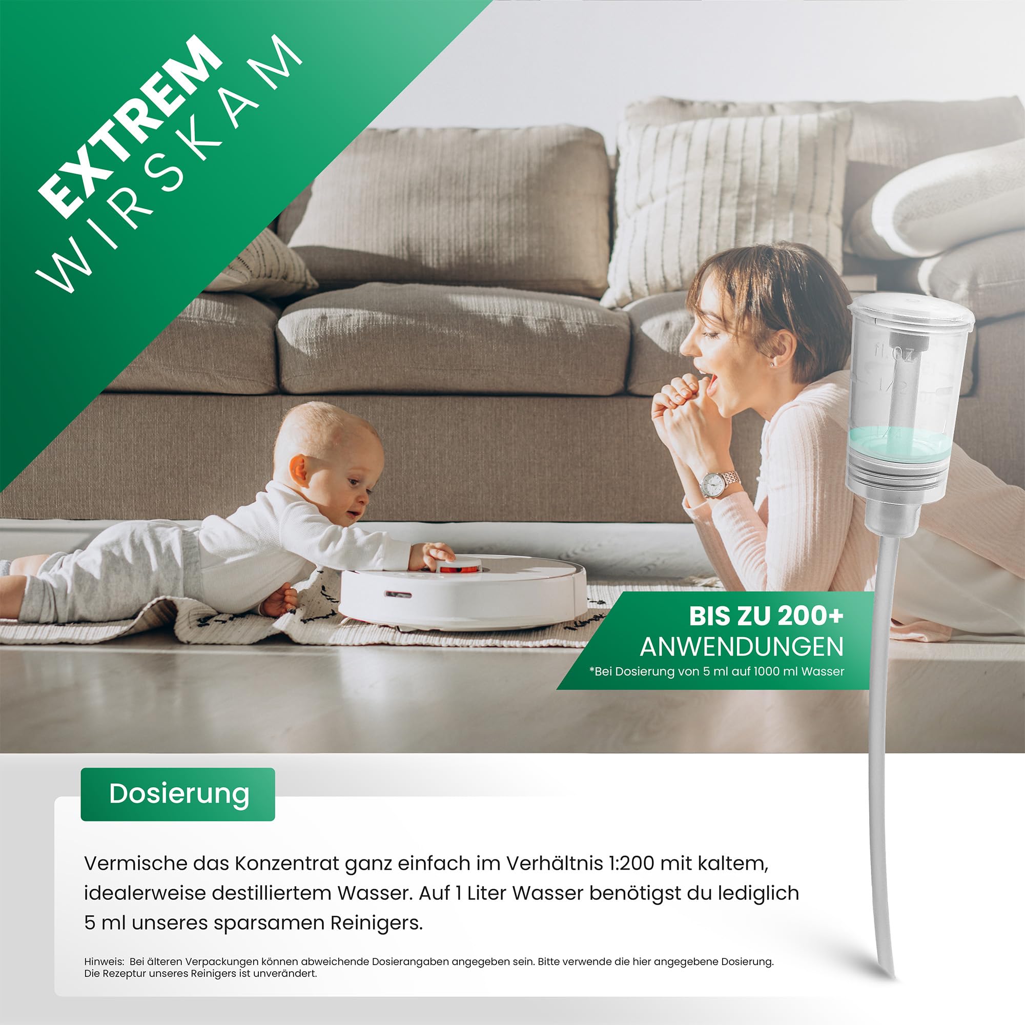 • ???? NATÜRLICH MATERIALSCHONEND: Hochergiebiges 1:200 Reinigungskonzentrat für Vinyl, Fliesen, Laminat, Parkett, PVC & Linoleum. Reinigt gründlich, schützt Oberflächen und verhindert dank korrekter Dosierung Ablagerungen im Gerät – für langfristigen Schutz und eine dauerhaft optimale Reinigungsleistung Ihres Wischroboters.