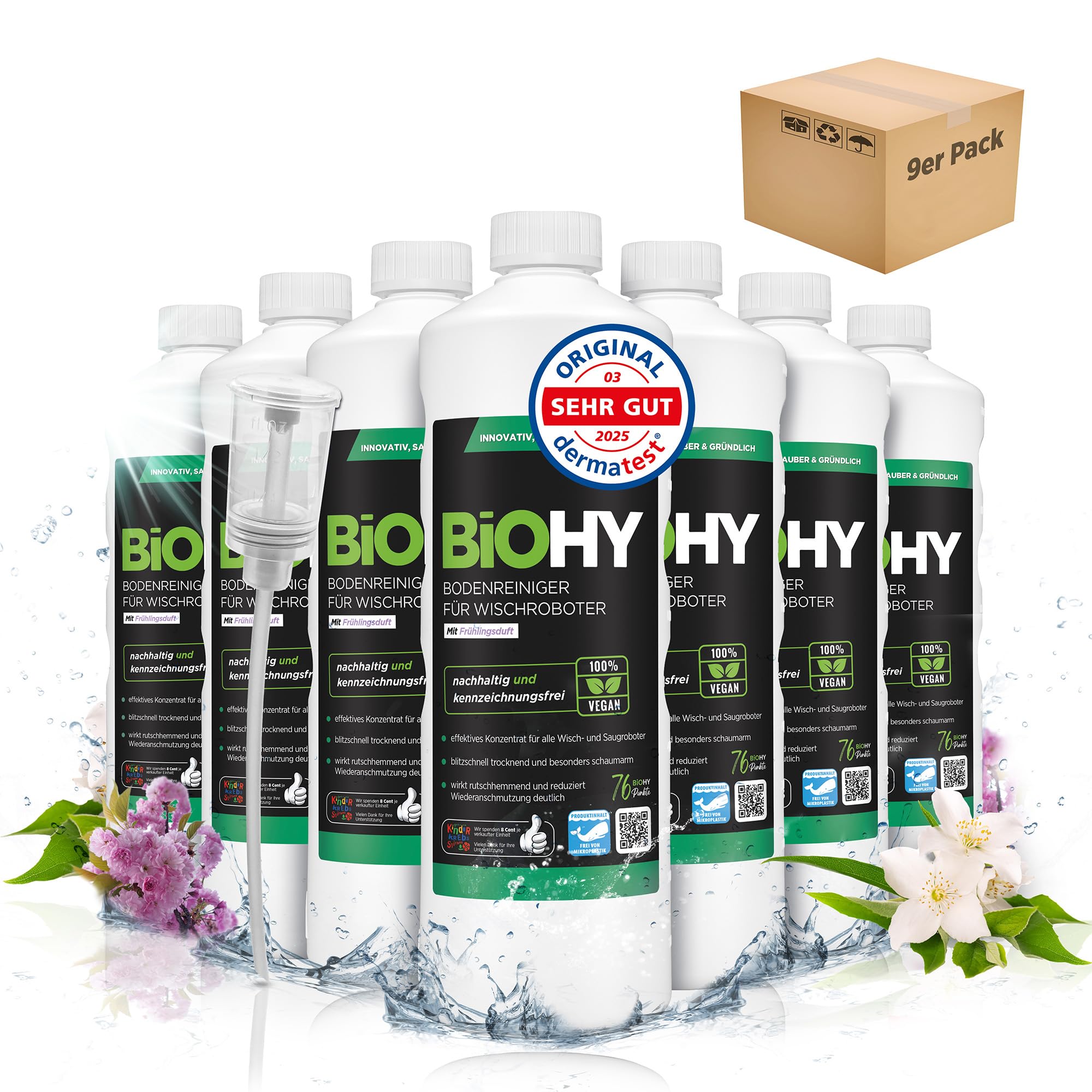 BiOHY Bodenreiniger für alle Wischroboter mit Frühlingsduft (9 x 1 Liter) + Dosierer | Schaumarm & Streifenfrei | Reinigungsmittel Konzentrat für alle Böden
