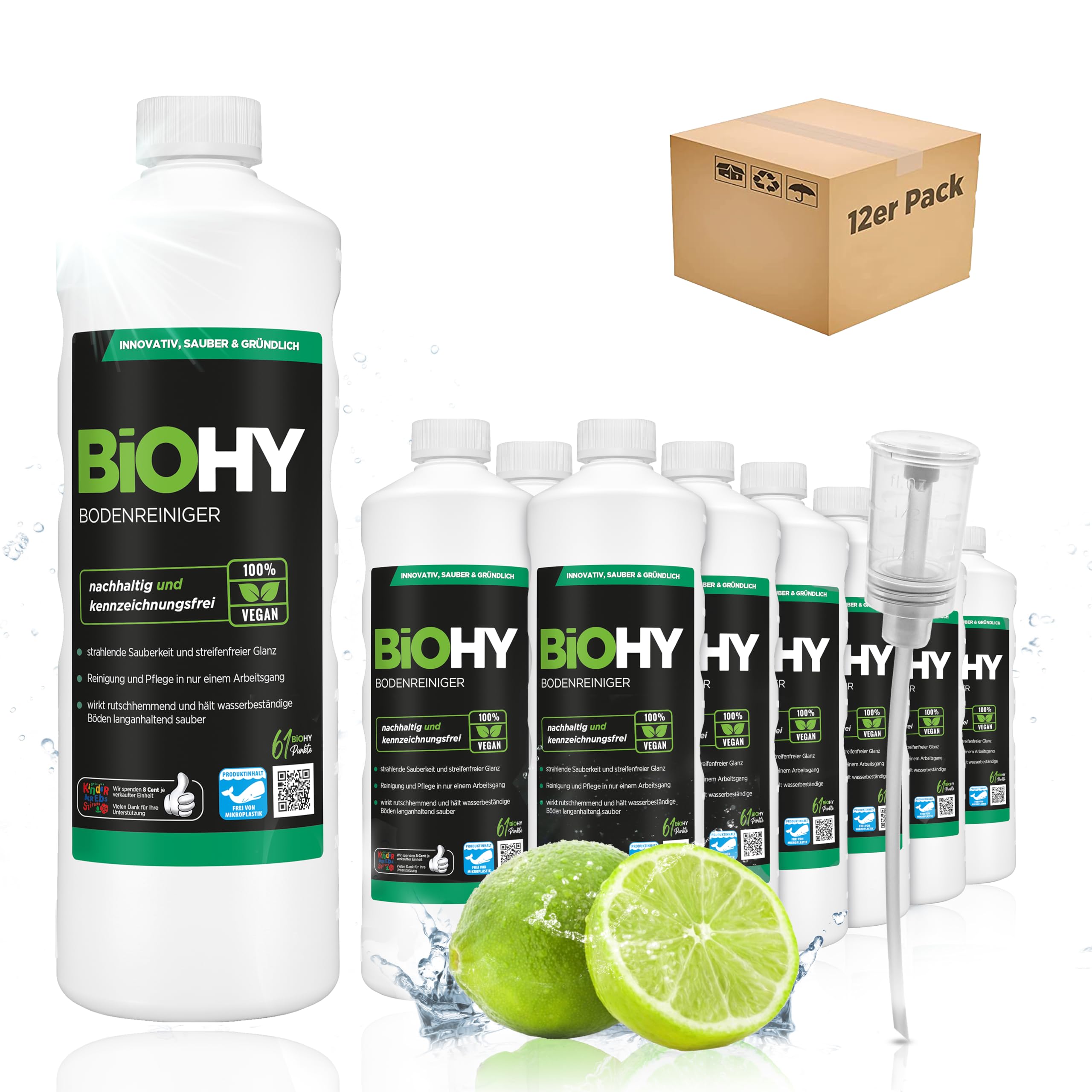BiOHY Bodenreiniger (12 x 1 Liter) + Dosierer | Konzentrat für alle Reinigungsgeräte und alle Hartböden | angenehmer Geruch und streifenfreie Reinigung | ideal für Laminat, PVC & Stein