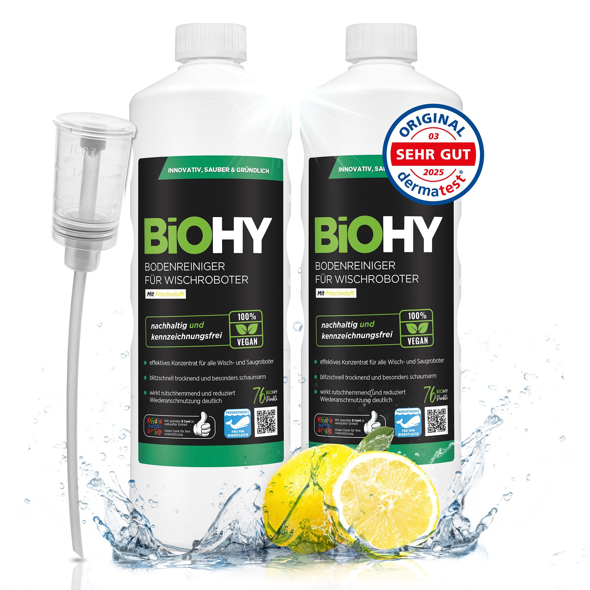 BiOHY Bodenreiniger für Wischroboter (2 x 1 liter) + Dosierer | Reinigungsmittel Konzentrat für alle Wisch & Saugroboter mit Nass-Funktion | Schaumarm & Streifenfrei | Für alle Böden