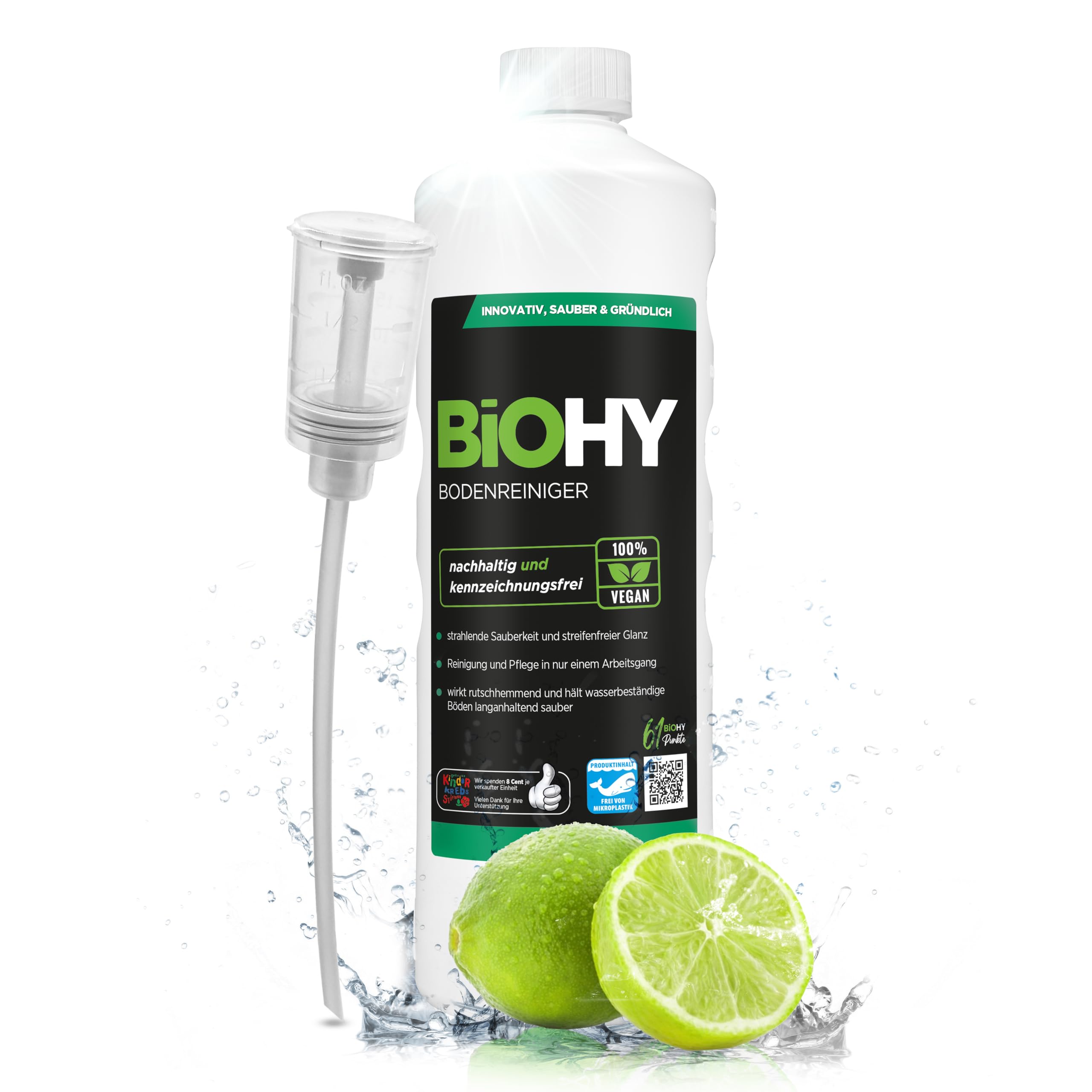 BiOHY Bodenreiniger (1l Flasche) + Dosierer | Konzentrat für alle Reinigungsgeräte und alle Hartböden | angenehmer Geruch und streifenfreie Reinigung | ideal für Laminat, PVC & Stein