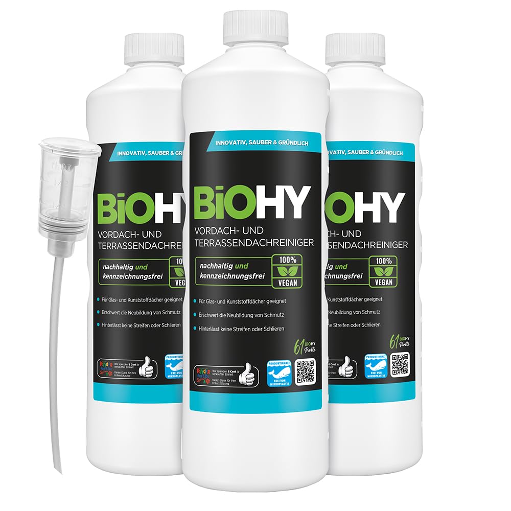 BiOHY Vordach- und Terrassenreiniger (3 x 1 Liter) + Dosierer | Bio Konzentrat für Glasdächer, Kunststoffdächer, Wintergärten | Nachhaltige Reinigung & Pflege | Hohe Wirksamkeit und strahlender Glanz