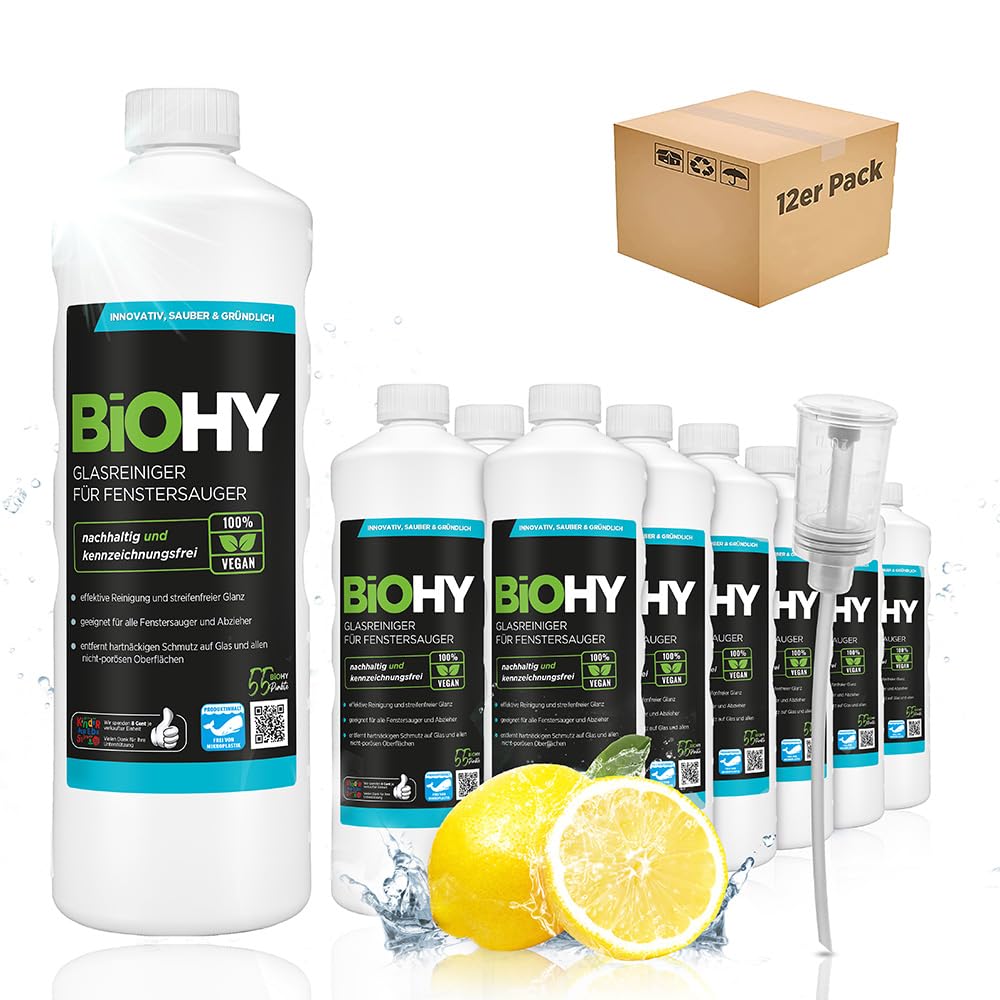 BiOHY Glasreiniger für Fenstersauger (12 x 1 Liter) + Dosierer | Fensterreiniger Konzentrat für alle Fenstersauger | Bio Reinigungsmittel sorgt für streifenfreien Glanz | Glasreiniger