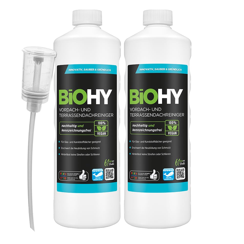 BiOHY Vordach- und Terrassenreiniger (2 x 1 liter) + Dosierer | Bio Konzentrat für Glasdächer, Kunststoffdächer, Wintergärten | Nachhaltige Reinigung & Pflege | Hohe Wirksamkeit und strahlender Glanz
