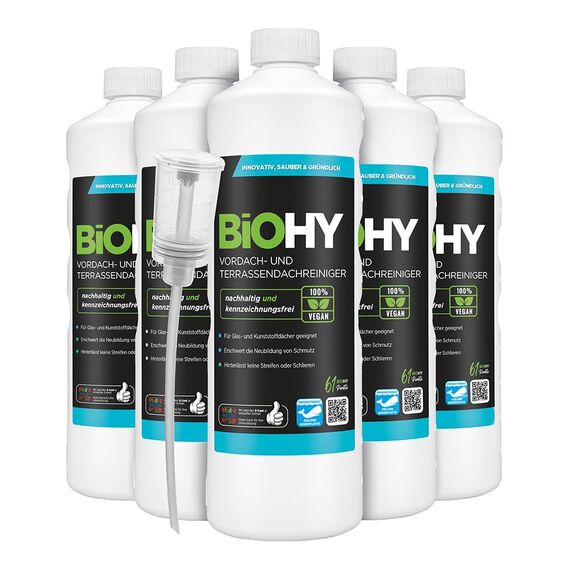 BiOHY Vordach- und Terrassenreiniger (6 x 1 Liter) + Dosierer | Bio Konzentrat für Glasdächer, Kunststoffdächer, Wintergärten | Nachhaltige Reinigung & Pflege | Hohe Wirksamkeit und strahlender Glanz