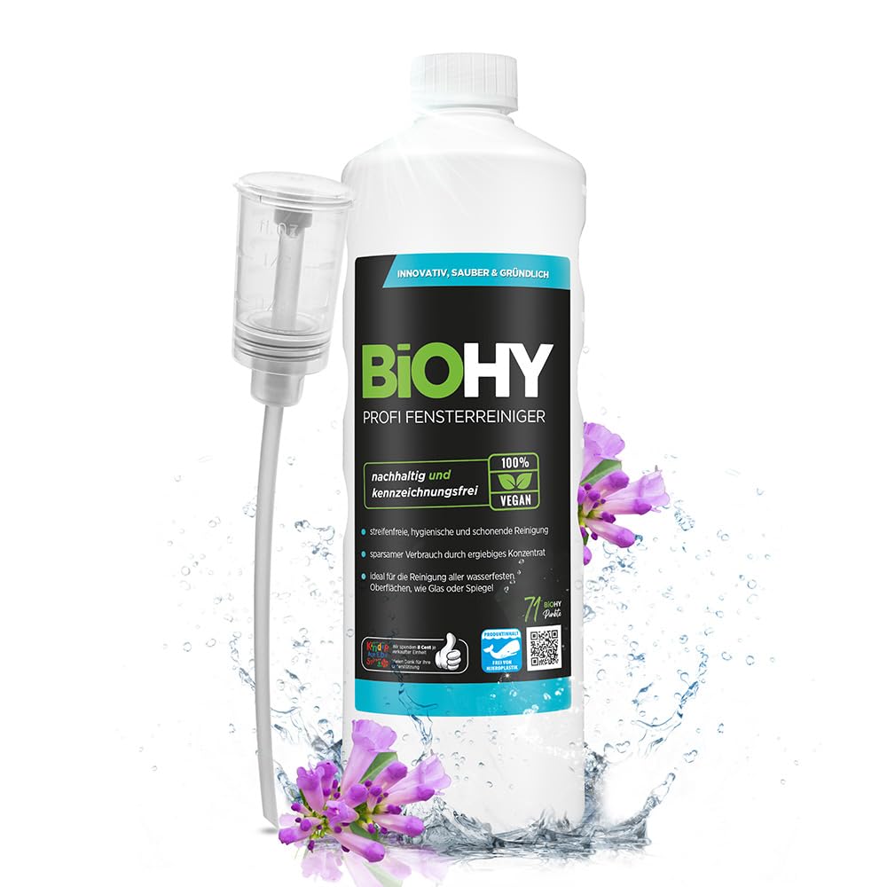 BiOHY Profi Fensterreiniger (1l Flasche) + Dosierer | Glasreiniger Konzentrat | für Fenstersauger geeignet | streifenfreie Reinigung von Glas-, Fenster- & Spiegelflächen | ideal für Haushalt & Auto