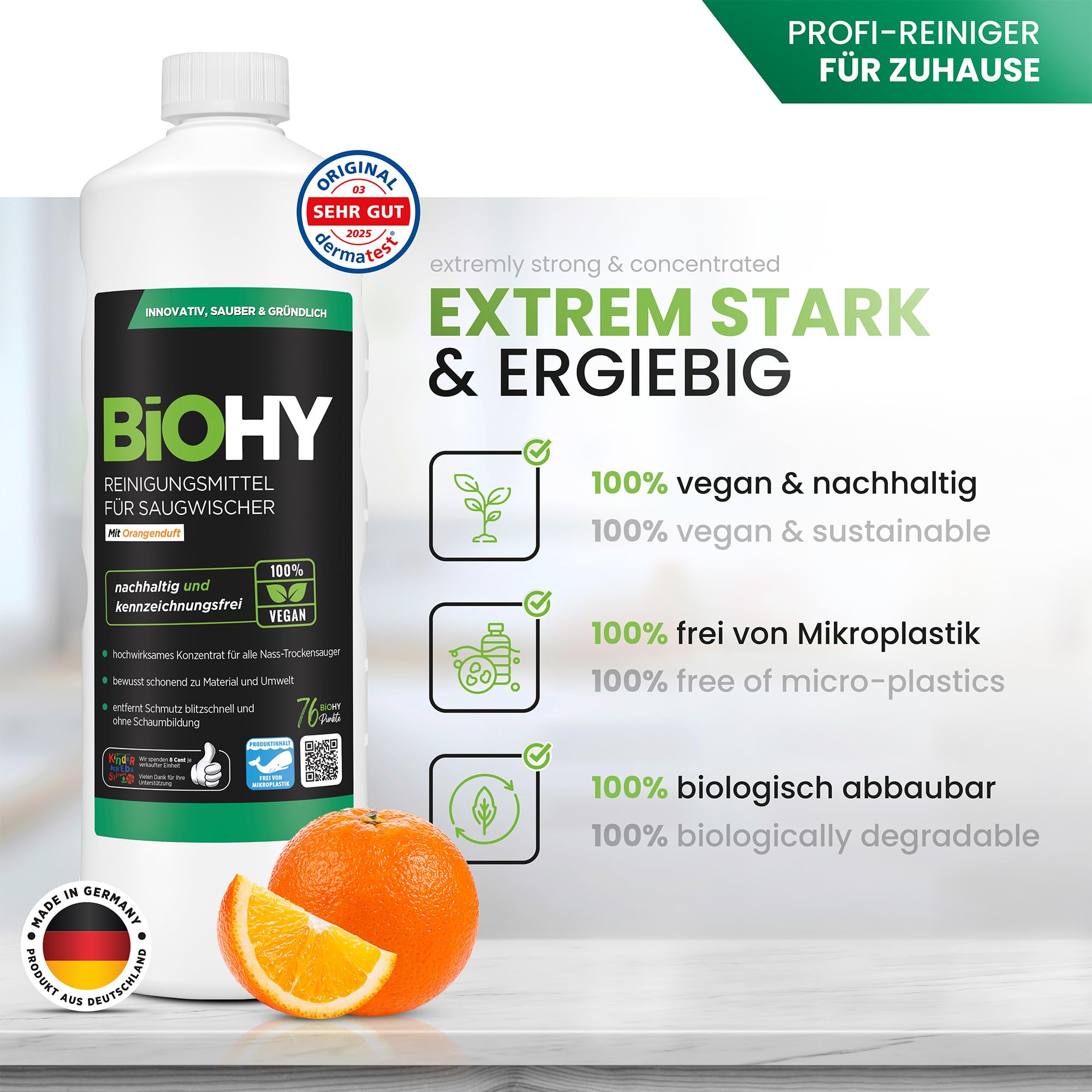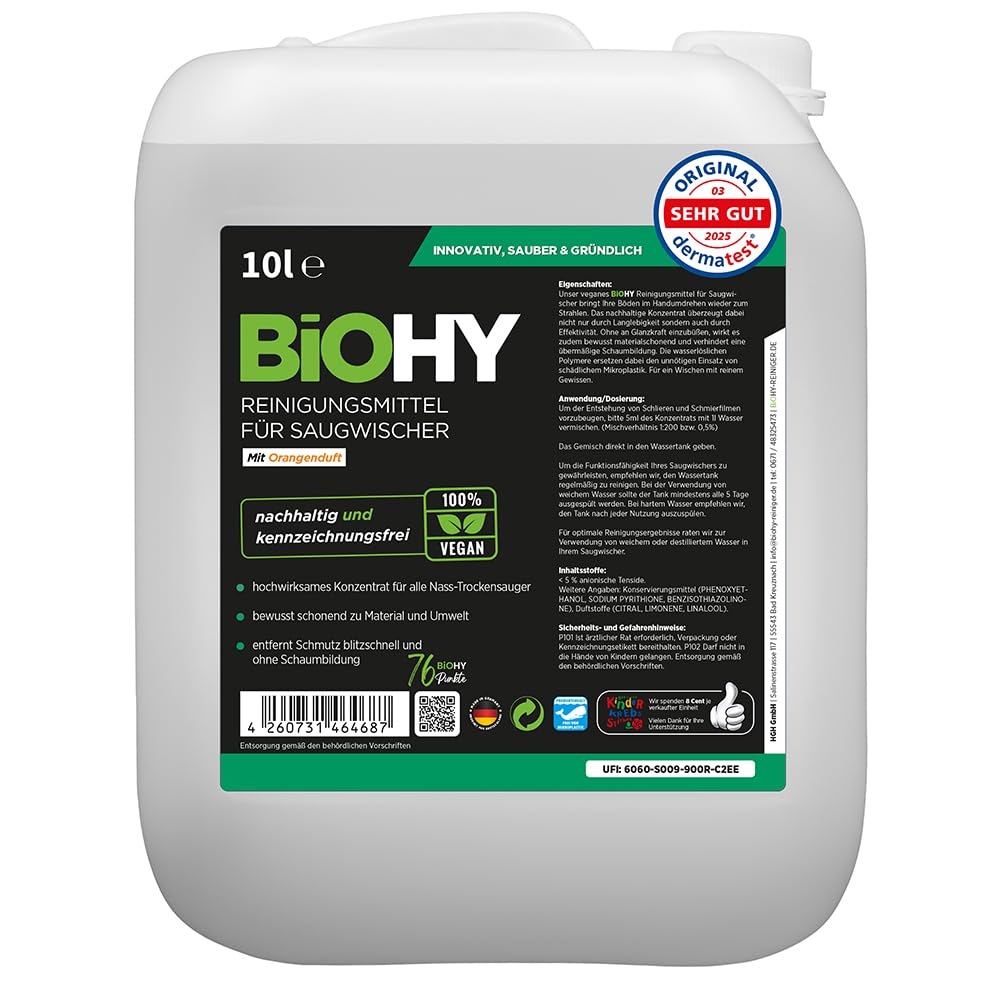• ???? NATÜRLICH SAUBER: Das BiOHY Reinigungsmittel für Saugwischer entfernt Schmutz, Fett & Alltagsspuren mühelos und sorgt für streifenfreie Frische auf allen Hartböden. Die schaumarme Profi-Formel eignet sich ideal für alle Saugwischer, Nass-Trockensauger & Bodenreiniger.