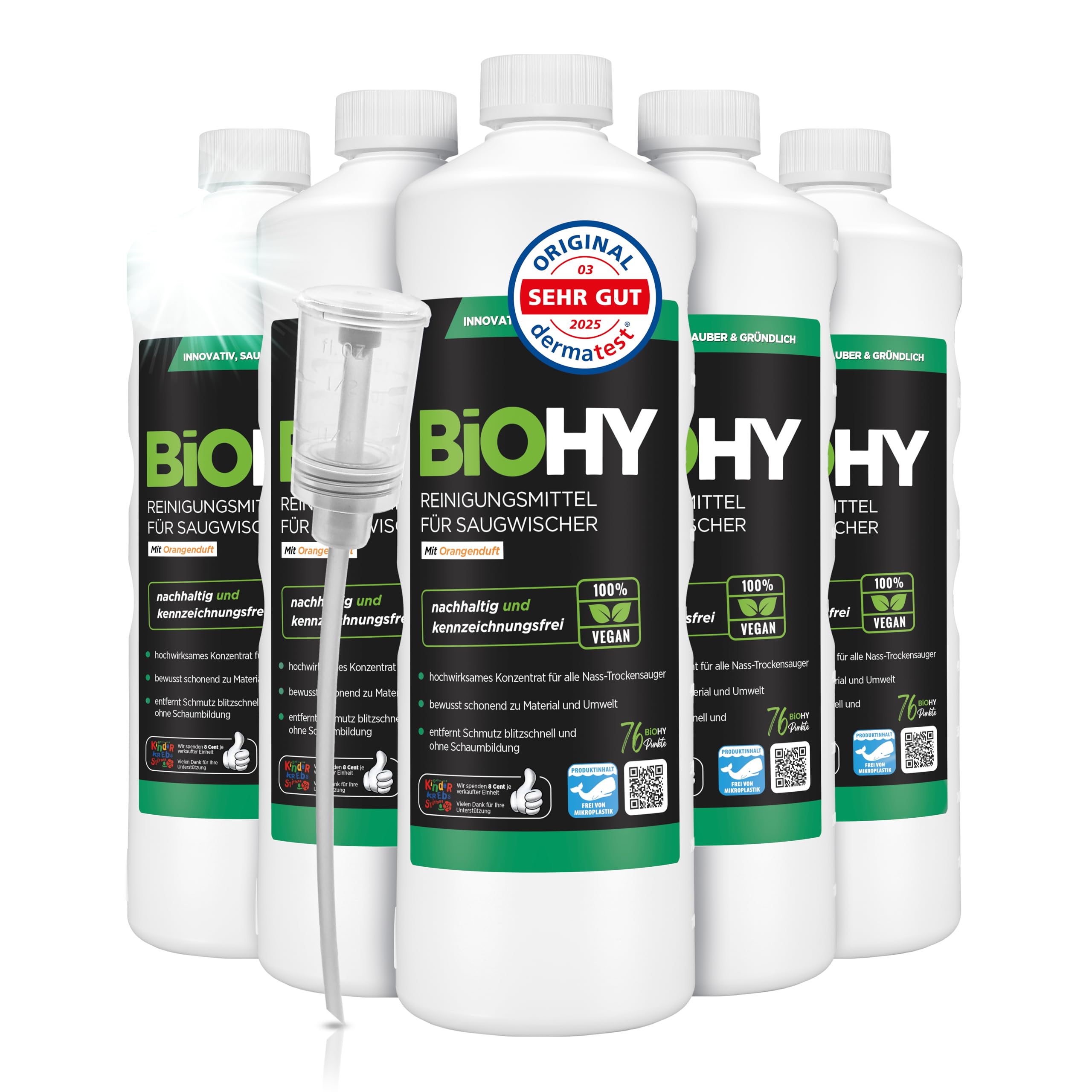 BiOHY Reinigungsmittel für Saugwischer mit Orangenduft (6 x 1 Liter) + Dosierer | 1:200 Konzentrat für alle Nass-Trockensauger | ideal für Fliesen, PVC, Parkett, Laminat & Teppich | streifenfrei