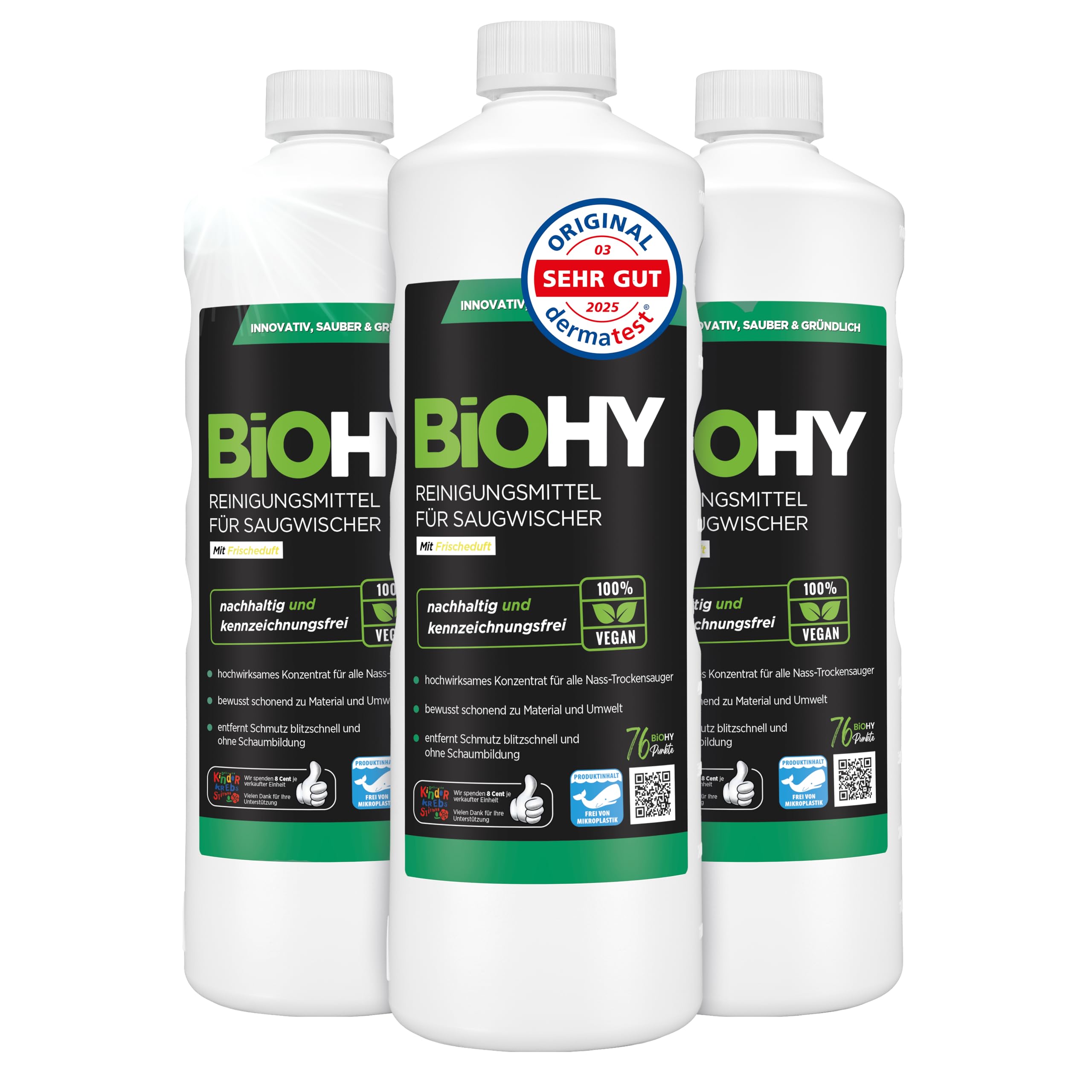 BiOHY Reinigungsmittel für Saugwischer mit Frischeduft (3 x 1 Liter) | 1:200 Konzentrat für alle Nass-Trockensauger | ideal für Fliesen, PVC, Parkett, Laminat & Teppich | streifenfreier Glanz
