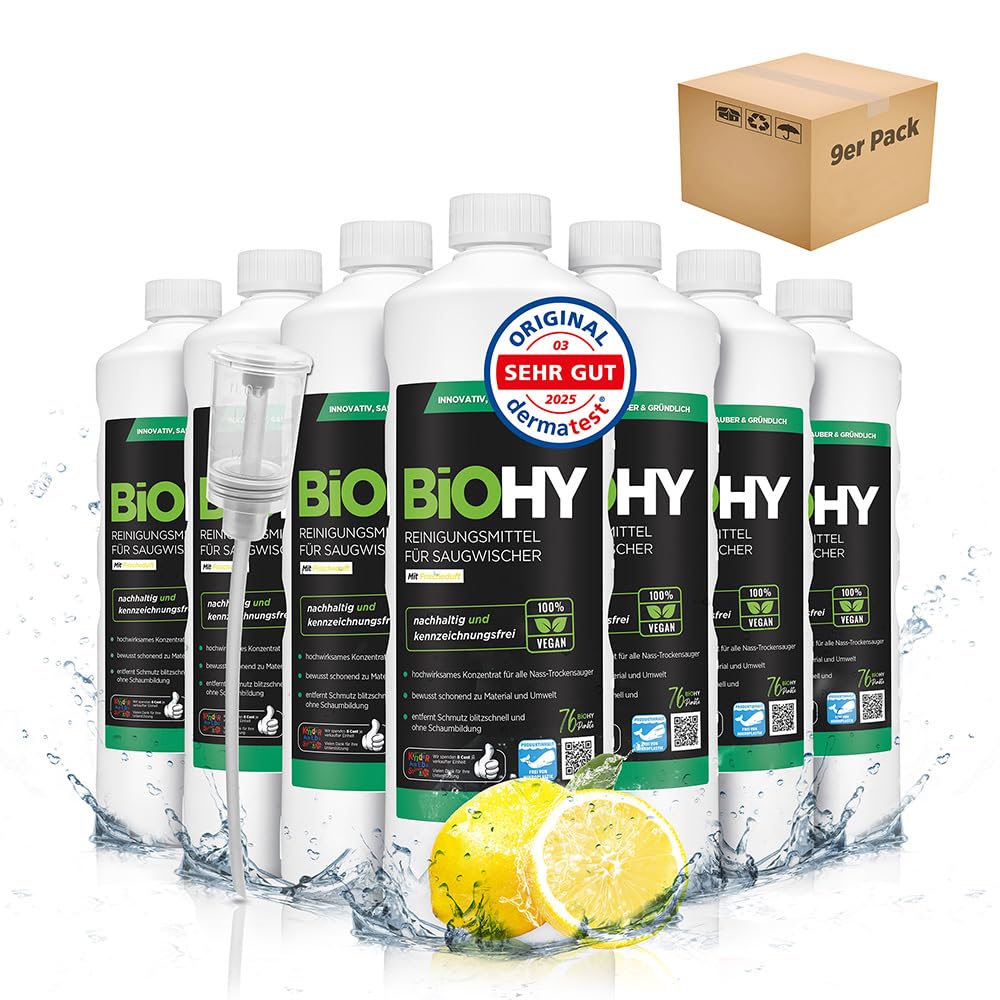 BiOHY Reinigungsmittel für Saugwischer mit Frischeduft (9 x 1 Liter) + Dosierer | 1:200 Konzentrat für alle Nass-Trockensauger | ideal für Fliesen, PVC, Parkett, Laminat & Teppich | streifenfreier