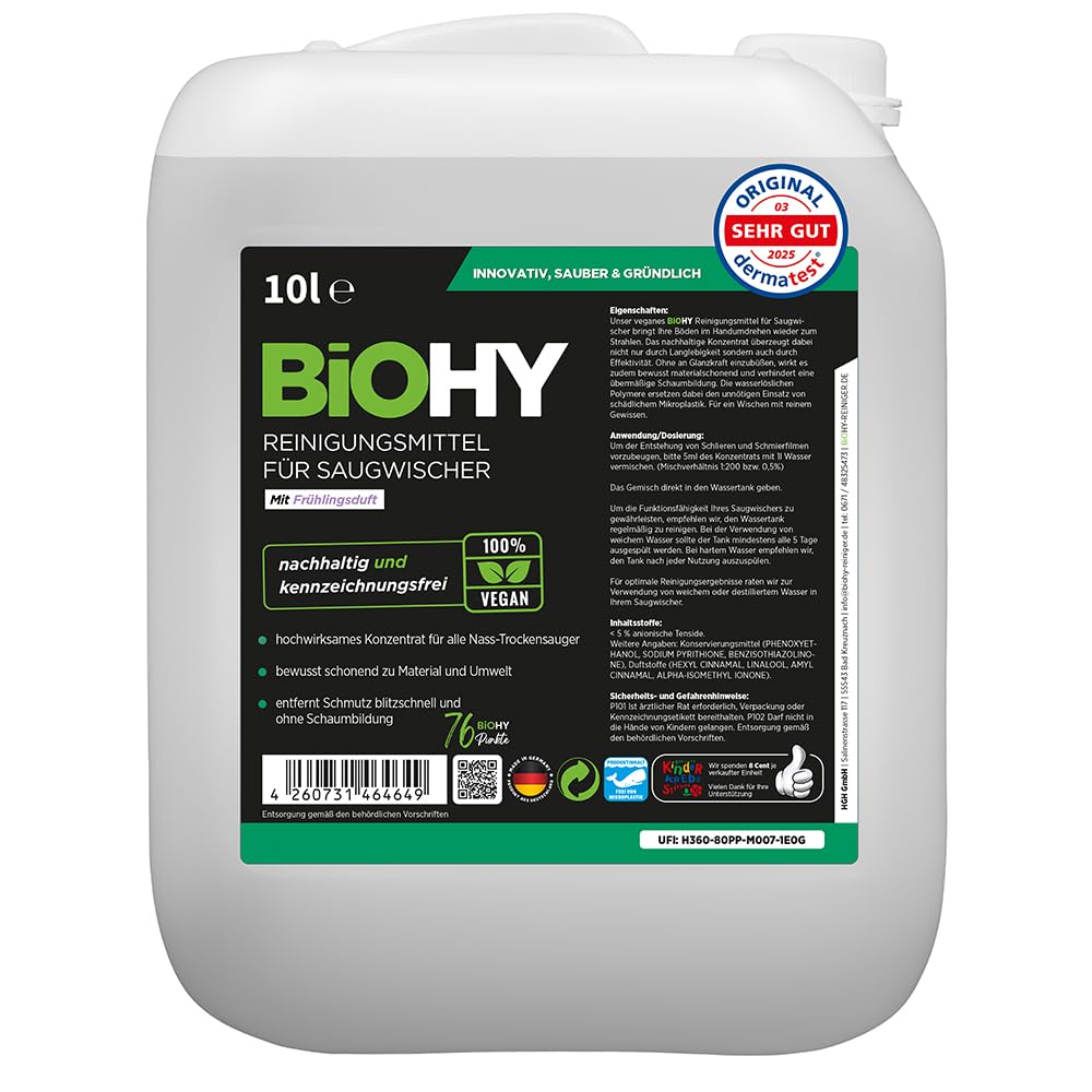 BiOHY Reinigungsmittel für Saugwischer mit Frühlingsduft (10 Liter Kanister) | 1:200 Konzentrat für alle Nass-Trockensauger | ideal für Fliesen, PVC, Parkett, Laminat & Teppich | streifenfreier Glanz