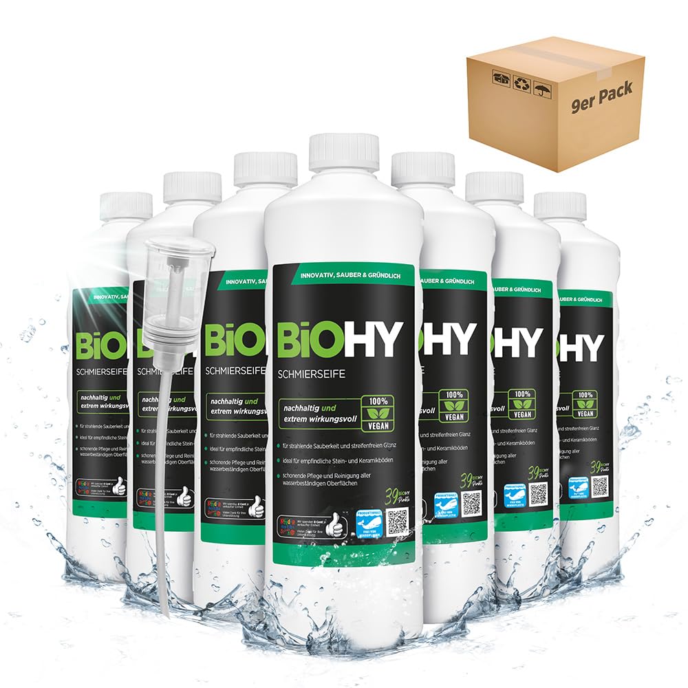 BiOHY Schmierseife (9 x 1 Liter) + Dosierer | Bodenreiniger Konzentrat – Wischpflege für Holz, Parkett & Fliesen | Rückfettend, extra stark & ergiebig | Flüssiger Bio-Fussbodenreiniger