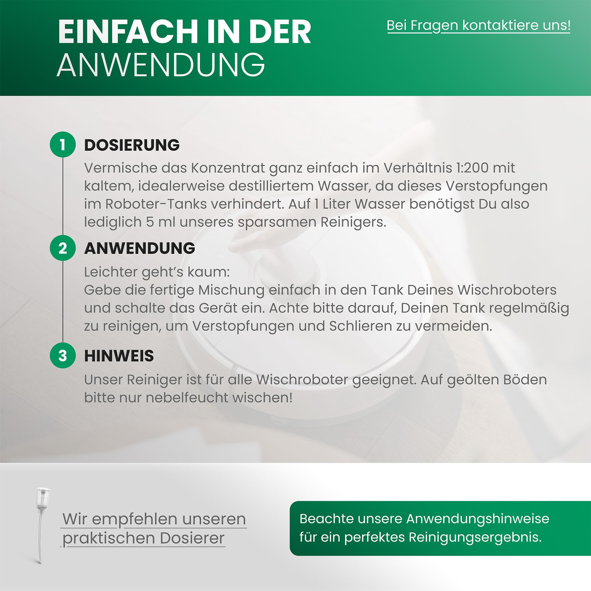 Unser 100% veganes BiOHY Wischroboter Reinigungsmittel befreit Ihre Holzböden zuverlässig von Flecken aller Art. Blitzschnell, effektiv und bewusst tierfreundlich, behandelt es das Holz sowie den Tank Ihres Roboters stets schonend. Damit garantiert unser Bodenreiniger nicht nur ergiebige Sauberkeit mit frischem Duft, sondern auch eine perfekte Pflege.