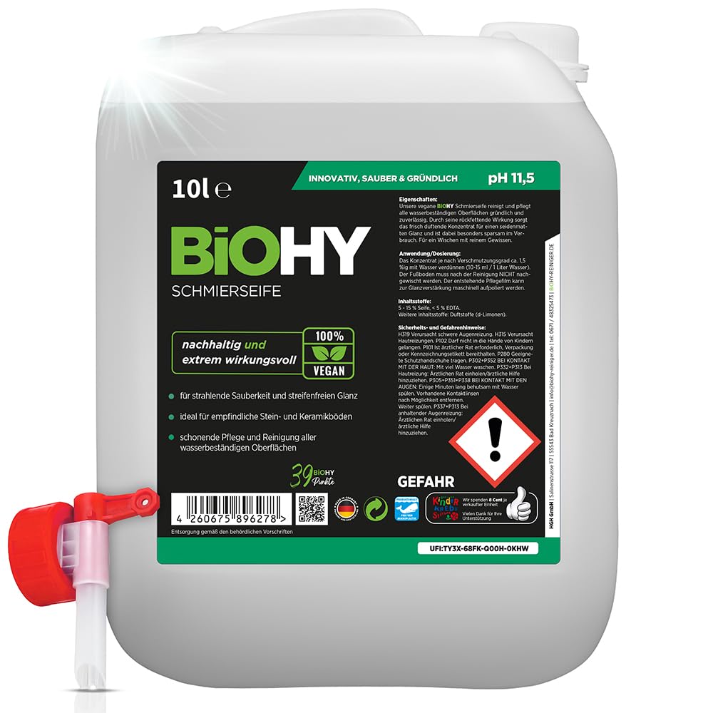 BiOHY Schmierseife (10 Liter Kanister) + Auslaufhahn | Bodenreiniger Konzentrat – Wischpflege für Holz, Parkett & Fliesen | Rückfettend, extra stark & ergiebig | Flüssiger Bio-Fussbodenreiniger