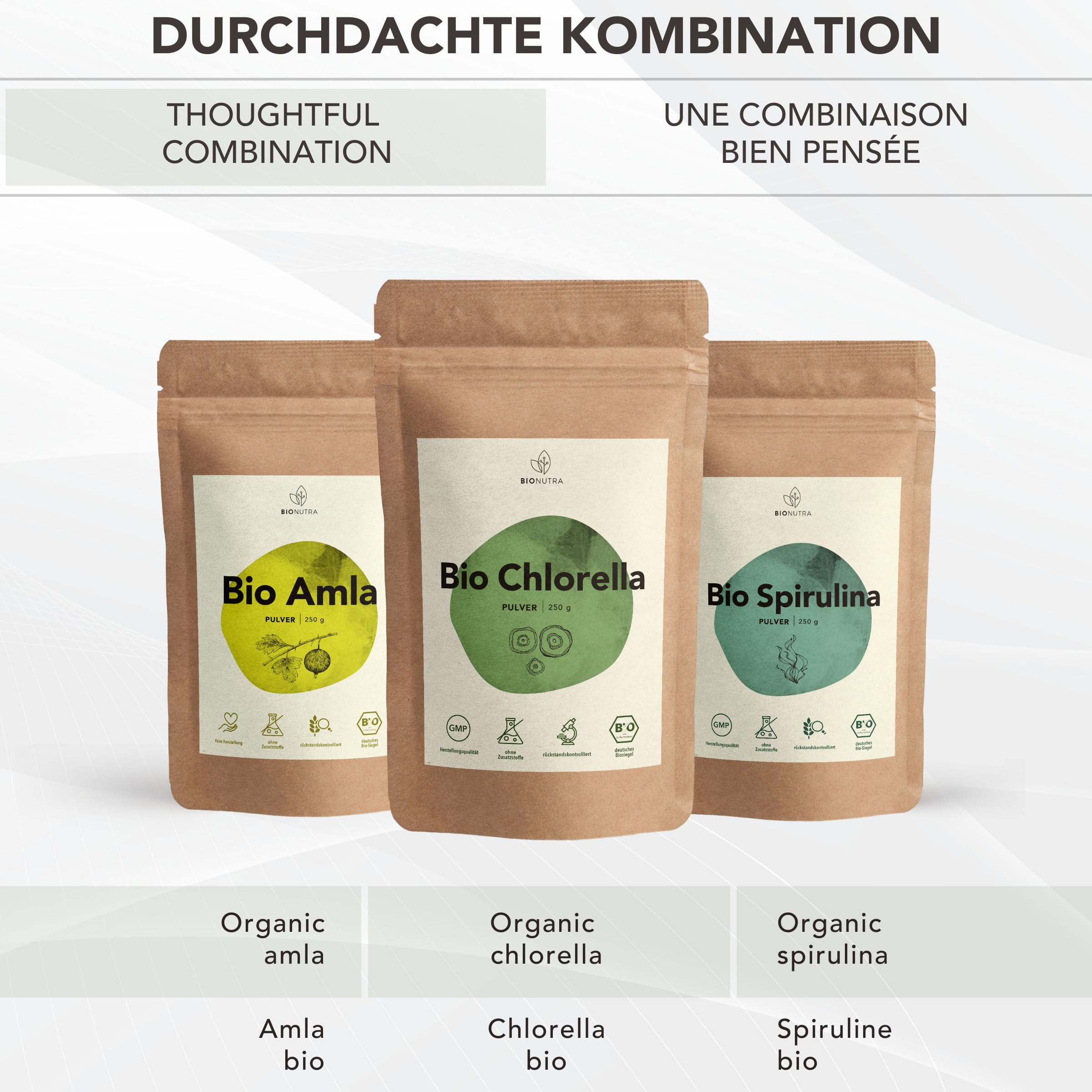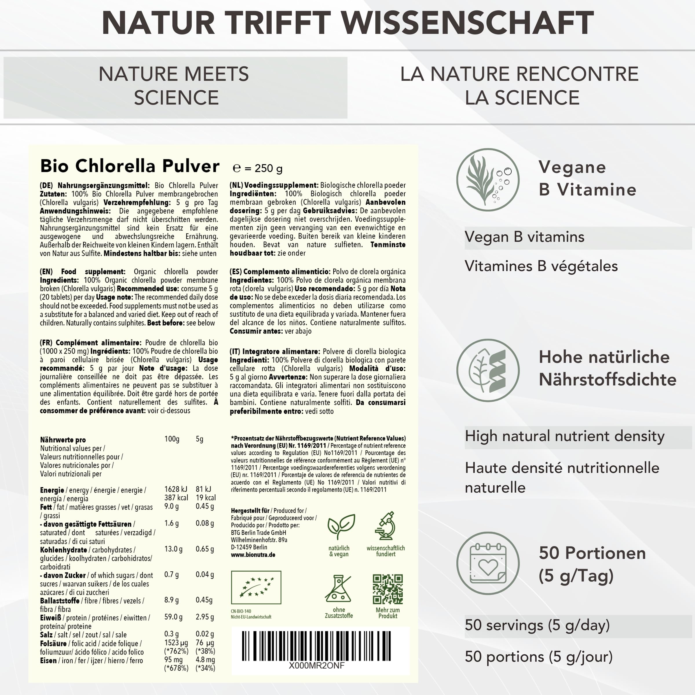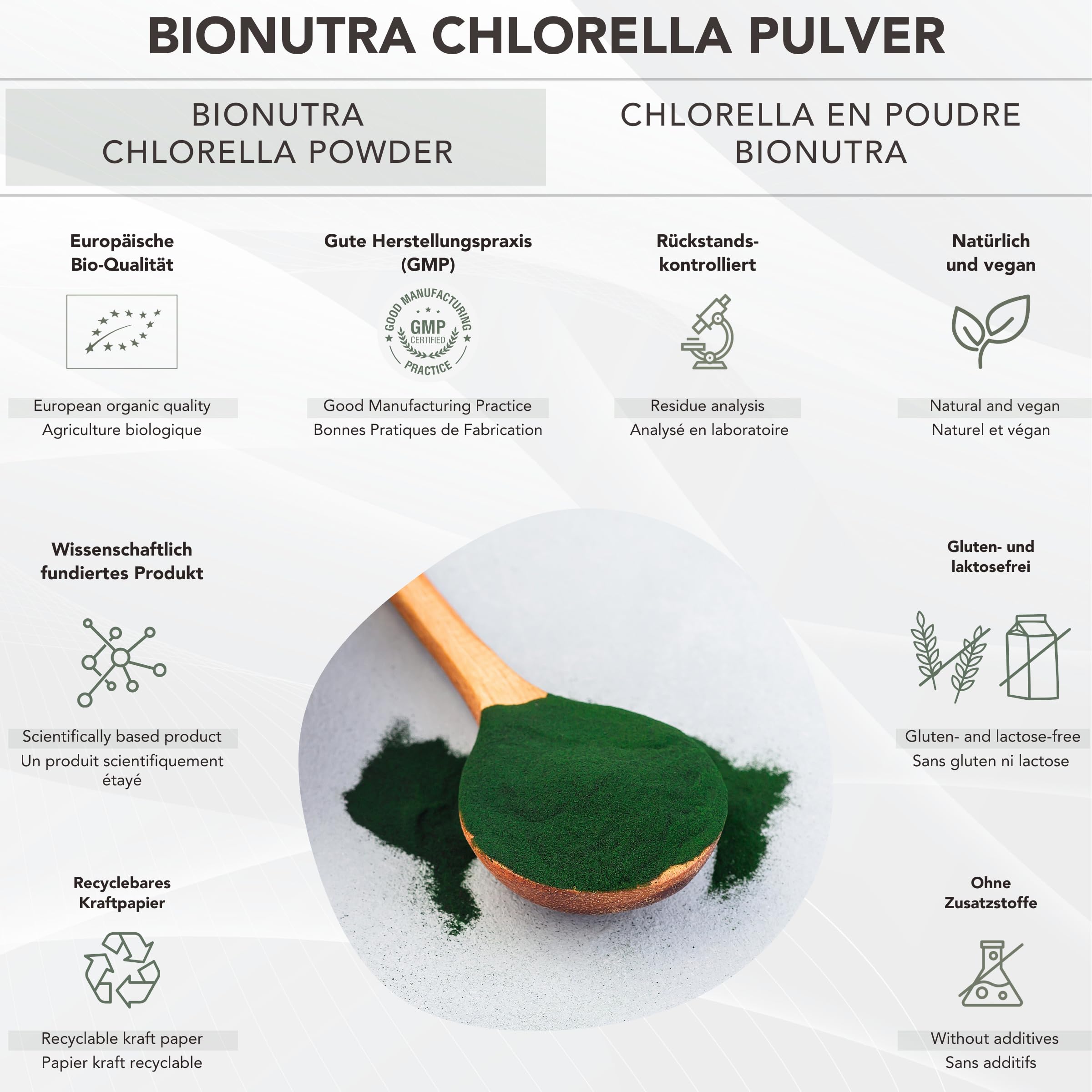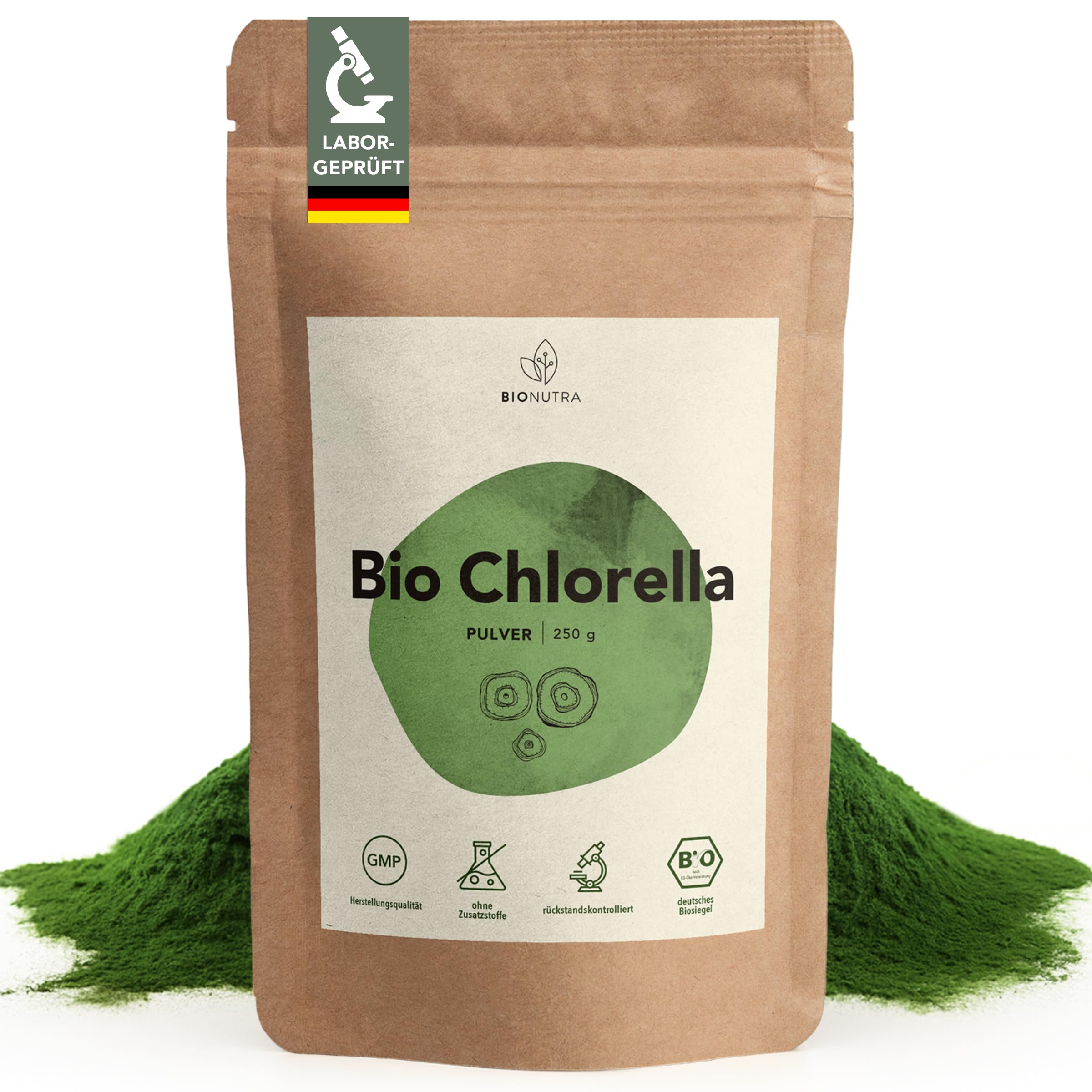 BIONUTRA® Bio Chlorella Pulver – 250 g, nach EU-ÖKO-Standard hergestellt, rückstandskontrolliert, ohne Zusätze, vegan, laktose- & glutenfrei, aus reinem Chlorella Bio Algenpulver