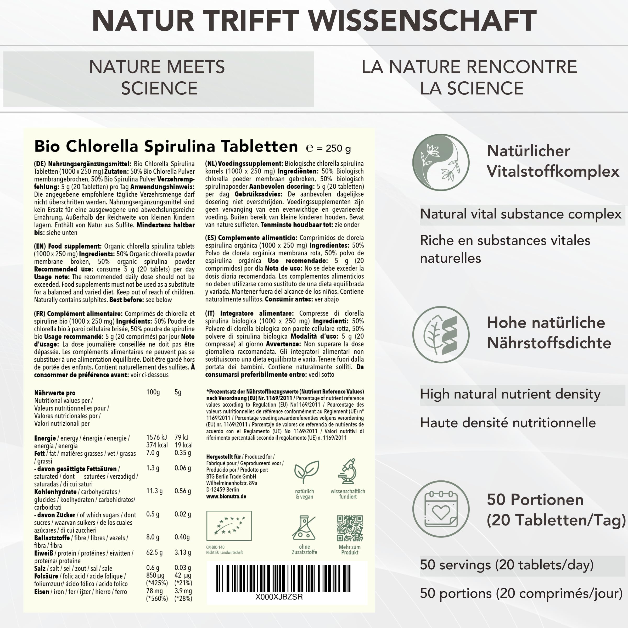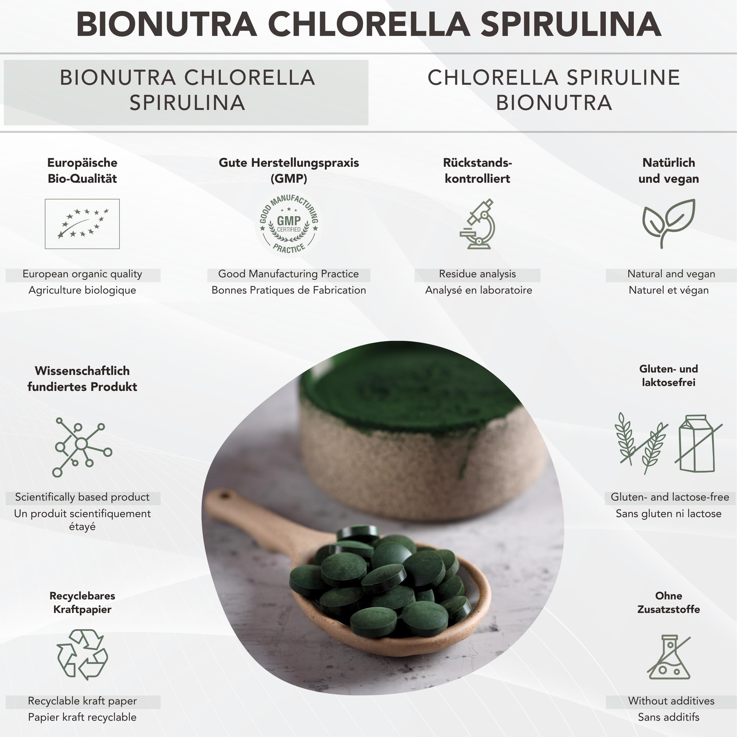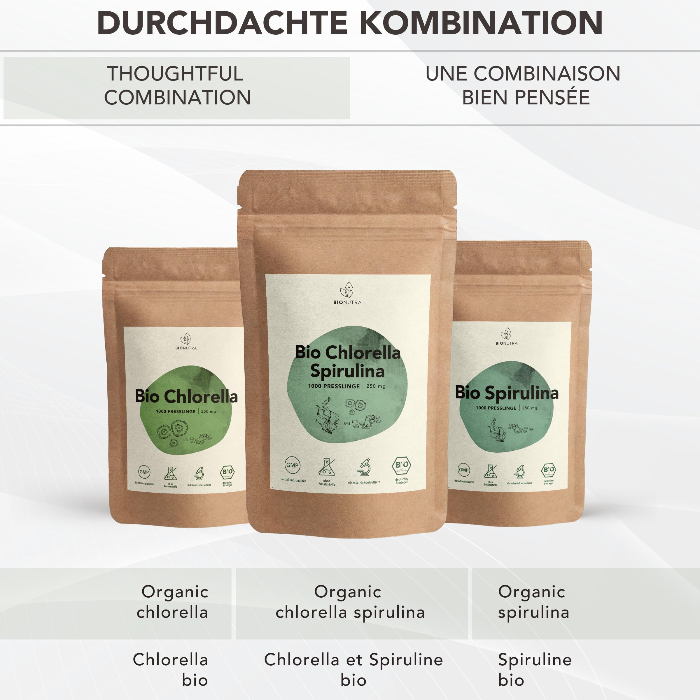 BIONUTRA® Bio Spirulina Chlorella Tabletten – 1000 Presslinge à 250 mg, nach EU-ÖKO-Standard hergestellt, rückstandskontrolliert, ohne Zusätze, vegan, aus reinem Spirulina Chlorella Bio Algenpulver