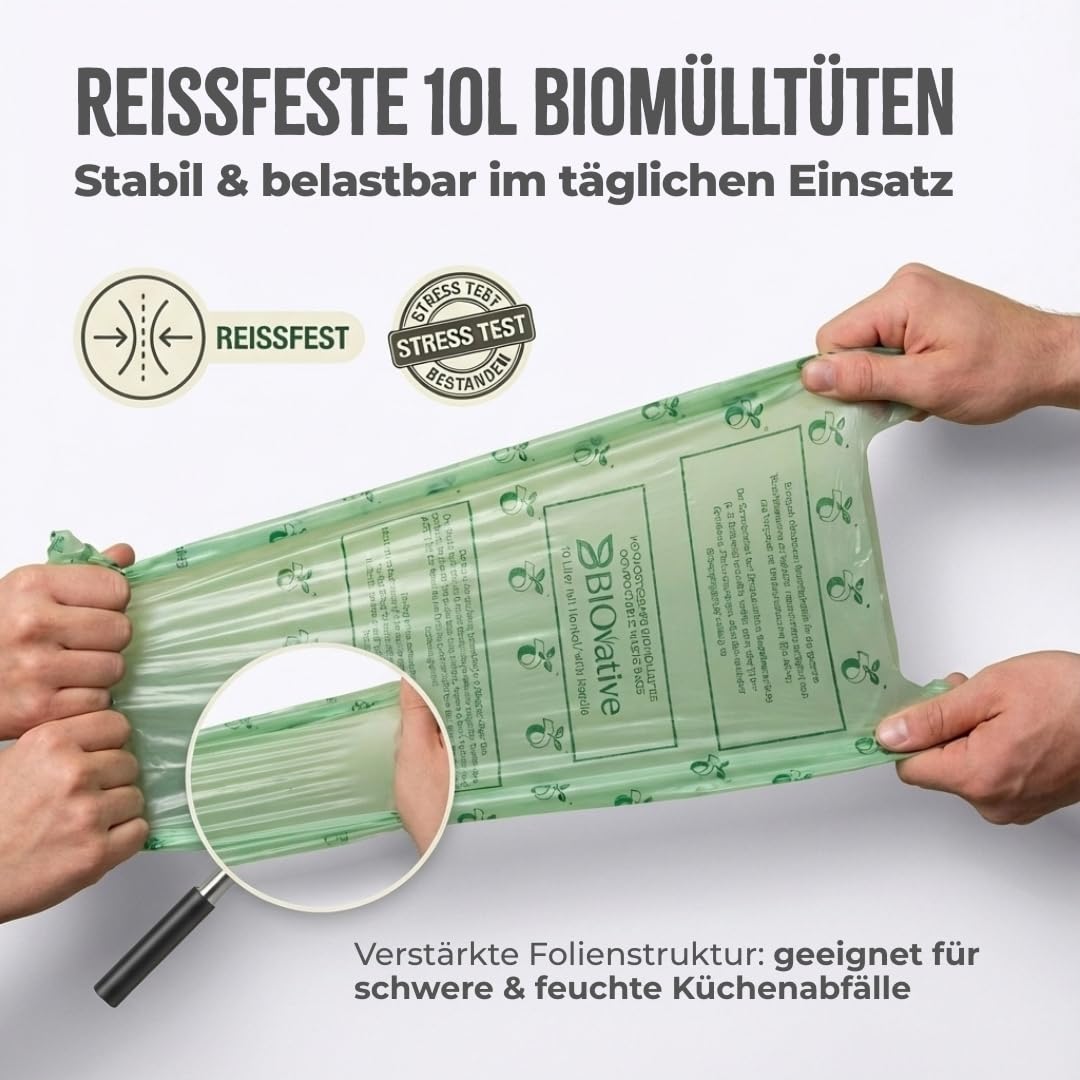BIOvative PRODUCTS 10L Biomüllbeutel mit Henkel | 100 Müllbeutel, kompostierbar, Made in Germany | Reissfeste Bio-Abfallbeutel, klimaneutralisiert & vegan