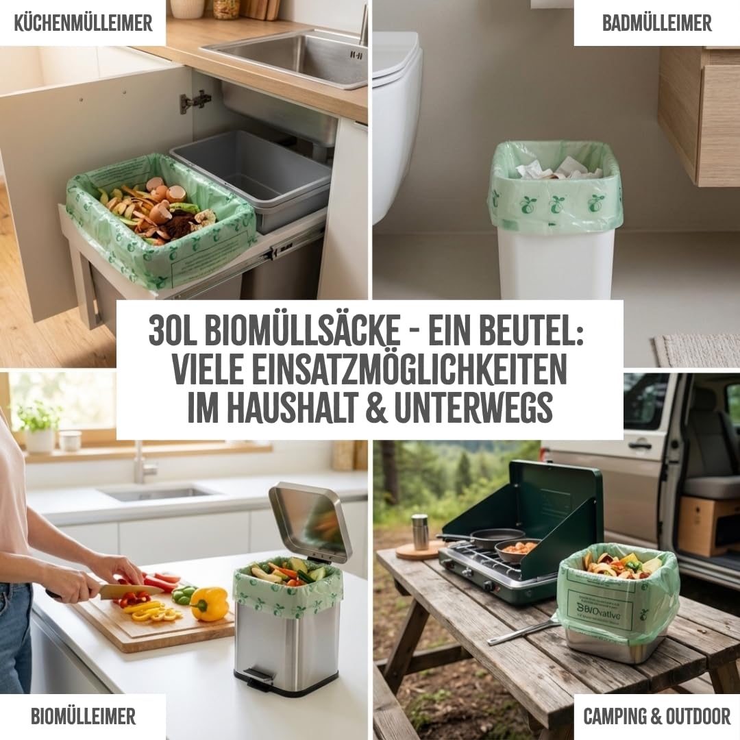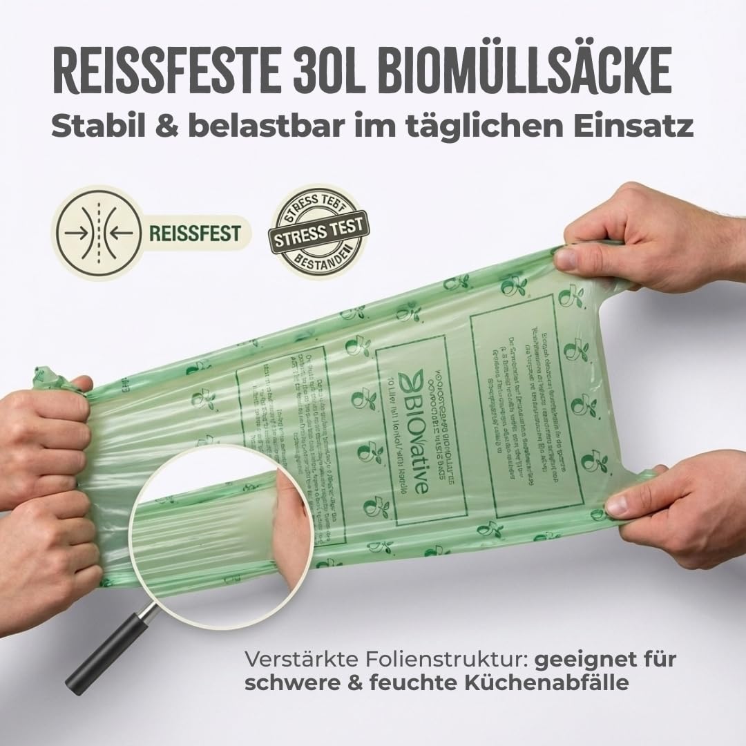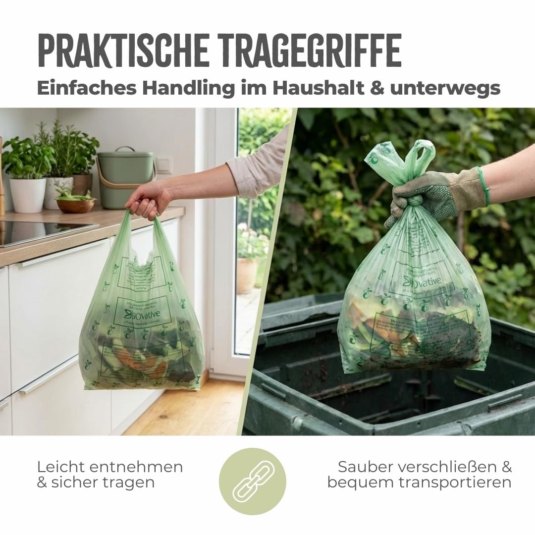 BIOvative PRODUCTS 30L Biomüllbeutel mit Henkel | 39 Müllbeutel, kompostierbar, Made in Germany | Reissfeste Bio-Abfallbeutel, klimaneutralisiert & vegan