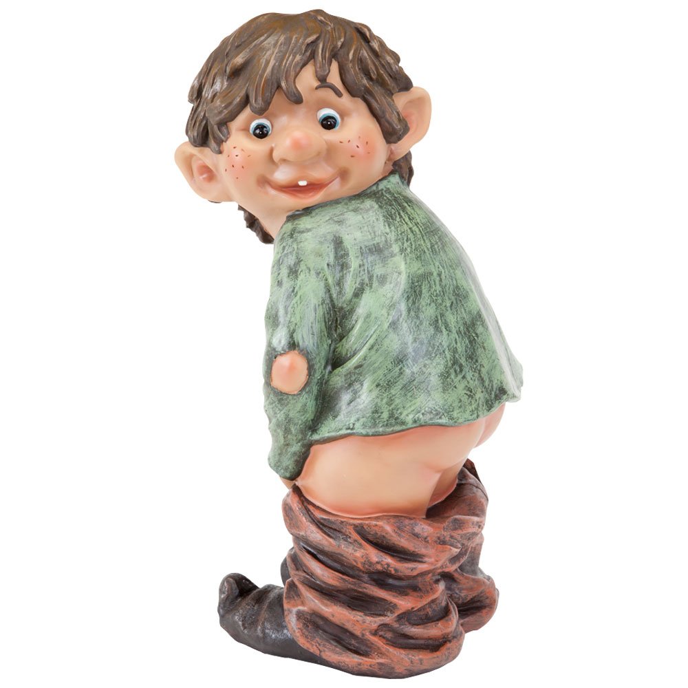 Dieser kleiner Zwerg oder Kobold wird bestimmt eine lustige Überraschung für alle die ihn antreffen. Wenn man Ihn an einem Baum oder Zaun aufstellt sieht es aus als ob man ihm beim Pinkeln erwischt hat. Schnell wieder mit der Hose hoch! Unser frech-fröhlicher Elf hat einen überraschten Ausdruck, er schämt sich also doch schon ein bisschen. Handbemaltes Kunstharz. 34cm hoch x 13cm breit.