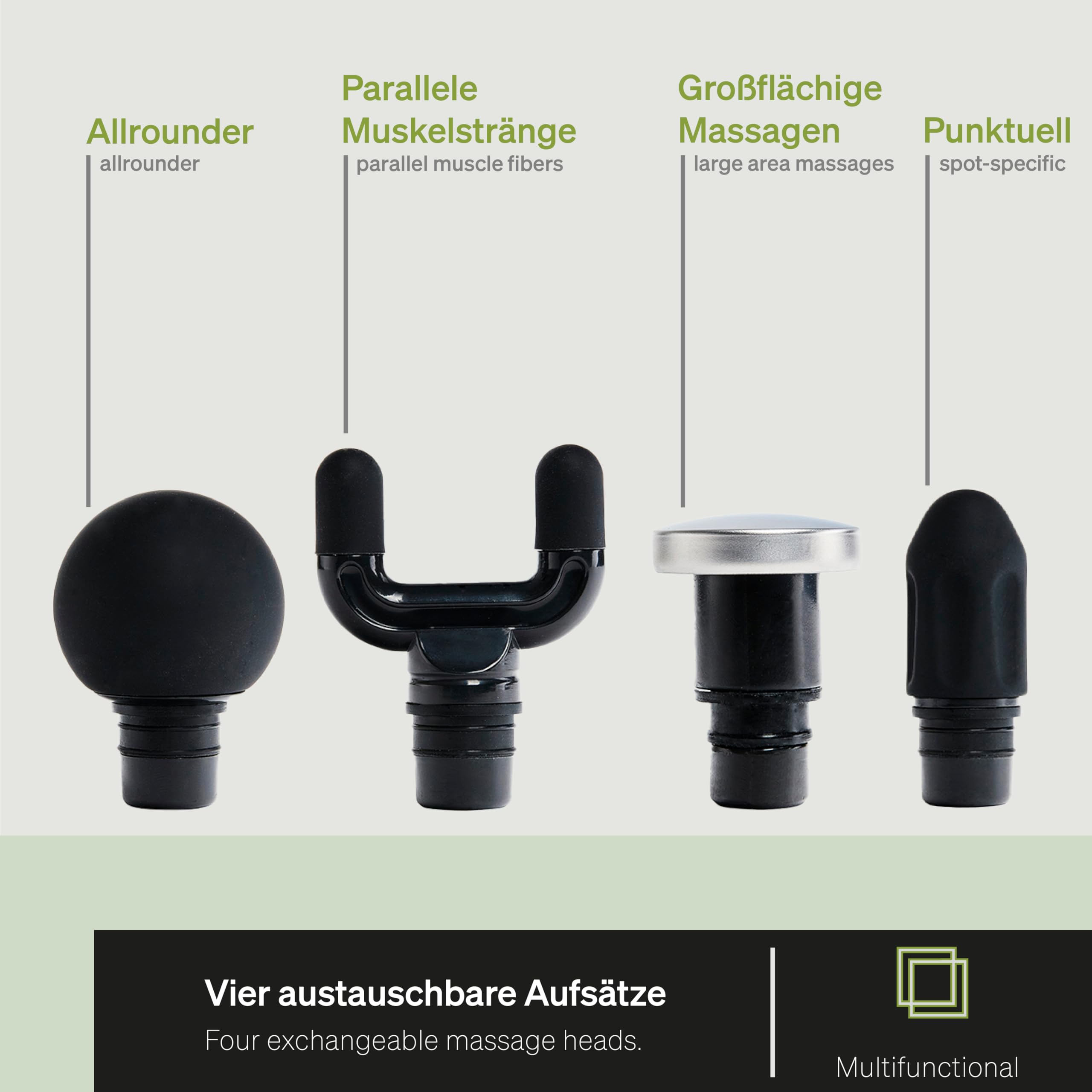• 4 MASSAGE-AUFSÄTZE: Löse Verspannungen und gönn dir oder deinem Partner eine Erholungsmassage. METAL FLAT für streichende Bewegungen auf der Haut, mit Massageöl oder zur Anwendung auf der Kleidung. SILICON BALL bietet einen guten Grip und eignet sich zur Massage des gesamten Körpers. SILICON FORK für den Einsatz an parallelen Muskelsträngen. SILICON TRIGGER Hilft Dir besonders bei der Auflösung von lokal verhärtetem Gewebe und verklebten Faszien.