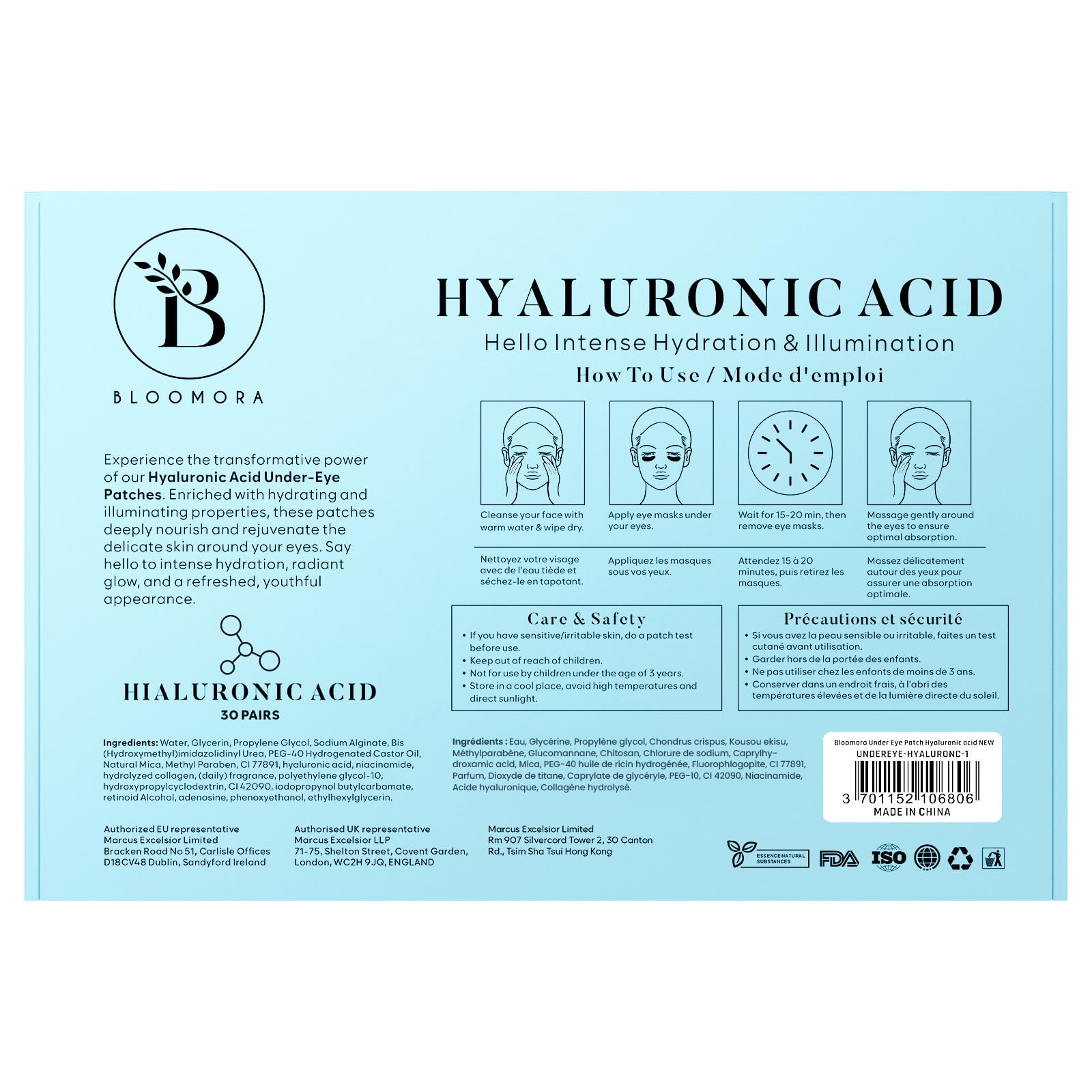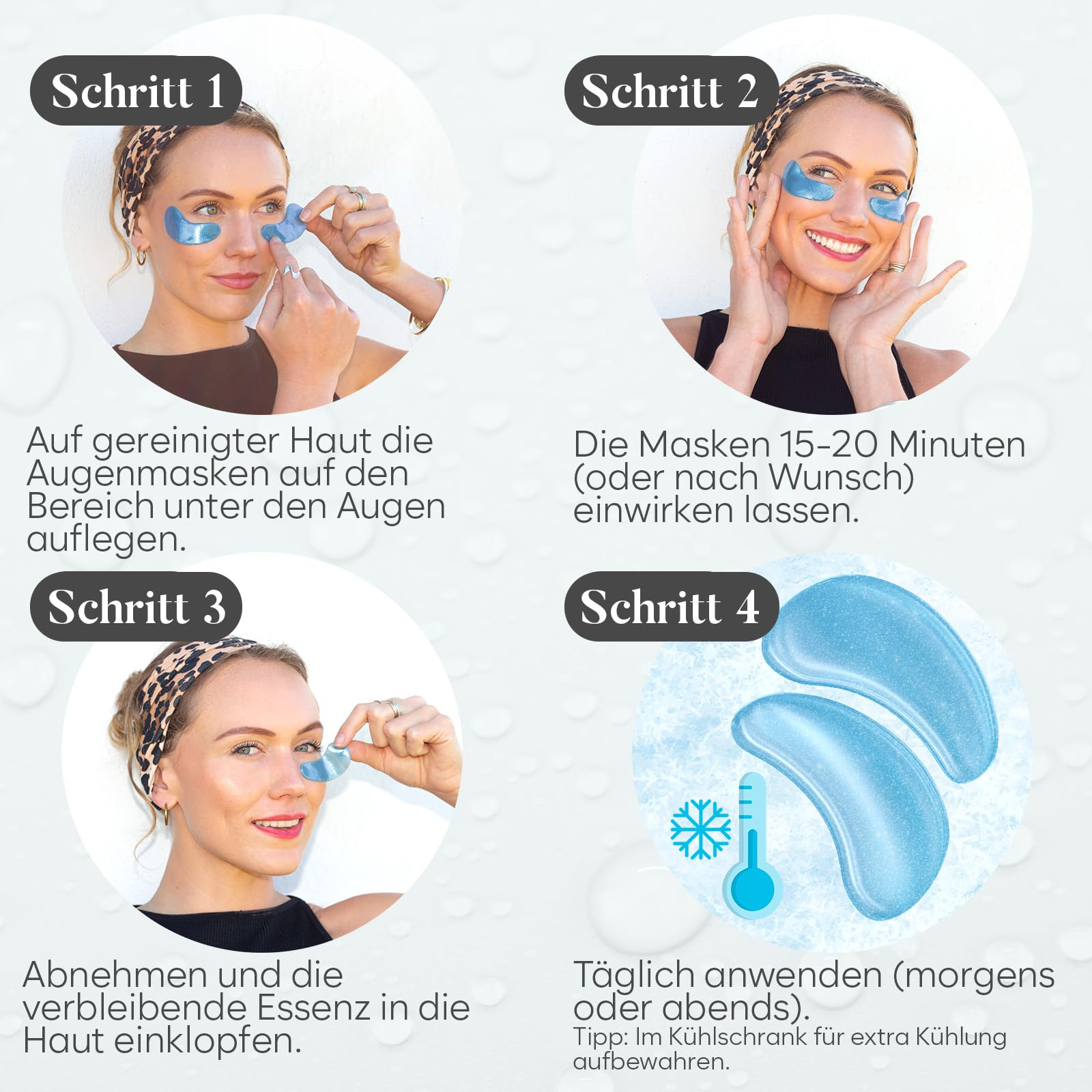 Hyaluronsaeure bindet Feuchtigkeit in der Haut, polstert Trockenheitslinien auf und verleiht der Augenpartie mehr Geschmeidigkeit. Niacinamid unterstuetzt einen gleichmaessigen Hautton und kann dunkle Schatten unter den Augen optisch aufhellen. Die kuehlenden Hydrogel Pads wirken sofort erfrischend und helfen, Traenensaecke sowie Schwellungen zu mildern.
