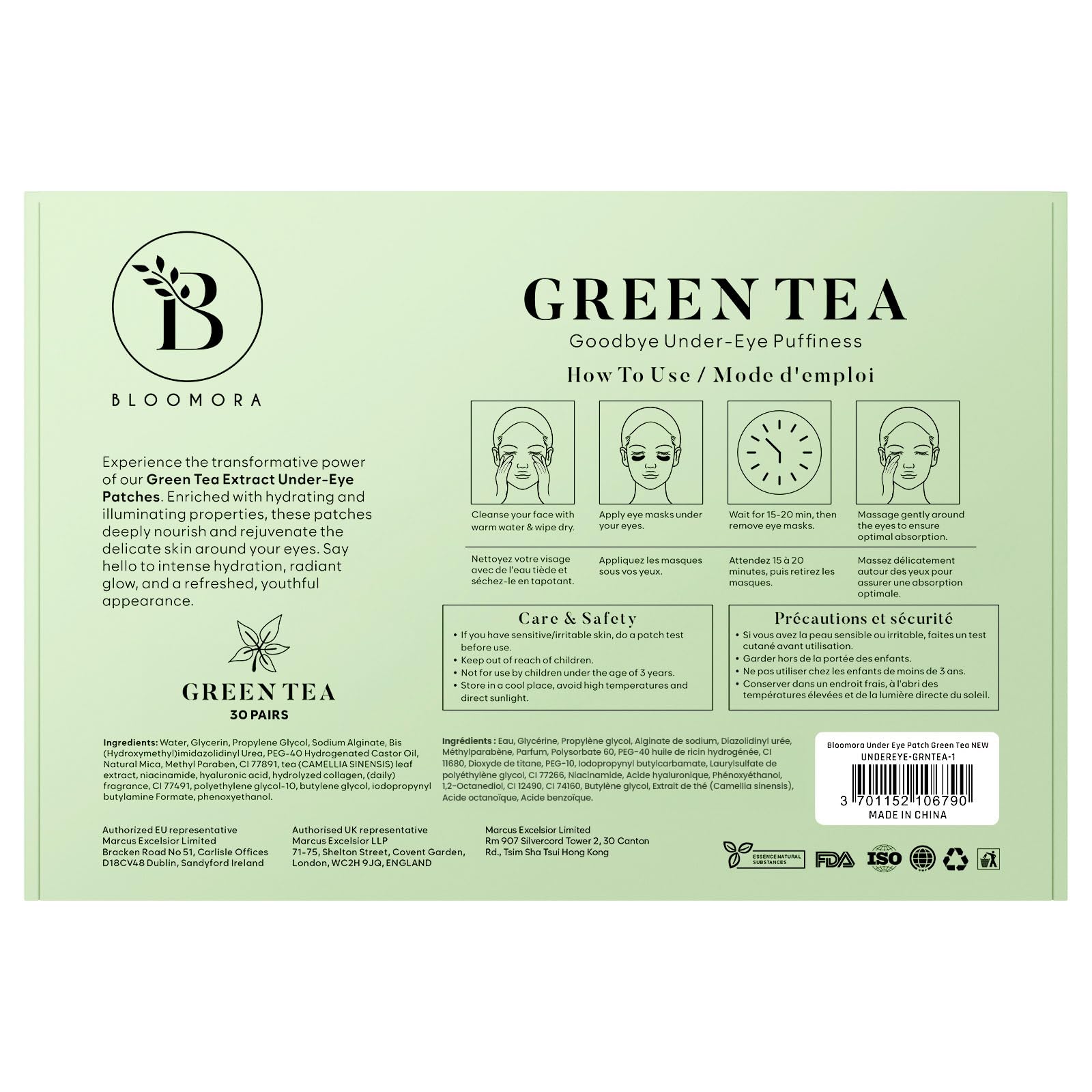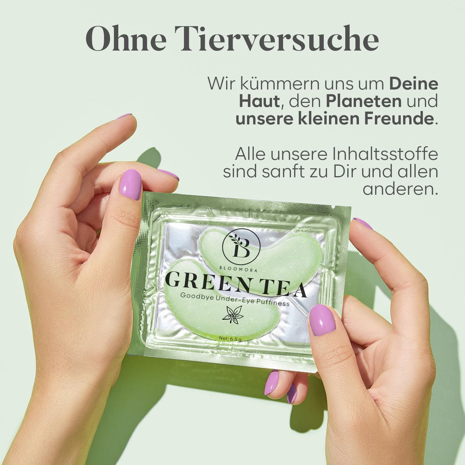 Die BLOOMORA Gruener Tee Augenpads bieten eine gezielte Augenpflege gegen Augenringe, Schwellungen und Muedezeichen. Die wirkungsvolle Kombination aus Gruenem Tee Extrakt, Niacinamid und Hyaluron versorgt die empfindliche Augenpartie intensiv mit Feuchtigkeit, beruhigt gestresste Haut und sorgt fuer ein frisches, erholtes Aussehen.