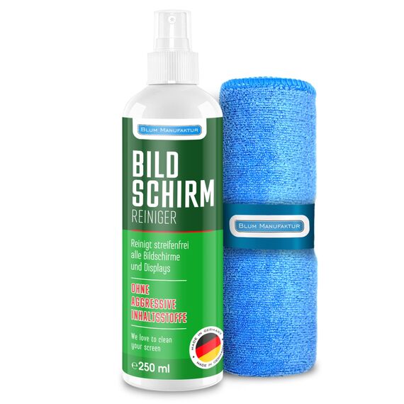Blum Manufaktur 250ml Bildschirmreiniger + 30x30 cm Mikrofasertuch - Screen Cleaner - Display Reiniger - Absolut streifenfreie Reinigung von Handy, Laptop, PC, TV