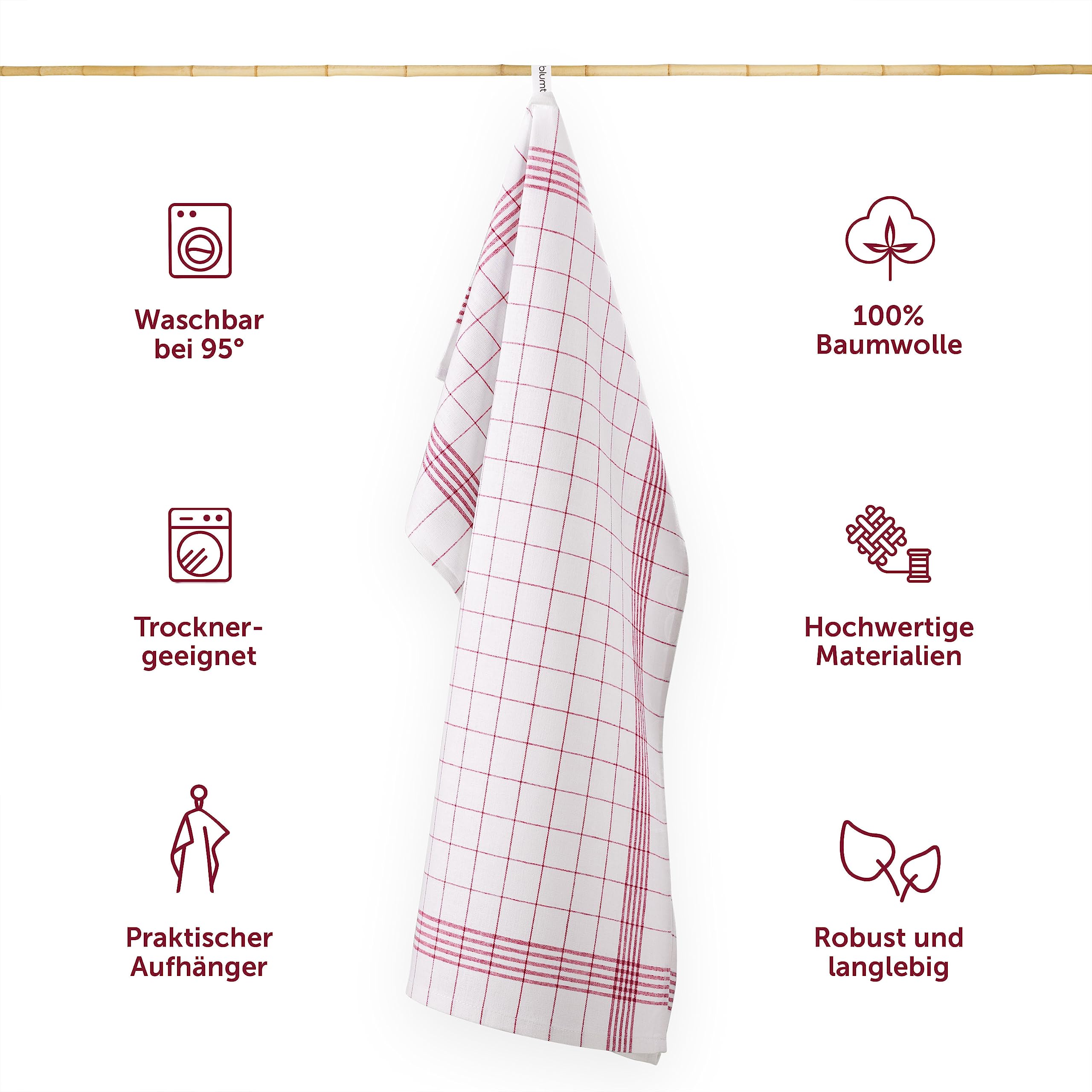 Blumtal – Küchen-Geschirrtücher (5er-, 10eroder 20er-Pack) – 50 x 70 cm – Geschirrtuch mit Haken – 100 % Baumwolle – sehr saugfähig – waschbar bei 95 ° – klassisches rotes Quadrat-Design (20) ? SUPER SAUGFÄHIG – Blumtal 100 % Küchentücher aus Baumwolle bieten eine überdurchschnittliche Saugfähigkeit, sodass Sie eine erhebliche Menge an Flüssigkeiten aufnehmen können. Die Geschirrtücher sind ideal in der Küche, können aber auch für andere Zwecke, wie zum Beispiel zum Fenstertrocknen oder Staubwischen, verwendet werden. ? HOCHWERTIGE MATERIALIEN: Die Küchentücher bestehen zu 100 % aus natürlicher Baumwolle und haben eine optimale Grösse von 50 cm x 70 cm. Sie nehmen das Zwölffache ihres Eigengewichts an Flüssigkeiten auf und trocknen dreimal schneller als herkömmliche Baumwollhandtücher, wodurch sie sich ideal zum Reinigen eignen. Das klassische Karomuster erinnert an Omas Küchenhandtücher aus Baumwolle. ? REINIGUNG: Maschinenwaschbar bei maximal 90°C und trocknergeeignet. Baumwoll-Küchentücher nehmen nach dem Waschen keinen Schmutz auf und verlieren auch nach vielen Wäschen nicht ihre Form und supersaugfähigen Eigenschaften. Praktischer Haken an der Seite: Die Küchentücher verfügen über einen praktischen Schlitz an der Seite, der ein problemloses Aufhängen ermöglicht. Sie haben an allen Seiten einen Saum, der ihre Festigkeit erhöht. Jedes Geschirrtuch mit Haken ist ein Muss in Ihrer Küche. ? GESCHENKIDEE: Ideal zum Trocknen von Geschirr, Gläsern, Gläsern und Vasen, ohne Spuren zu hinterlassen. Hergestellt aus natürlichen Materialien und frei von giftigen Substanzen. Geschirrtücher sind auch ein perfektes Geschenk für frisch Eingezogene.