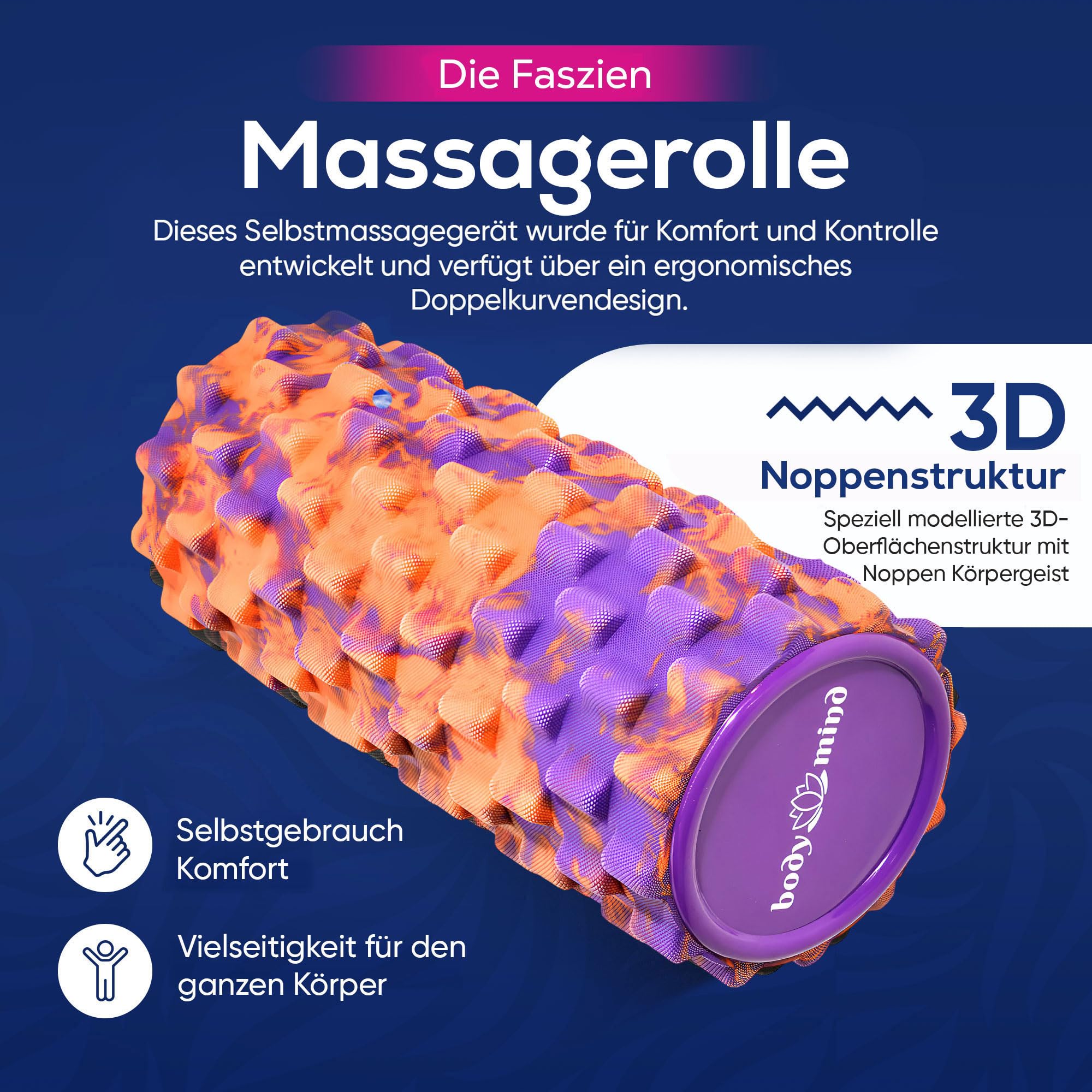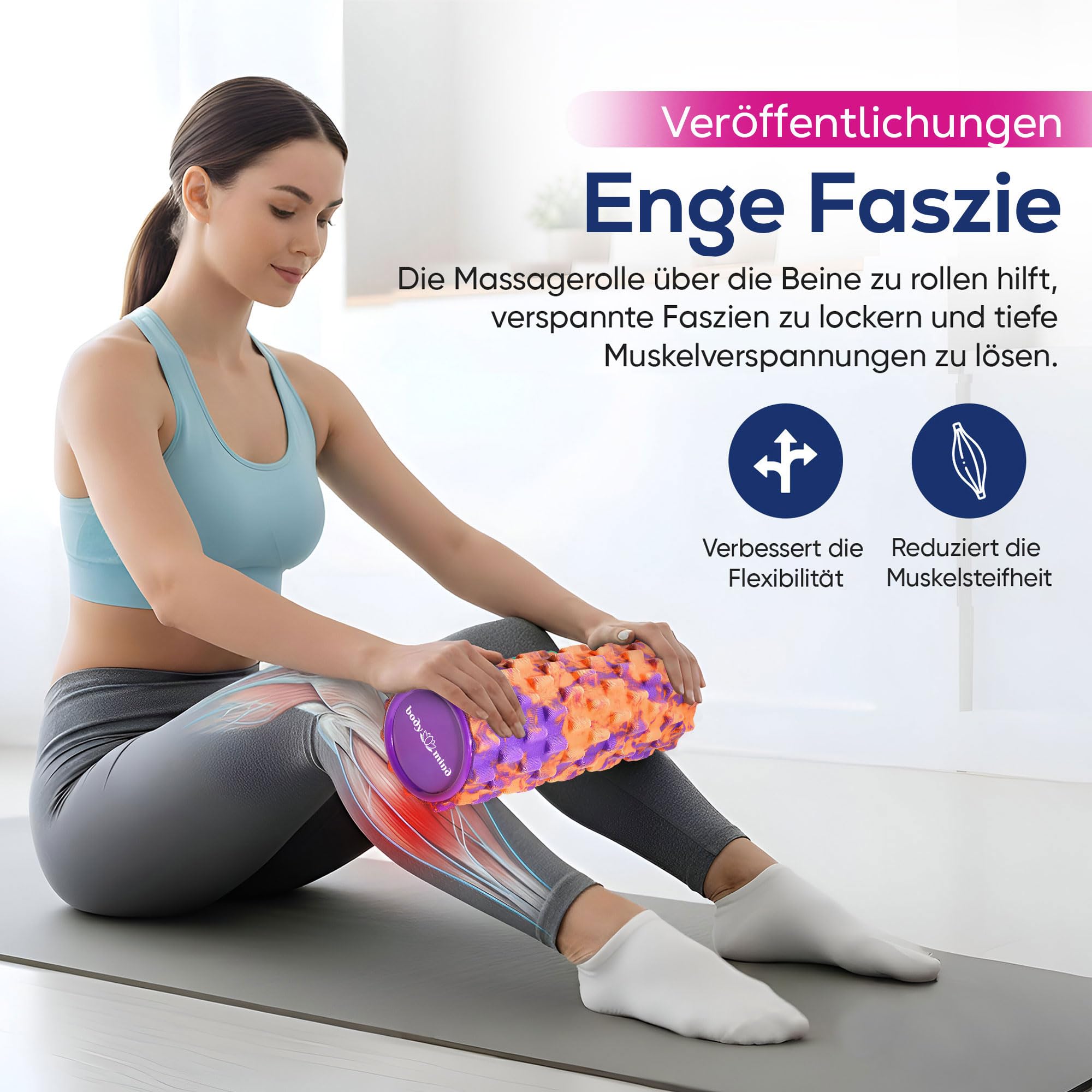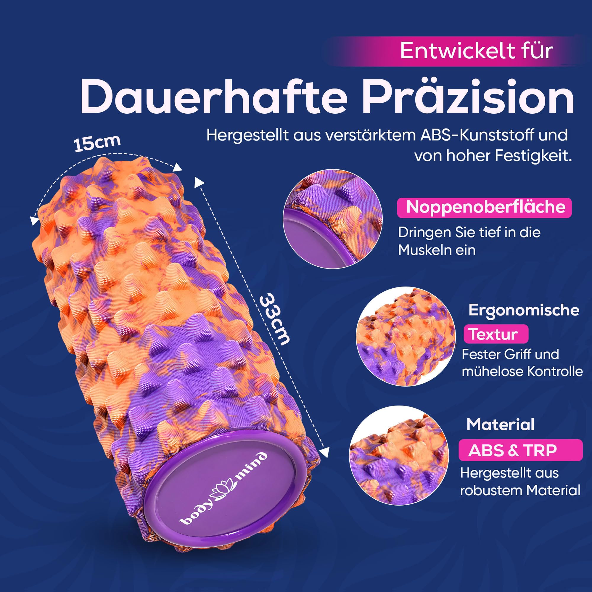 Body & Mind® Faszienrolle Massage-Rolle Fitnessrolle Sportrolle Therapierolle; Faszien-Training am Oberkörper, Nacken, Rücken, Beine, Waden & allen anderen Muskelgruppen; 33 x 14,5 cm; Orange-Lila