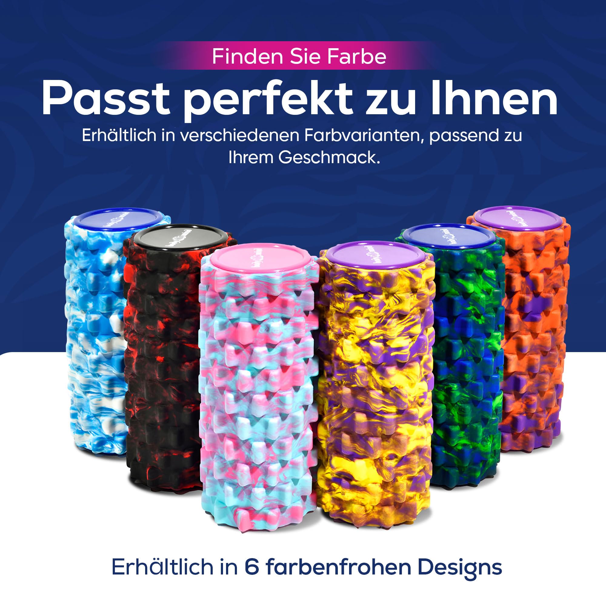 Profi Faszienrolle im Graffiti Style Mit den Body & Mind Faszienrollen holen Sie sich einen Premium Trainingspartner nach Hause: Die mit viel Erfahrung und aus hochwertigen Materialien konzipierte Faszienrolle garantiert ein effektives Training. Die Massagerolle ist dabei mit einem stabilen Hohlkern und super leichtem Spezial-Schaumstoff ummantelt. Sie müssen sich um Sicherheit bei Ihren Übungen nicht sorgen, denn die Massagerollen halten jeder Belastung stand. Faszien-Training entspricht den neuesten Sport-Physiologischen Erkenntnissen und massiert nicht nur verspannte Muskeln, sondern löst vor allem auch verklebte Faszien, was zu einem besonders entspannten Wohlgefühl nach erfolgtem Training führt. Die zusätzlichen Rillen zwischen den High Pulse Trigger Points fördert zusätzlich die Durchblutungsanregung. Gleichzeitig werden trockene Faszien bewässert, was diese schneller wieder schmerzfrei funktionieren lässt und Verkleben vorbeugt. Dank der zusätzlich eingebauten 3D-Noppen Oberflächenstruktur werden die s.g. Triggerpunkte exakt und mit passendem Druck massiert. Die Premium Faszienrollen von Body & Mind: - Ideale Massagerolle für jede Art von Faszientraining und Faszienmassage. - Lockert die Tiefenmuskulatur und entspannt den ganzen Körper. - Hilft dabei verklebte, oder verhärtete Faszien wieder zu lösen. - Die Faszienfasern werden besser bewässert & mit Nährstoffen versorgt. - Kann auch bei chronischen Schmerzen grosse Linderung verschaffen. - Die spezielle 3D Oberflächenstruktur erhöht den Massage-Effekt. - Mit erfahrenen Sportlern und Physiotherapeuten entworfen und entwickelt. - Pop Graffiti Style macht die Multifunktions Fitnessrollen zu Eyecatchern. - Das Original mit Design Made in Germany von Goods & Gadgets. - Stabiler Hohlkern mit Spezialkunststoff ca. 33 cm lang, 14,5cm breit.