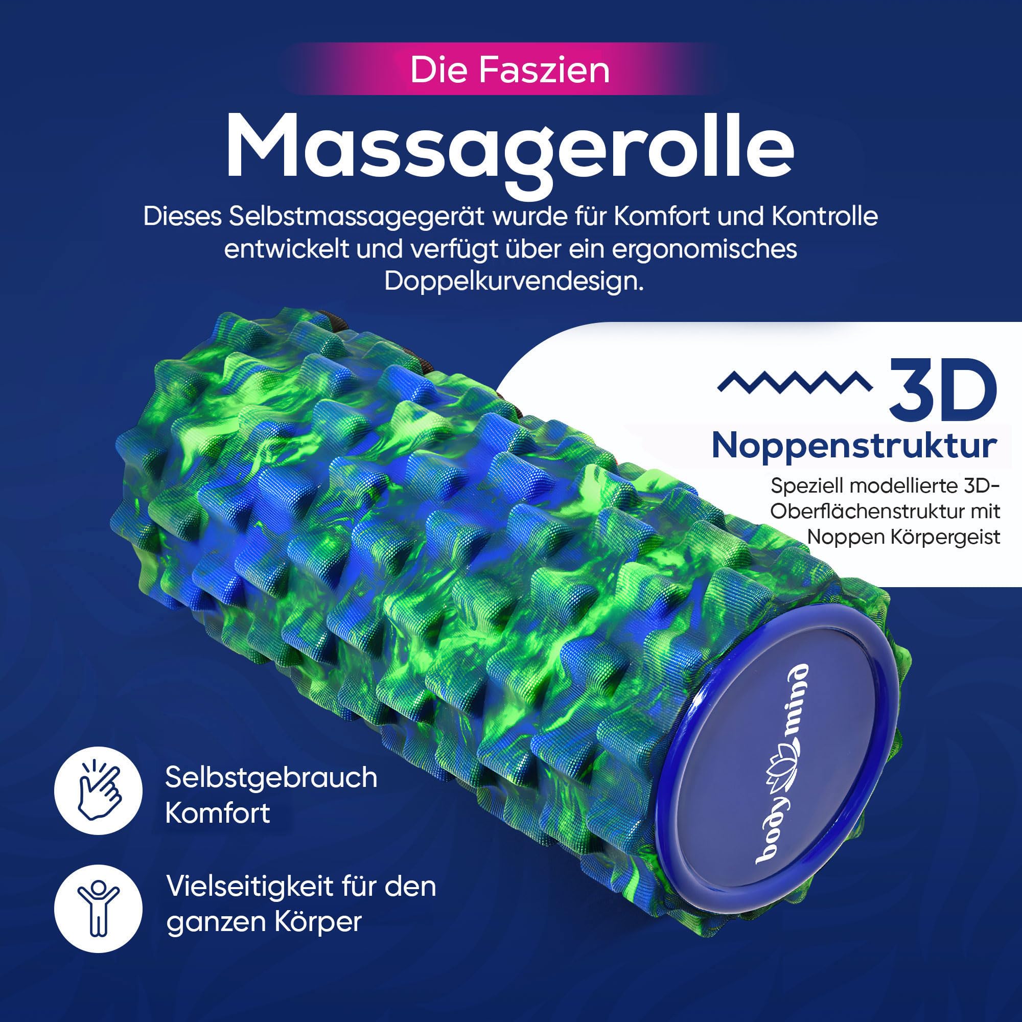 Body & Mind® Faszienrolle Massage-Rolle Fitnessrolle Sportrolle Therapierolle; Faszien-Training am Oberkörper, Nacken, Rücken, Beine, Waden & Allen Anderen Muskelgruppen; 33 x 14,5 cm