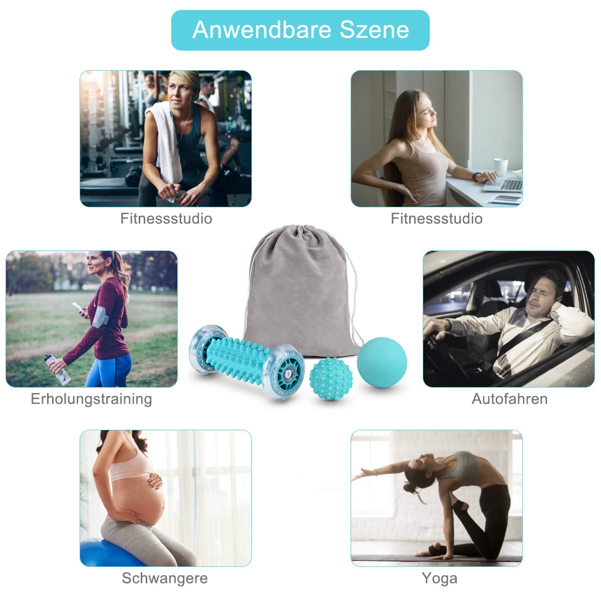 Das Materialmix aus TPE, PVC und PU sorgt fuer stabile Form und gute Haltbarkeit im Alltag. Durch die kompakte Groesse kannst du das Set im Buero, zu Hause oder auf Reisen nutzen. Fuer die Anwendung reicht ein paar Minuten am Tag: Rolle langsam ueber die Fusssohle, halte an schmerzhaften Punkten kurz inne und steuere den Druck ueber dein Koerpergewicht. Fuer empfindliche Stellen starte im Sitzen, fuer mehr Intensitaet im Stehen.