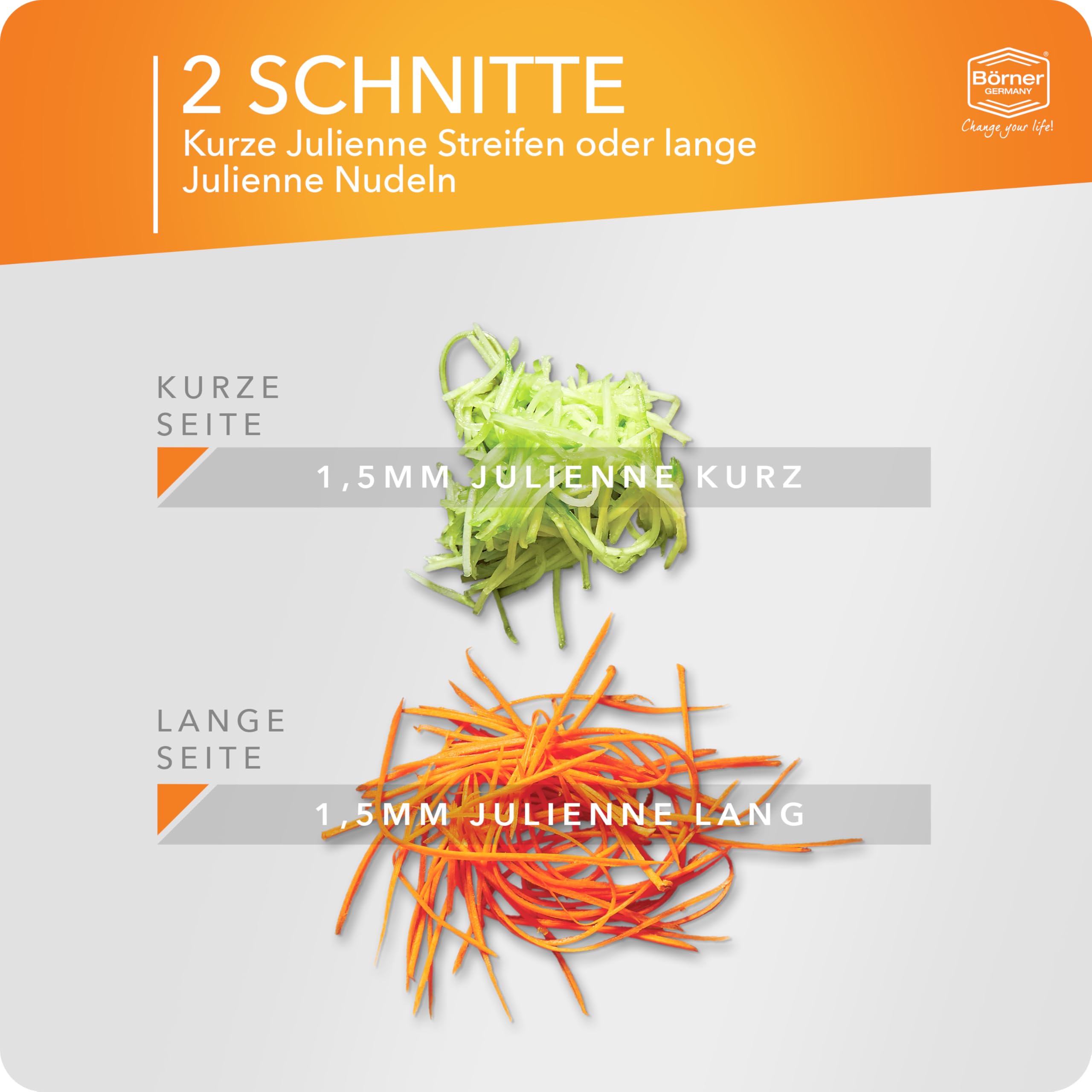 Börner Roko PowerLine Gemüseschneider • Streifenschneider für Obst & Gemüse • Julienne Schneider für feine Streifen • Gemüsehobel fein • Küchenhobel • Reibe (Orange)