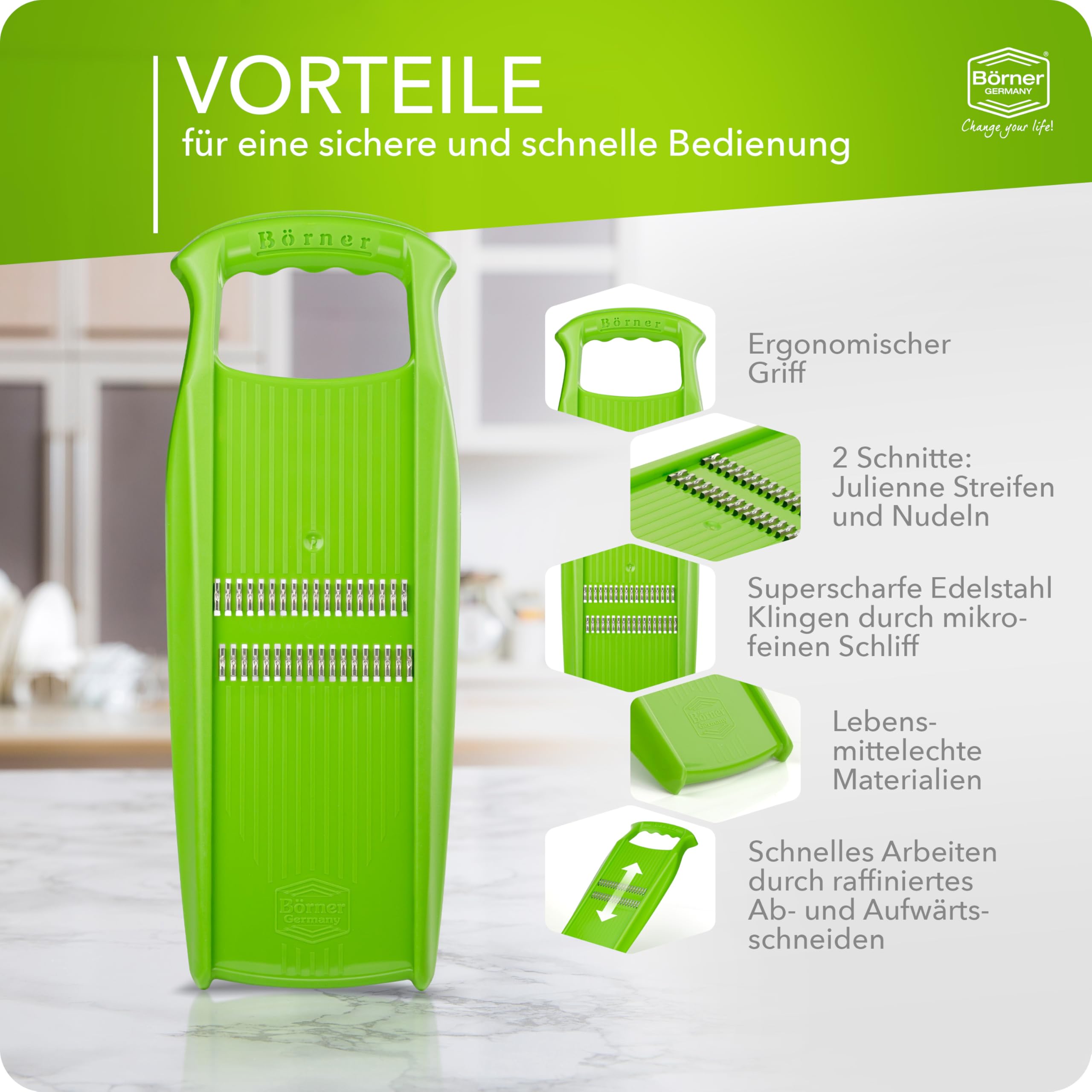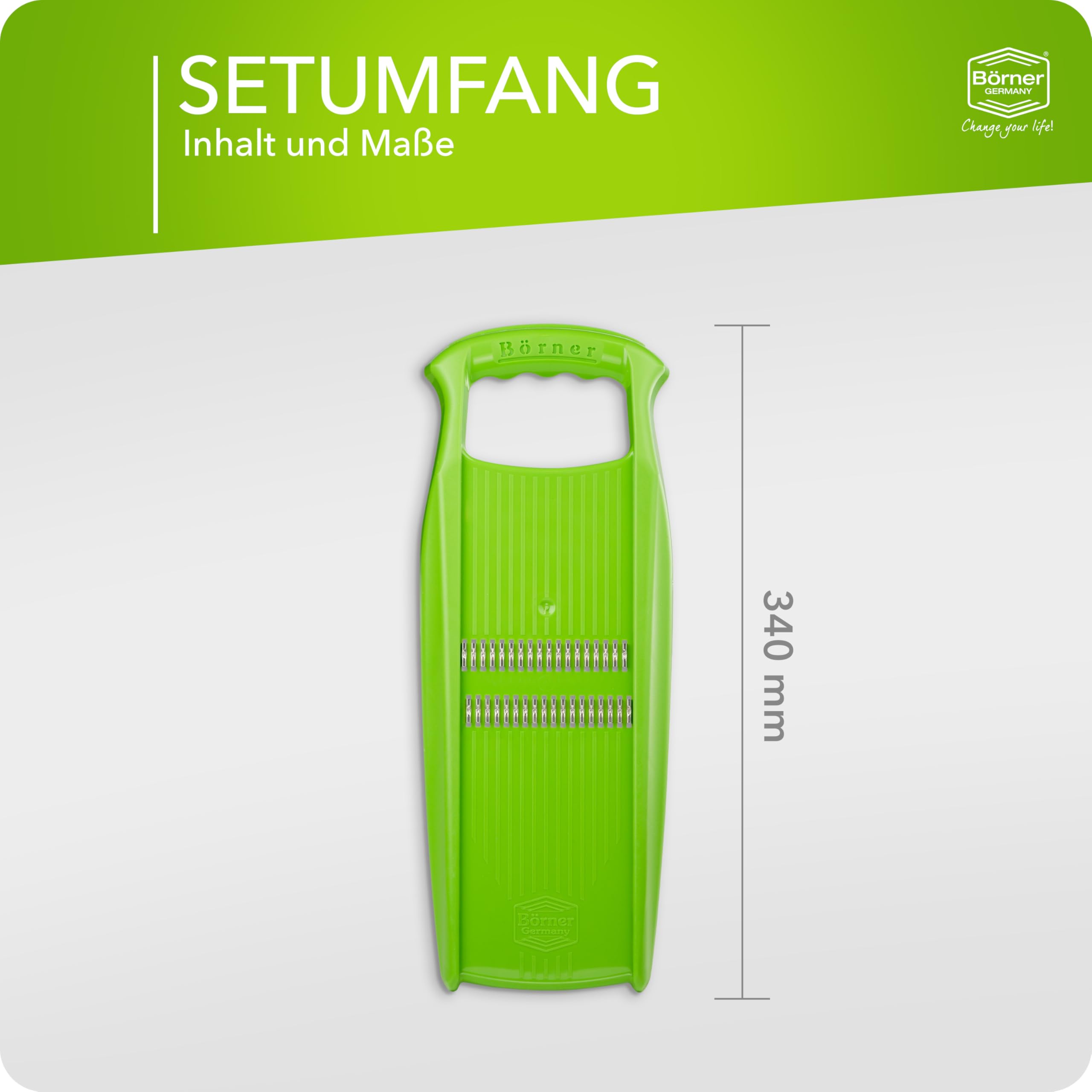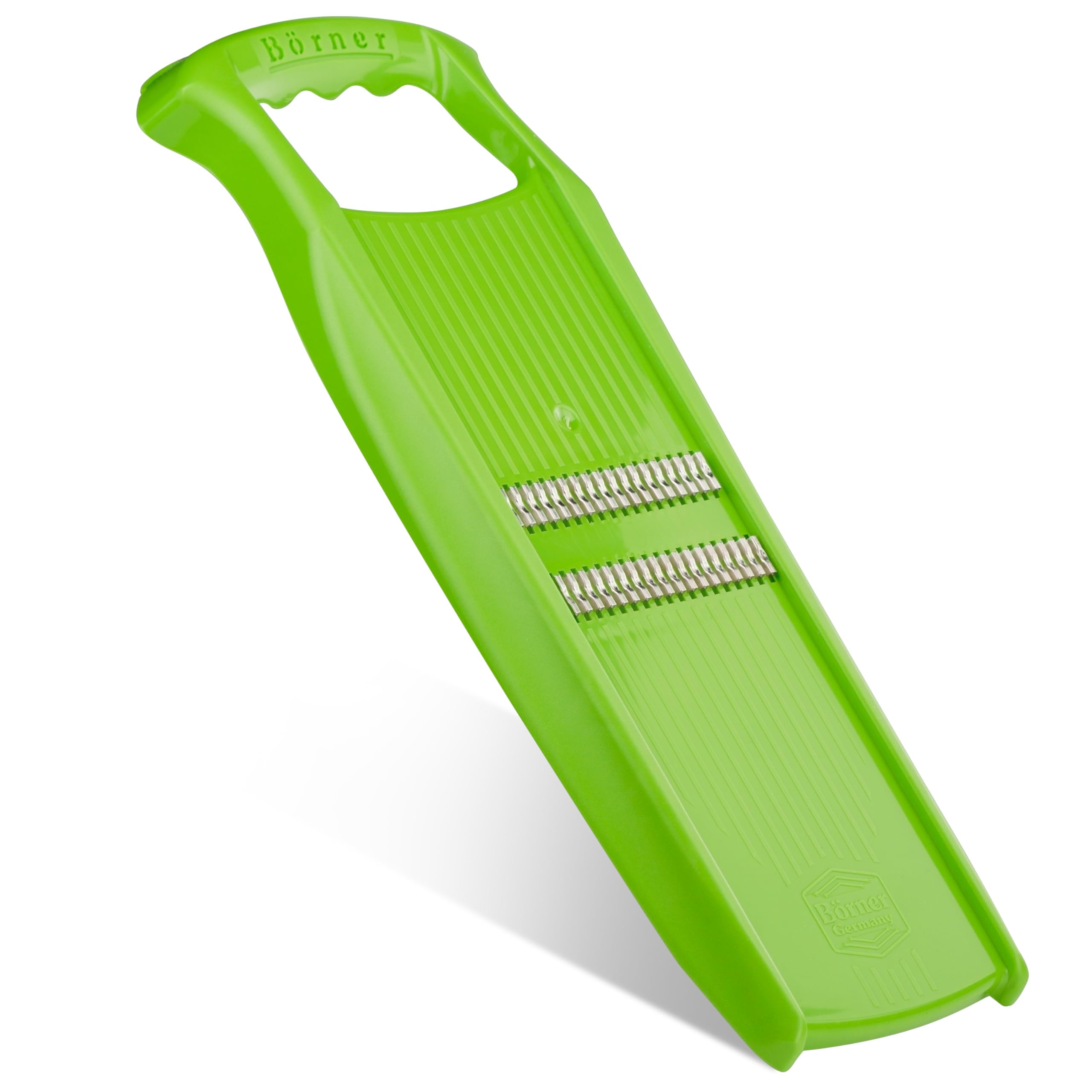 Börner Roko PowerLine Gemüseschneider • Streifenschneider für Obst & Gemüse • Julienne Schneider für feine Streifen • Gemüsehobel fein • Küchenhobel • Reibe (Grün)