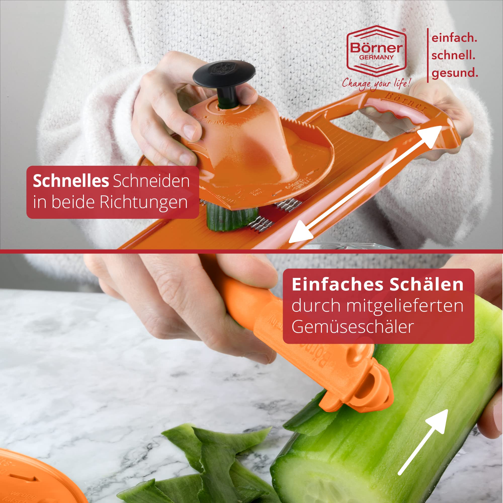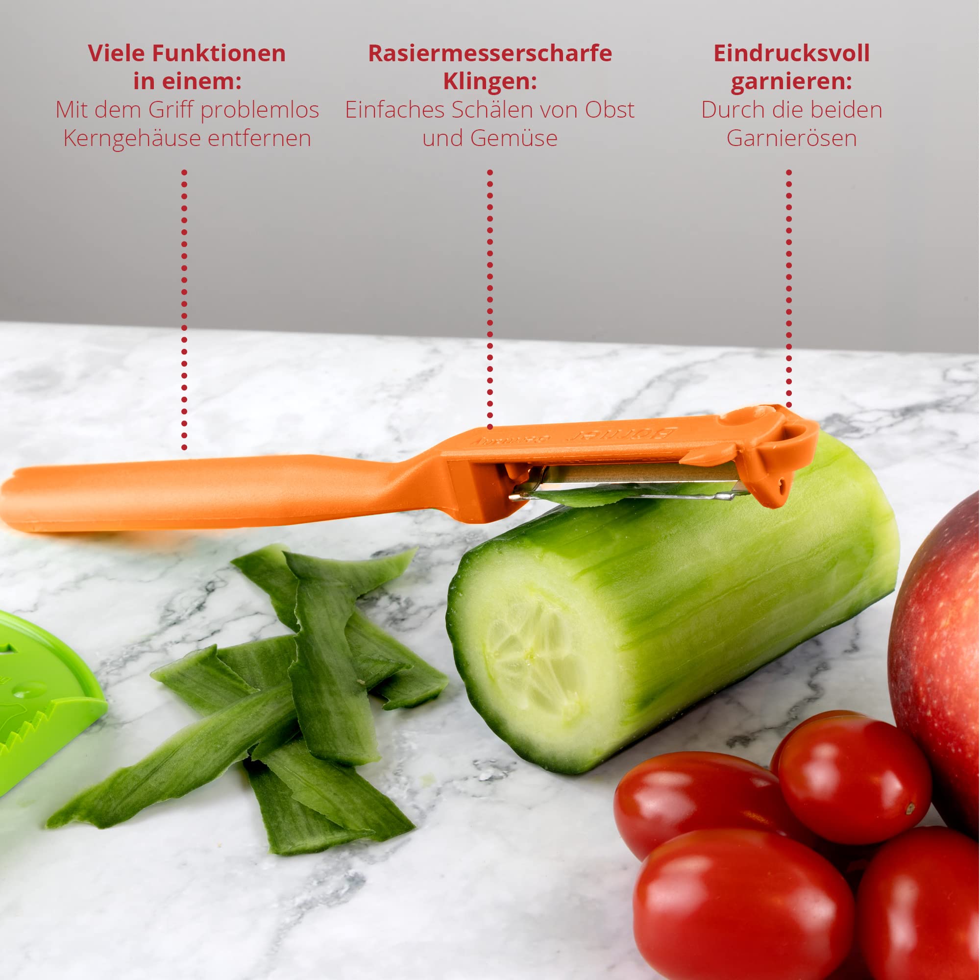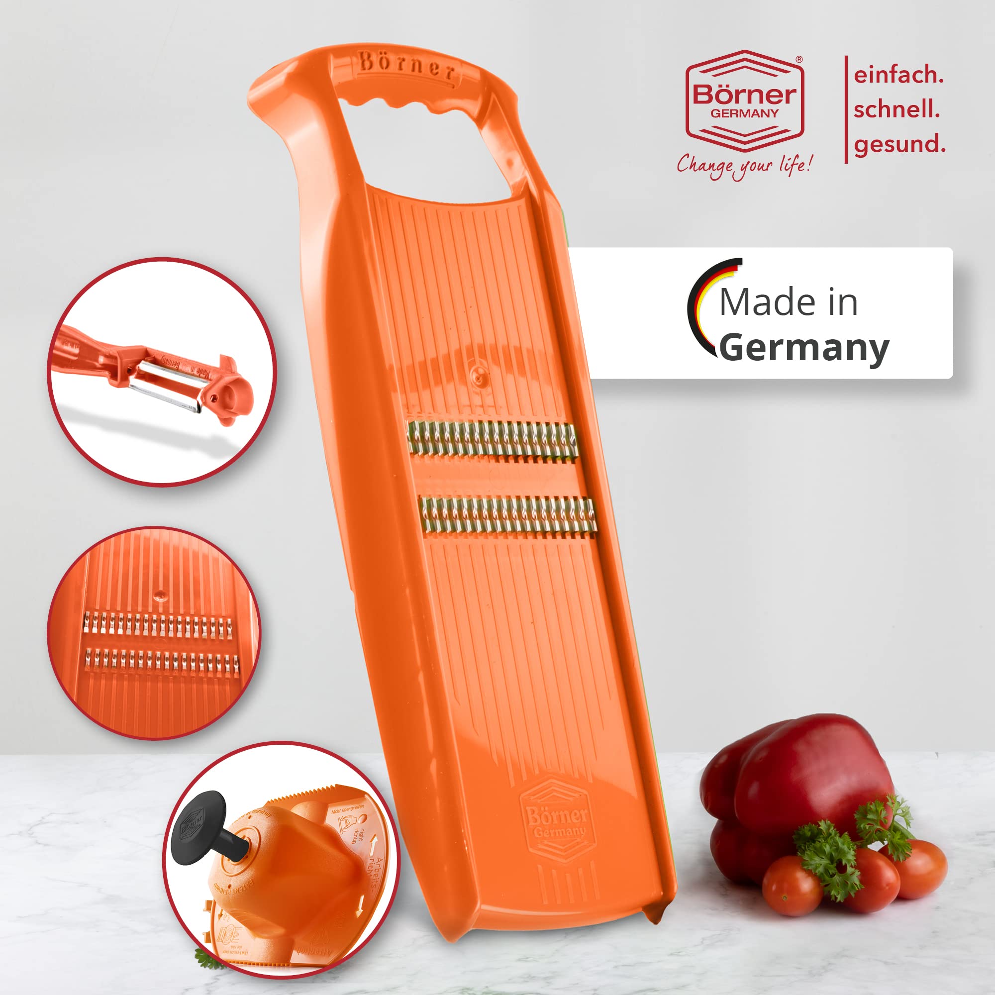 Börner Roko PowerLine Gemüseschneider Geschenk-Set (3-tlg.) • Feiner Streifenschneider für Obst & Gemüse + Fruchthalter + Kombischäler • Gemüsehobel • Küchenhobel Set • Farbe: Orange