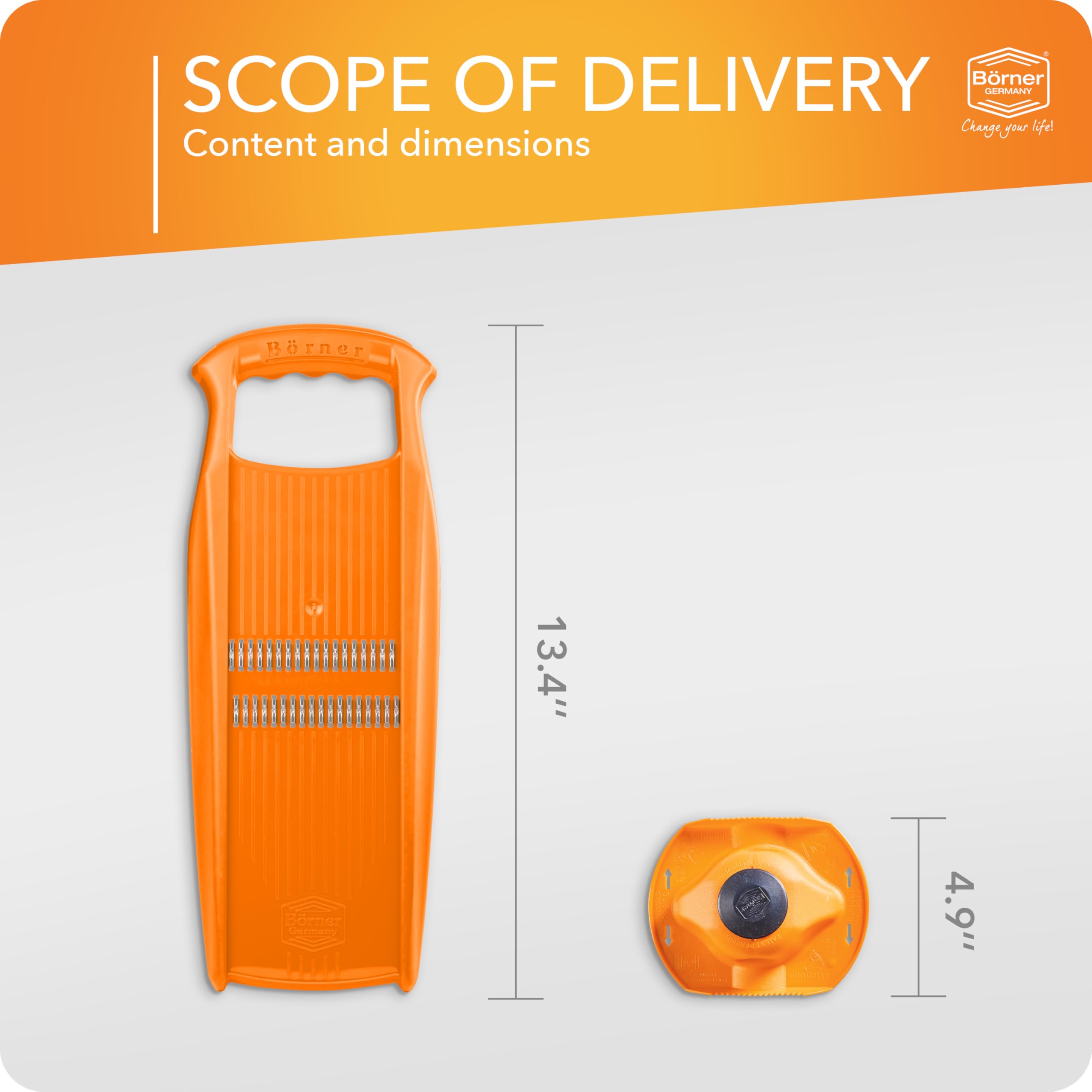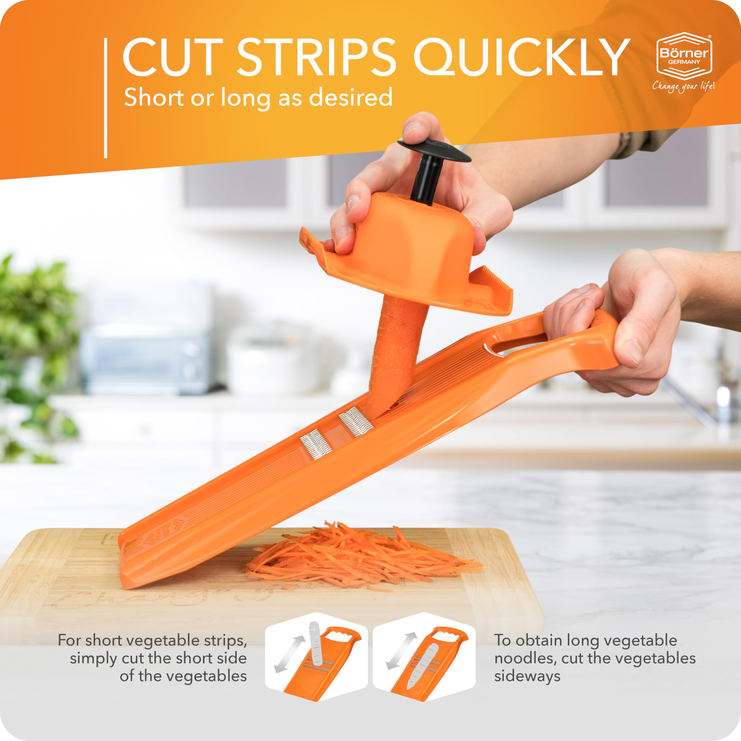 Börner Roko PowerLine Gemüseschneider Set mit Fruchthalter (2-tlg.) • Feiner Streifenschneider für Obst & Gemüse + Gemüsehalter • Julienne Schneider • Gemüsehobel Set • Farbe: Orange