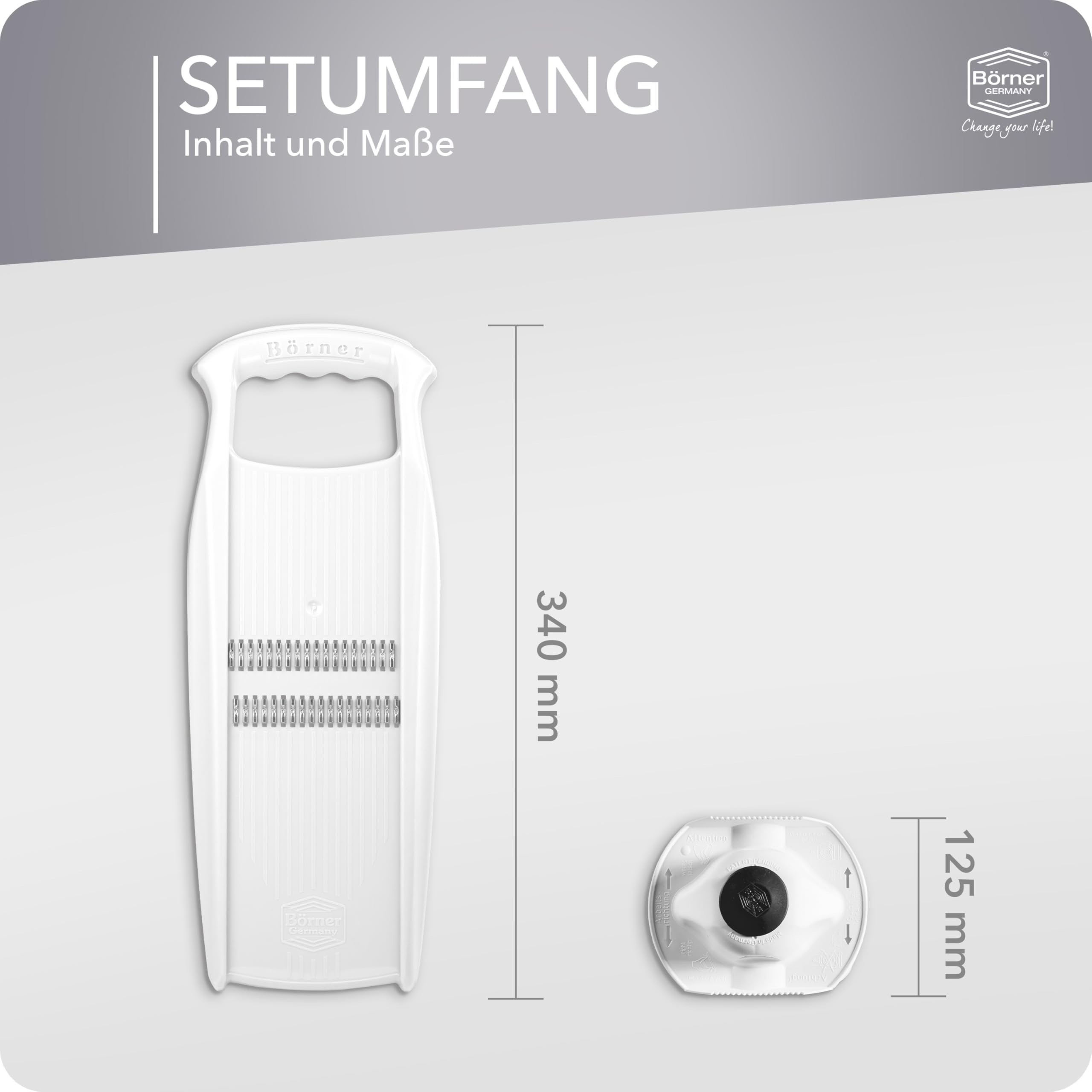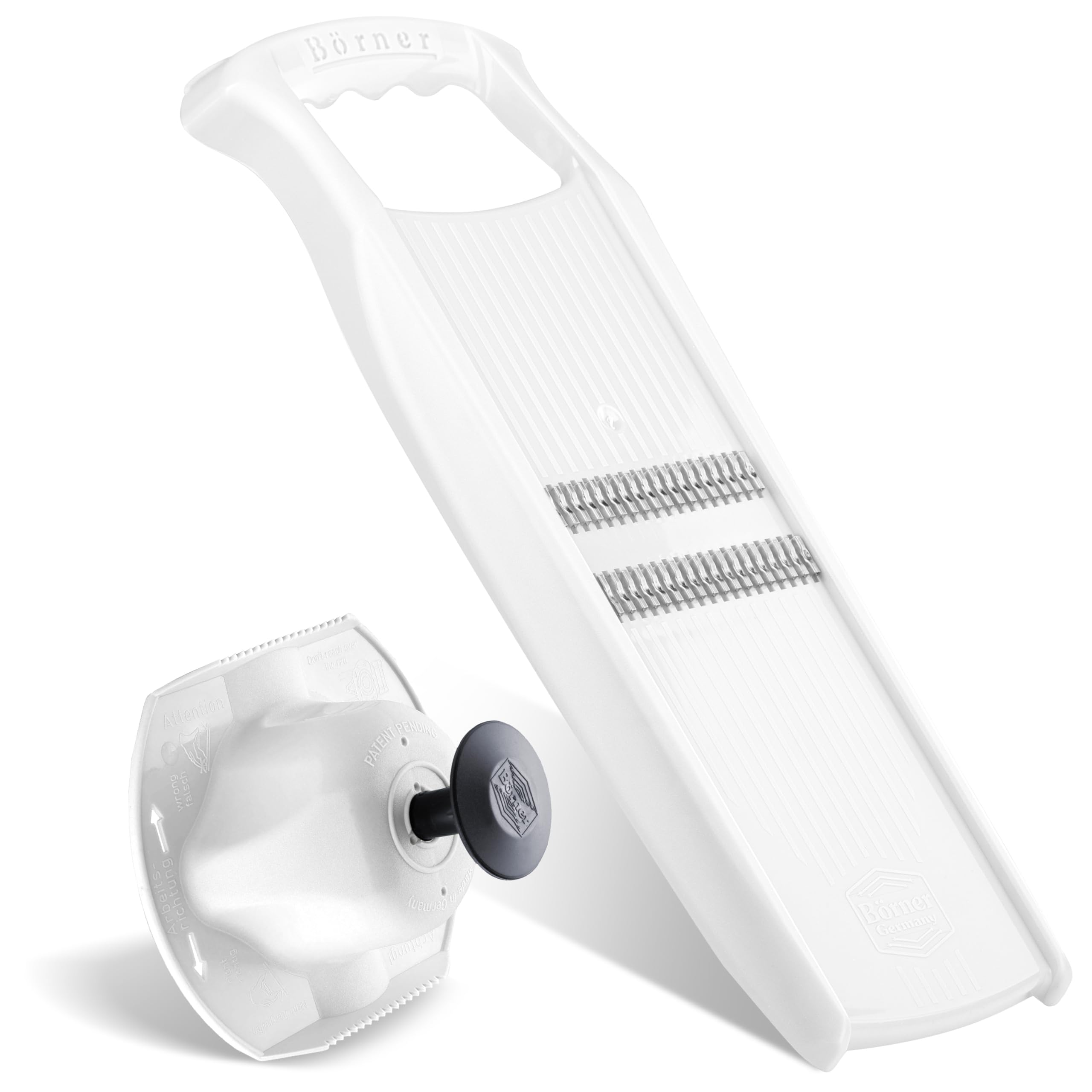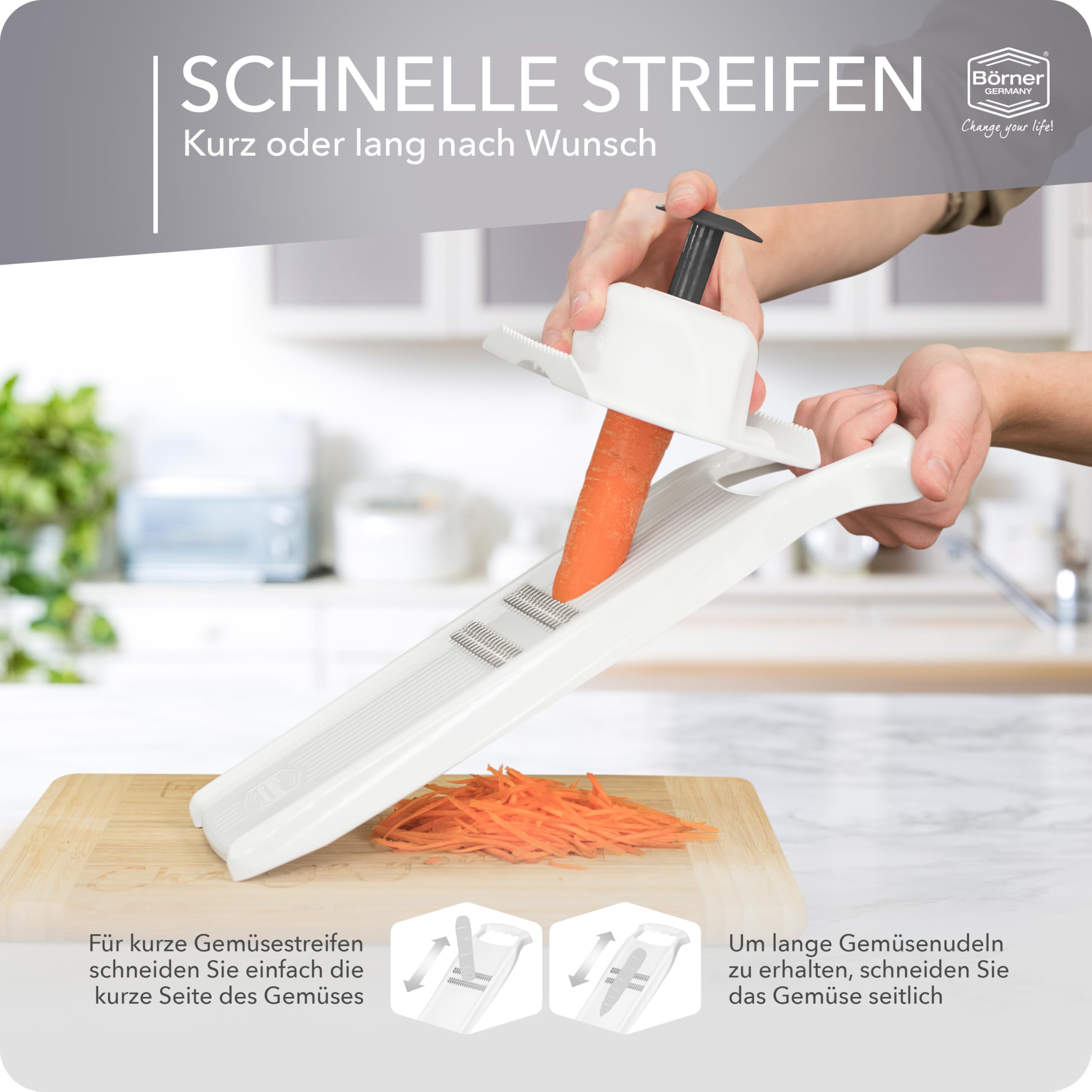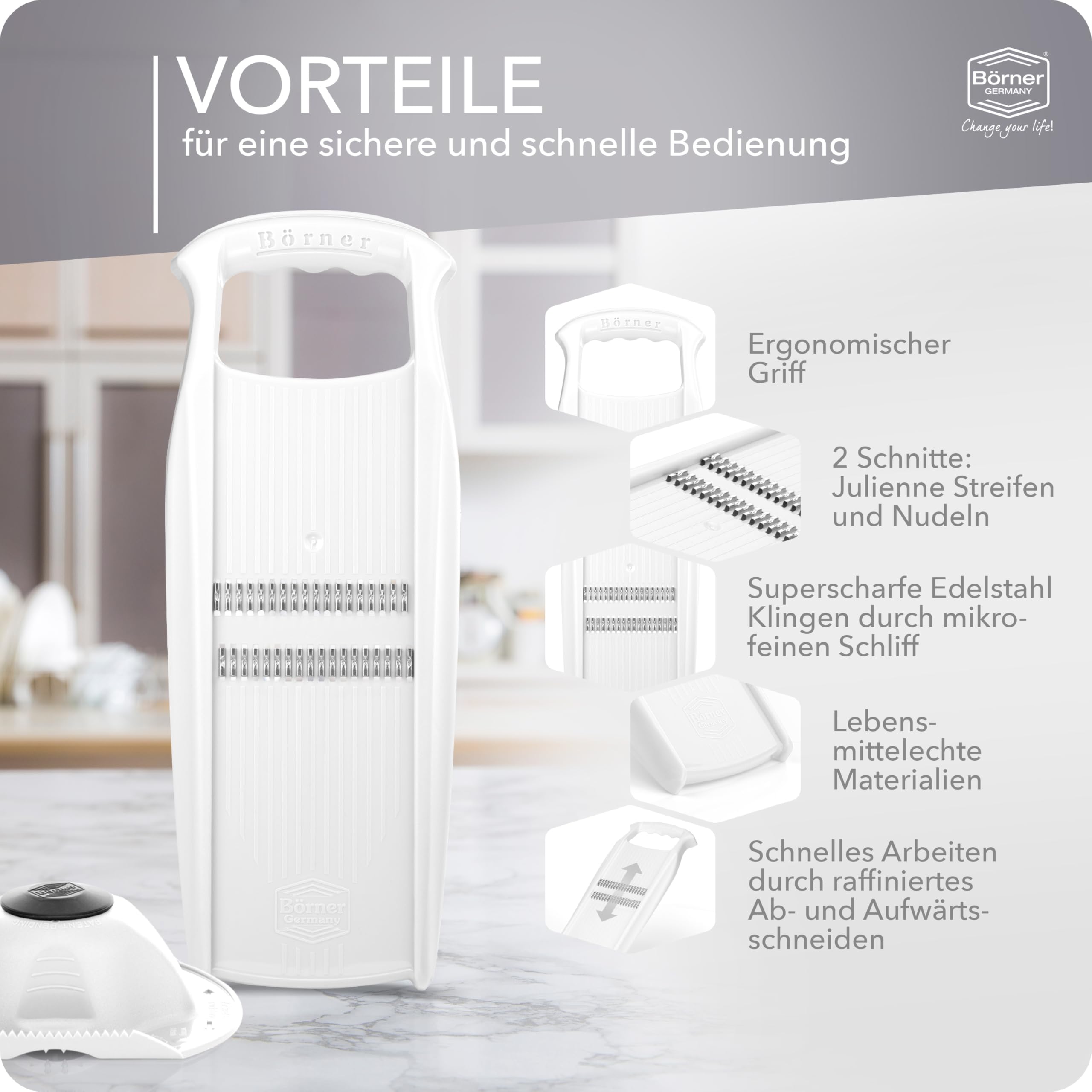 Börner Roko PowerLine Gemüseschneider Set mit Fruchthalter (2-tlg.) • Feiner Streifenschneider für Obst & Gemüse + Gemüsehalter • Julienne Schneider • Gemüsehobel Set • Farbe: Weiss